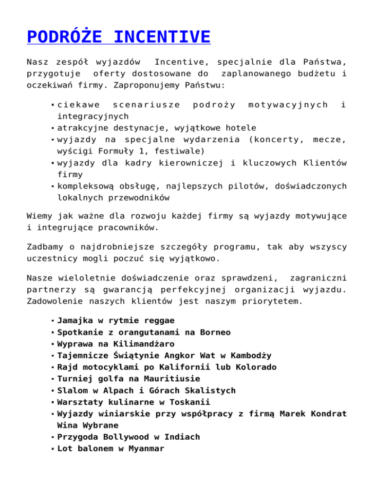 PODRÓŻE INCENTIVE Nasz zespół wyjazdów Incentive, specjalnie dla Państwa, przygotuje oferty dostosowane do zaplanowanego budżetu i oczekiwań firmy. Zaproponujemy Państwu: ciekawe scenariusze podroży motywacyjnych i integracyjnych atrakcyjne destynacje, wyjątkowe hotele wyjazdy na specjalne wydarzenia wyścigi Formuły 1, festiwale) (koncerty, mecze, wyjazdy dla kadry kierowniczej i kluczowych Klientów firmy kompleksową obsługę, najlepszych pilotów, doświadczonych lokalnych przewodników Wiemy jak ważne dla rozwoju każdej firmy są wyjazdy motywujące i integrujące pracowników. Zadbamy o najdrobniejsze szczegóły programu, tak aby wszyscy uczestnicy mogli poczuć się wyjątkowo. Nasze wieloletnie doświadczenie oraz sprawdzeni, zagraniczni partnerzy są gwarancją perfekcyjnej organizacji wyjazdu. Zadowolenie naszych klientów jest naszym priorytetem. Jamajka w rytmie reggae Spotkanie z orangutanami na Borneo Wyprawa na Kilimandżaro Tajemnicze Świątynie Angkor Wat w Kambodży Rajd motocyklami po Kalifornii lub Kolorado Turniej golfa na Mauritiusie Slalom w Alpach i Górach Skalistych Warsztaty kulinarne w Toskanii Wyjazdy winiarskie przy współpracy z firmą Marek Kondrat Wina Wybrane Przygoda Bollywood w Indiach Lot balonem w Myanmar Weekend w Barcelonie, Paryżu, Londynie, Amsterdamie, Wenecji czy Tibilisi Peru, Argentyna, Japonia, Kuba, Kostaryka, Uganda, Barbados – to tylko niektóre z propozycji, które możemy przygotować dla Państwa. Gwarantujemy profesjonalną obsługę, niezapomniane przeżycia i cudowne wspomnienia!