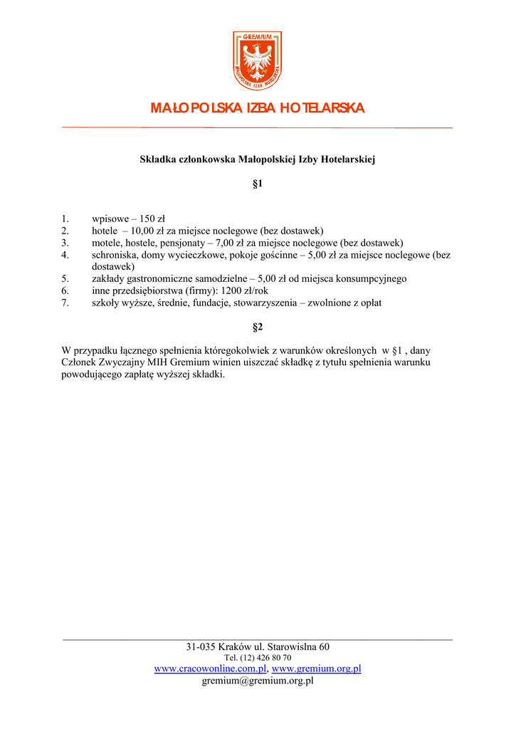 MALOPOLSKA IZBA HOTELARSKA Składka członkowska Małopolskiej Izby Hotelarskiej §1 1. 2. 3. 4. 5. 6. 7. wpisowe – 150 zł hotele – 10,00 zł za miejsce noclegowe (bez dostawek) motele, hostele, pensjonaty – 7,00 zł za miejsce noclegowe (bez dostawek) schroniska, domy wycieczkowe, pokoje gościnne – 5,00 zł za miejsce noclegowe (bez dostawek) zakłady gastronomiczne samodzielne – 5,00 zł od miejsca konsumpcyjnego inne przedsiębiorstwa (firmy): 1200 zł/rok szkoły wyższe, średnie, fundacje, stowarzyszenia – zwolnione z opłat §2 W przypadku łącznego spełnienia któregokolwiek z warunków określonych w §1 , dany Członek Zwyczajny MIH Gremium winien uiszczać składkę z tytułu spełnienia warunku powodującego zapłatę wyższej składki. ___________________________________________________________________________ 31-035 Kraków ul. Starowislna 60 Tel. (12) 426 80 70 www.cracowonline.com.pl, www.gremium.org.pl [email protected]