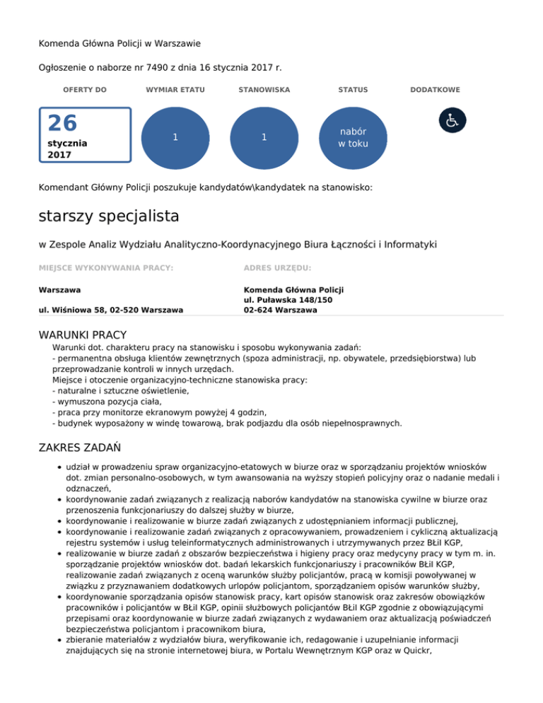 Komenda Główna Policji w Warszawie Ogłoszenie o naborze nr 7490 z dnia 16 stycznia 2017 r. OFERTY DO 26 stycznia 2017 WYMIAR ETATU STANOWISKA STATUS 1 1 nabór w toku DODATKOWE Komendant Główny Policji poszukuje kandydatów\kandydatek na stanowisko: starszy specjalista w Zespole Analiz Wydziału Analityczno-Koordynacyjnego Biura Łączności i Informatyki MIEJSCE WYKONYWANIA PRACY: ADRES URZĘDU: Warszawa Komenda Główna Policji ul. Puławska 148/150 02-624 Warszawa ul. Wiśniowa 58, 02-520 Warszawa WARUNKI PRACY Warunki dot. charakteru pracy na stanowisku i sposobu wykonywania zadań: - permanentna obsługa klientów zewnętrznych (spoza administracji, np. obywatele, przedsiębiorstwa) lub przeprowadzanie kontroli w innych urzędach. Miejsce i otoczenie organizacyjno-techniczne stanowiska pracy: - naturalne i sztuczne oświetlenie, - wymuszona pozycja ciała, - praca przy monitorze ekranowym powyżej 4 godzin, - budynek wyposażony w windę towarową, brak podjazdu dla osób niepełnosprawnych. ZAKRES ZADAŃ udział w prowadzeniu spraw organizacyjno-etatowych w biurze oraz w sporządzaniu projektów wniosków dot. zmian personalno-osobowych, w tym awansowania na wyższy stopień policyjny oraz o nadanie medali i odznaczeń, koordynowanie zadań związanych z realizacją naborów kandydatów na stanowiska cywilne w biurze oraz przenoszenia funkcjonariuszy do dalszej służby w biurze, koordynowanie i realizowanie w biurze zadań związanych z udostępnianiem informacji publicznej, koordynowanie i realizowanie zadań związanych z opracowywaniem, prowadzeniem i cykliczną aktualizacją rejestru systemów i usług teleinformatycznych administrowanych i utrzymywanych przez BŁiI KGP, realizowanie w biurze zadań z obszarów bezpieczeństwa i higieny pracy oraz medycyny pracy w tym m. in. sporządzanie projektów wniosków dot. badań lekarskich funkcjonariuszy i pracowników BŁiI KGP, realizowanie zadań związanych z oceną warunków służby policjantów, pracą w komisji powoływanej w związku z przyznawaniem dodatkowych urlopów policjantom, sporządzaniem opisów warunków służby, koordynowanie sporządzania opisów stanowisk pracy, kart opisów stanowisk oraz zakresów obowiązków pracowników i policjantów w BŁiI KGP, opinii służbowych policjantów BŁiI KGP zgodnie z obowiązującymi przepisami oraz koordynowanie w biurze zadań związanych z wydawaniem oraz aktualizacją poświadczeń bezpieczeństwa policjantom i pracownikom biura, zbieranie materiałów z wydziałów biura, weryfikowanie ich, redagowanie i uzupełnianie informacji znajdujących się na stronie internetowej biura, w Portalu Wewnętrznym KGP oraz w Quickr, uczestniczenie w pracach zespołu wewnętrznego wartościującego stanowiska pracy. WYMAGANIA NIEZBĘDNE Wykształcenie: wyższe o kierunku administracja i/lub zarządzanie kadrami, doświadczenie zawodowe: powyżej 3 lat doświadczenia na stanowiskach związanych ze stosowaniem w praktyce prawa pracy, dostęp do informacji niejawnych oznaczonych klauzulą „poufne” lub oświadczenie o wyrażeniu zgody na przeprowadzenie postępowania sprawdzającego, przeszkolenie z zakresu przepisów i tematyki związanej z dostępem do informacji publicznych potwierdzone udokumentowanym udziałem w seminarium/forum/warsztatach/szkoleniu etc., znajomość języka angielskiego na poziomie komunikatywnym, umiejętność organizacji pracy własnej, umiejętność interpretacji przepisów, umiejętność analitycznego myślenia, umiejętność syntezy, umiejętność pracy w zespole, znajomość ustawy o Policji, ustawy o służbie cywilnej, ustawy o dostępie do informacji publicznej oraz ustawy Kodeks pracy, komunikatywność, kreatywność, Posiadanie obywatelstwa polskiego Korzystanie z pełni praw publicznych Nieskazanie prawomocnym wyrokiem za umyślne przestępstwo lub umyślne przestępstwo skarbowe DOKUMENTY I OŚWIADCZENIA NIEZBĘDNE Życiorys/CV i list motywacyjny Kopie dokumentów potwierdzających spełnienie wymagania niezbędnego w zakresie wykształcenia Kopie dokumentów potwierdzających spełnienie wymagania niezbędnego w zakresie doświadczenia zawodowego / stażu pracy kopia poświadczenia bezpieczeństwa uprawniającego do dostępu do informacji niejawnych oznaczonych klauzulą " poufne" lub oświadczenie o wyrażeniu zgody na przeprowadzenie postępowania sprawdzającego zgodnie z ustawą z dnia 5 sierpnia 2010 r. o ochronie informacji niejawnych (Dz. U. Nr 182, poz. 1228 ze zm.), kopie dokumentów potwierdzających spełnienie wymagania niezbędnego w zakresie przeszkolenia. Oświadczenie o posiadaniu obywatelstwa polskiego albo kopia dokumentu potwierdzającego posiadanie polskiego obywatelstwa Oświadczenie o wyrażeniu zgody na przetwarzanie danych osobowych do celów naboru Oświadczenie o korzystaniu z pełni praw publicznych Oświadczenie o nieskazaniu prawomocnym wyrokiem za umyślne przestępstwo lub umyślne przestępstwo skarbowe DOKUMENTY I OŚWIADCZENIA DODATKOWE kopia dokumentu potwierdzającego niepełnosprawność - w przypadku kandydatek/kandydatów, zamierzających skorzystać z pierwszeństwa w zatrudnieniu w przypadku, gdy znajdą się w gronie najlepszych kandydatek/kandydatów TERMINY I MIEJSCE SKŁADANIA DOKUMENTÓW Dokumenty należy złożyć do: 26 stycznia 2017 r. Decyduje data: stempla pocztowego / osobistego dostarczenia oferty do urzędu Miejsce składania dokumentów: Komenda Główna Policji Biuro Kadr, Szkolenia i Obsługi Prawnej Wydział Rozwoju Zasobów Ludzkich ul. Puławska 148/150 02-514 UP Warszawa 12 z dopiskiem w liście motywacyjnym „starszy specjalista/BŁiI-WAK/BKGP 2/17” INNE INFORMACJE: W miesiącu poprzedzającym datę upublicznienia ogłoszenia wskaźnik zatrudnienia osób niepełnosprawnych w urzędzie, w rozumieniu przepisów o rehabilitacji zawodowej i społecznej oraz zatrudnianiu osób niepełnosprawnych, nie wynosi co najmniej 6%. Planowane rozpoczęcie pracy – w ciągu około 3 mi