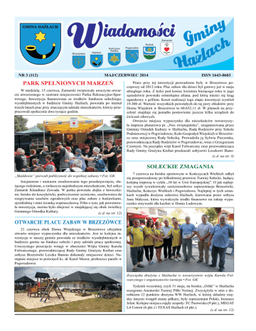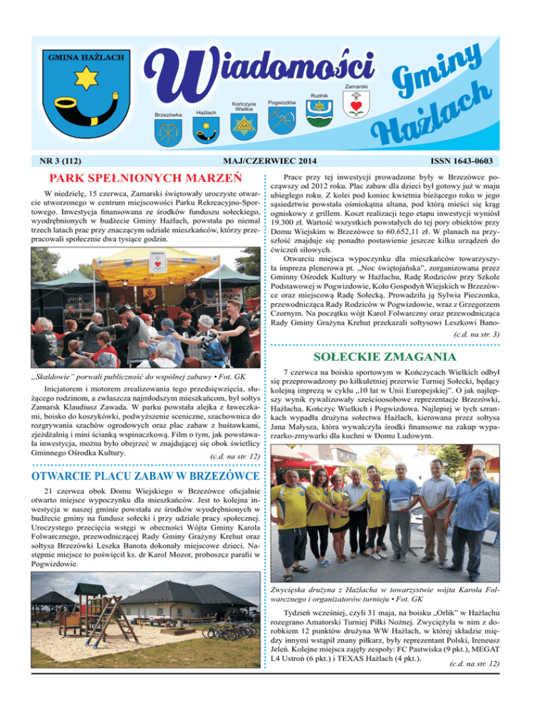 Wiadomości Gminy Hażlach, maj/czerwiec 2014 Nr 3 (112) 1 MAJ/czerwiec 2014 PARK SPEŁNIONYCH MARZEŃ W niedzielę, 15 czerwca, Zamarski świętowały uroczyste otwarcie utworzonego w centrum miejscowości Parku Rekreacyjno-Sportowego. Inwestycja finansowana ze środków funduszu sołeckiego, wyodrębnionych w budżecie Gminy Hażlach, powstała po niemal trzech latach prac przy znaczącym udziale mieszkańców, którzy przepracowali społecznie dwa tysiące godzin. ISSN 1643-0603 Prace przy tej inwestycji prowadzone były w Brzezówce począwszy od 2012 roku. Plac zabaw dla dzieci był gotowy już w maju ubiegłego roku. Z kolei pod koniec kwietnia bieżącego roku w jego sąsiedztwie powstała ośmiokątna altana, pod którą mieści się krąg ogniskowy z grillem. Koszt realizacji tego etapu inwestycji wyniósł 19.300 zł. Wartość wszystkich powstałych do tej pory obiektów przy Domu Wiejskim w Brzezówce to 60.652,11 zł. W planach na przyszłość znajduje się ponadto postawienie jeszcze kilku urządzeń do ćwiczeń siłowych. Otwarciu miejsca wypoczynku dla mieszkańców towarzyszyła impreza plenerowa pt. „Noc świętojańska”, zorganizowana przez Gminny Ośrodek Kultury w Hażlachu, Radę Rodziców przy Szkole Podstawowej w Pogwizdowie, Koło Gospodyń Wiejskich w Brzezówce oraz miejscową Radę Sołecką. Prowadziła ją Sylwia Pieczonka, przewodnicząca Rady Rodziców w Pogwizdowie, wraz z Grzegorzem Czornym. Na początku wójt Karol Folwarczny oraz przewodnicząca Rady Gminy Grażyna Krehut przekazali sołtysowi Leszkowi Bano(c.d. na str. 3) SOŁECKIE ZMAGANIA „Skaldowie” porwali publiczność do wspólnej zabawy • Fot. GK Inicjatorem i motorem zrealizowania tego przedsięwzięcia, służącego rodzinom, a zwłaszcza najmłodszym mieszkańcom, był sołtys Zamarsk Klaudiusz Zawada. W parku powstała alejka z ławeczkami, boisko do koszykówki, podwyższenie sceniczne, szachownica do rozgrywania szachów ogrodowych oraz plac zabaw z huśtawkami, zjeżdżalnią i mini ścianką wspinaczkową. Film o tym, jak powstawała inwestycja, można było obejrzeć w znajdującej się obok świetlicy Gminnego Ośrodka Kultury. (c.d. na str. 12) 7 czerwca na boisku sportowym w Kończycach Wielkich odbył się przeprowadzony po kilkuletniej przerwie Turniej Sołecki, będący kolejną imprezą w cyklu „10 lat w Unii Europejskiej”. O jak najlepszy wynik rywalizowały sześcioosobowe reprezentacje Brzezówki, Hażlacha, Kończyc Wielkich i Pogwizdowa. Najlepiej w tych szrankach wypadła drużyna sołectwa Hażlach, kierowana przez sołtysa Jana Małysza, która wywalczyła środki finansowe na zakup wyparzarko-zmywarki dla kuchni w Domu Ludowym. OTWARCIE PLACU ZABAW w Brzezówce 21 czerwca obok Domu Wiejskiego w Brzezówce oficjalnie otwarto miejsce wypoczynku dla mieszkańców. Jest to kolejna inwestycja w naszej gminie powstała ze środków wyodrębnionych w budżecie gminy na fundusz sołecki i przy udziale pracy społecznej. Uroczystego przecięcia wstęgi w obecności Wójta Gminy Karola Folwarcznego, przewodniczącej Rady Gminy Grażyny Krehut oraz sołtysa Brzezówki Leszka Banota dokonały miejscowe dzieci. Następnie miejsce to poświęcił ks. dr Karol Mozor, proboszcz parafii w Pogwizdowie. Zwycięska drużyna z Hażlacha w towarzystwie wójta Karola Folwarcznego i organizatorów turnieju • Fot. GK Tydzień wcześniej, czyli 31 maja, na boisku „Orlik” w Hażlachu rozegrano Amatorski Turniej Piłki Nożnej. Zwyciężyła w nim z dorobkiem 12 punktów drużyna WW Hażlach, w której składzie między innymi wstąpił znany piłkarz, były reprezentant Polski, Ireneusz Jeleń. Kolejne miejsca zajęły zespoły: FC Pastwiska (9 pkt.), MEGAT L4 Ustroń (6 pkt.) i TEXAS Hażlach (4 pkt.). (c.d. na str. 12) 2 2 Wiadomości Gminy Hażlach, maj/czerwiec 2014 PODSUMOWANIE PROJEKTÓW JĘZYKOWYCH „Czeski od deski do deski” KONFERENCJE EDUKACYJNE 28 maja 2014 roku w Gminnym Ośrodku w Hażlachu 31 stycznia br. w Gminnym Ośrodku KulturyKultury w Hażlachu odbyły odbyła się konferencja podsumowująca projekt „Czeski od deski do się konferencje edukacyjne rozpoczynające projekty „Edukacja przez deski”. Projekt współfinansowany ze środków Unii spotkała Europejskiej, całe życie” orazbył „Czeski od deski do deski”. Inicjatywa się z w ramach Europejskiego Funduszu Społecznego. ogromnym zainteresowaniem mieszkańców gminy Hażlach. Łącznie Projekt realizowany przez Stowarzyszenie w obu spotkaniach uczestniczyło ponad 120 osób.„Lutnia” w Zamarskach obejmowałprowadził bezpłatneprezes kursy Stowarzyszenia języka czeskiego, warsztaty eduKonferencje „Lutnia” Przemykacyjne oraz oraz warsztaty komputerowe. projekcie wzięło udział 34 sław Żebrok koordynator projektu W Błażej Żebrok. W spotkaniach mieszkańców gminy przedstawiciele Hażlach. Wszyscy otrzymali uczestniczyli również władz oni Gminy Hażlach:certyfikaty Sekretarz ukończenia kursów, któreprzewodnicząca wręczyli: WójtRady Gminy Karol Folwarczny, Gminy Wanda Sojka oraz Gminy Grażyna Krehut. przewodnicząca Gminy Grażyna Krehut oraz Podczas prezes StowarzyGospodarzem byłRady dyrektor GOK Wojciech Kasztura. konferenszenia „Lutnia” Żebrok. Uczestnicy projektu uzyskali cji powołano KlubPrzemysław Edukacji, który wspierał będzie swoich członków w także 157kariery zaświadczeń ukończenia kursówinicjatywach w Centrum Kształcenia na rozwoju zawodowej i we wszelkich edukacyjnych. 2Odległość na „Czeski Wsiach. od deski do deski” oraz „Edukacja przez całe Projekty * * Europejskiej w ramach życie”, współfinansowane *są ze środków Unii Europejskiego Funduszu Społecznego. Zaplanowano w nich darmowe kursy języka czeskiego i angielskiego dla mieszkańców gminy. Dodatkowo każdy z uczestników będzie mógł skorzystać z bezpłatnego kursu komputerowego oraz warsztatów edukacyjnych. „Edukacja przez całe życie” Stowarzyszenie 