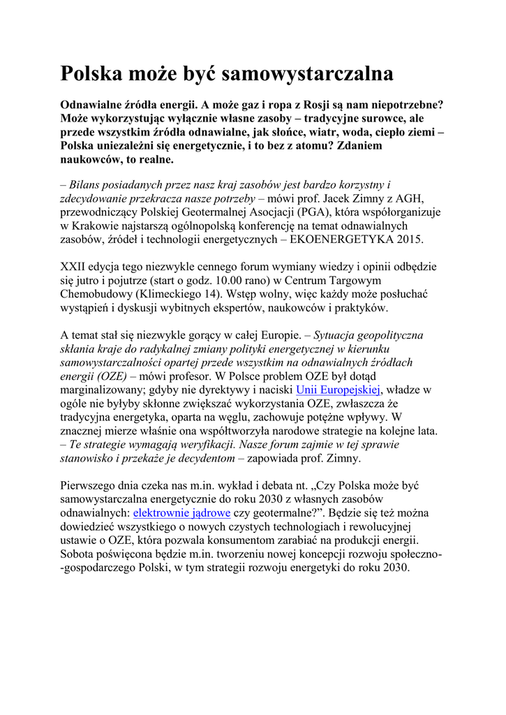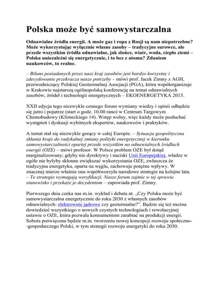 Polska może być samowystarczalna Odnawialne źródła energii. A może gaz i ropa z Rosji są nam niepotrzebne? Może wykorzystując wyłącznie własne zasoby – tradycyjne surowce, ale przede wszystkim źródła odnawialne, jak słońce, wiatr, woda, ciepło ziemi – Polska uniezależni się energetycznie, i to bez z atomu? Zdaniem naukowców, to realne. – Bilans posiadanych przez nasz kraj zasobów jest bardzo korzystny i zdecydowanie przekracza nasze potrzeby – mówi prof. Jacek Zimny z AGH, przewodniczący Polskiej Geotermalnej Asocjacji (PGA), która współorganizuje w Krakowie najstarszą ogólnopolską konferencję na temat odnawialnych zasobów, źródeł i technologii energetycznych – EKOENERGETYKA 2015. XXII edycja tego niezwykle cennego forum wymiany wiedzy i opinii odbędzie się jutro i pojutrze (start o godz. 10.00 rano) w Centrum Targowym Chemobudowy (Klimeckiego 14). Wstęp wolny, więc każdy może posłuchać wystąpień i dyskusji wybitnych ekspertów, naukowców i praktyków. A temat stał się niezwykle gorący w całej Europie. – Sytuacja geopolityczna skłania kraje do radykalnej zmiany polityki energetycznej w kierunku samowystarczalności opartej przede wszystkim na odnawialnych źródłach energii (OZE) – mówi profesor. W Polsce problem OZE był dotąd marginalizowany; gdyby nie dyrektywy i naciski Unii Europejskiej, władze w ogóle nie byłyby skłonne zwiększać wykorzystania OZE, zwłaszcza że tradycyjna energetyka, oparta na węglu, zachowuje potężne wpływy. W znacznej mierze właśnie ona współtworzyła narodowe strategie na kolejne lata. – Te strategie wymagają weryfikacji. Nasze forum zajmie w tej sprawie stanowisko i przekaże je decydentom – zapowiada prof. Zimny. Pierwszego dnia czeka nas m.in. wykład i debata nt. „Czy Polska może być samowystarczalna energetycznie do roku 2030 z własnych zasobów odnawialnych: elektrownie jądrowe czy geotermalne?”. Będzie się też można dowiedzieć wszystkiego o nowych czystych technologiach i rewolucyjnej ustawie o OZE, która pozwala konsumentom zarabiać na produkcji energii. Sobota poświęcona będzie m.in. tworzeniu nowej koncepcji rozwoju społeczno-gospodarczego Polski, w tym strategii rozwoju energetyki do roku 2030.