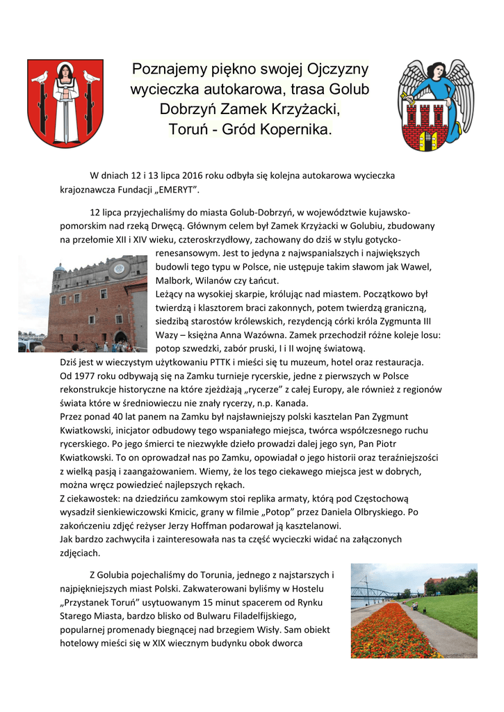 Poznajemy piękno swojej Ojczyzny wycieczka autokarowa, trasa Golub Dobrzyń Zamek Krzyżacki, Toruń - Gród Kopernika. W dniach 12 i 13 lipca 2016 roku odbyła się kolejna autokarowa wycieczka krajoznawcza Fundacji „EMERYT”. 12 lipca przyjechaliśmy do miasta Golub-Dobrzyń, w województwie kujawskopomorskim nad rzeką Drwęcą. Głównym celem był Zamek Krzyżacki w Golubiu, zbudowany na przełomie XII i XIV wieku, czteroskrzydłowy, zachowany do dziś w stylu gotyckorenesansowym. Jest to jedyna z najwspanialszych i największych budowli tego typu w Polsce, nie ustępuje takim sławom jak Wawel, Malbork, Wilanów czy Łańcut. Leżący na wysokiej skarpie, królując nad miastem. Początkowo był twierdzą i klasztorem braci zakonnych, potem twierdzą graniczną, siedzibą starostów królewskich, rezydencją córki króla Zygmunta III Wazy – księżna Anna Wazówna. Zamek przechodził różne koleje losu: potop szwedzki, zabór pruski, I i II wojnę światową. Dziś jest w wieczystym użytkowaniu PTTK i mieści się tu muzeum, hotel oraz restauracja. Od 1977 roku odbywają się na Zamku turnieje rycerskie, jedne z pierwszych w Polsce rekonstrukcje historyczne na które zjeżdżają „rycerze” z całej Europy, ale również z regionów świata które w średniowieczu nie znały rycerzy, n.p. Kanada. Przez ponad 40 lat panem na Zamku był najsławniejszy polski kasztelan Pan Zygmunt Kwiatkowski, inicjator odbudowy tego wspaniałego miejsca, twórca współczesnego ruchu rycerskiego. Po jego śmierci te niezwykłe dzieło prowadzi dalej jego syn, Pan Piotr Kwiatkowski. To on oprowadzał nas po Zamku, opowiadał o jego historii oraz teraźniejszości z wielką pasją i zaangażowaniem. Wiemy, że los tego ciekawego miejsca jest w dobrych, można wręcz powiedzieć najlepszych rękach. Z ciekawostek: na dziedzińcu zamkowym stoi replika armaty, którą pod Częstochową wysadził sienkiewiczowski Kmicic, grany w filmie „Potop” przez Daniela Olbryskiego. Po zakończeniu zdjęć reżyser Jerzy Hoffman podarował ją kasztelanowi. Jak bardzo zachwyciła i zainteresowała nas ta część wycieczki widać na załączonych zdjęciach. Z Golubia pojechaliśmy do Torunia, jednego z najstarszych i najpiękniejszych miast Polski. Zakwaterowani byliśmy w Hostelu „Przystanek Toruń” usytuowanym 15 minut spacerem od Rynku Starego Miasta, bardzo blisko od Bulwaru Filadelfijskiego, popularnej promenady biegnącej nad brzegiem Wisły. Sam obiekt hotelowy mieści się w XIX wiecznym budynku obok dworca kolejowego Toruń Miasto i przystrojony jest akcesoriami „kolejowo-dworcowymi”. W nocy, dodatkową atrakcją dla tych co nie mogą zasnąć był stukot przejeżdżających pociągów. Po objedzie (dzień pierwszy) pojechaliśmy na zwiedzanie toruńskiej starówki, oprowadzani przez sympatyczną i ciekawie opowiadającą o zabytkach panią przewodnik. Trzeba tu przypomnieć, że Starówka Toruńska wpisana jest na Listę Światowego Dziedzictwa Kulturowego UNESCO. Potem obejrzeliśmy Kościół – świątynię p.w. Maryi Gwiazdy Nowej Ewangelizacji i św. Jana Pawła II, który powstał z inicjatywy o. Tadeusza Rydzyka i Zgromadzenie Redemptorystów, z datków wiernych jako wotum wdzięczności za pontyfikat papieża Jana Pawła II. Obiekt imponuje wielkością (może pomieścić 3 tysiące wiernych) i wystrojem. Następnego dnia ciąg dalszy zwiedzania z przewodnikiem Starego i Nowego Miasta. Obejrzeliśmy Ratusz Staromiejski, Dom Mikołaja Kopernika, Krzywą Wieżę, ruiny Zamku Krzyżackiego, Muzeum Piernika i wiele innych pięknych zabytków. Ale największą frajdę mieliśmy z wizyty w dawnej Fabryce Pierników Gustawa Wessego, dziś Muzeum na toruńskiej starówce. Fabryka powstała w 1763 roku, a pierniki Wessego wysyłano nawet do Afryki. Najpierw zaproszono nas, aby samodzielnie, przy wielkim drewnianym stole, wyrobić z piernikowego ciasta swojego własnego piernika. Trzeba było wyrobić ciasto sporządzone według starej receptury przy pomocy wałka, a następnie przy pomocy pędzli, kozików i drewnianych form wykonać własną piernikową figurkę. Kiedy formy trafiły do pieca, zaproszono nas do zwiedzania Muzeum oraz kilku wystaw i całej maszynerii fabryki. Jedną z najciekawszych była ekspozycja „Piernikowe korzenie – od formy do pieca” umieszczona w piwnicy fabryki. Poznaliśmy też samego Gustawa Wessego, który przemówił do nas (za pomocą znanego aktora) i zachęcał do zwiedzania jego piernikowego królestwa. Kiedy nasze pierniki wyszły z pieca, podarowano nam je (były jeszcze bardzo ciepłe) na pamiątkę pobytu w tym słodkim królestwie, w którym historia ma smak i zapach. Po obiedzie nadszedł czas pożegnać piękny Toruń i udać się w drogę powrotną do Warszawy. Wracaliśmy w doskonałych humorach bo i pogoda dopisała, pełni dobrych wspomnień, nowej wiedzy, zawartych lub pogłębionych w trakcie wycieczki przyjaźni i solennie obiecując sobie w przyszłości kolejne wyjazdy w celu poznania piękna naszej ojczyzny. Podziękowania należą się Firmie, która nas przewoziła czyli Instytutowi Problemów Jądrowych – Zakład Transportu Samochodowego ŚWIERK, z której usług korzystamy od 24 lat! Po mistrzowsku i bezpiecznie dowiózł nas na każde miejsce Pan Andrzej Markiewicz. Mamy nadzieję, że w przyszłym roku, gdy będziemy obchodzić 25 lecie istnienia Fundacji „EMERYT” (1992-2017r.) zorganizujemy równie udaną lub jeszcze bardziej wycieczkę krajoznawczą. Toruń - Widokówka
