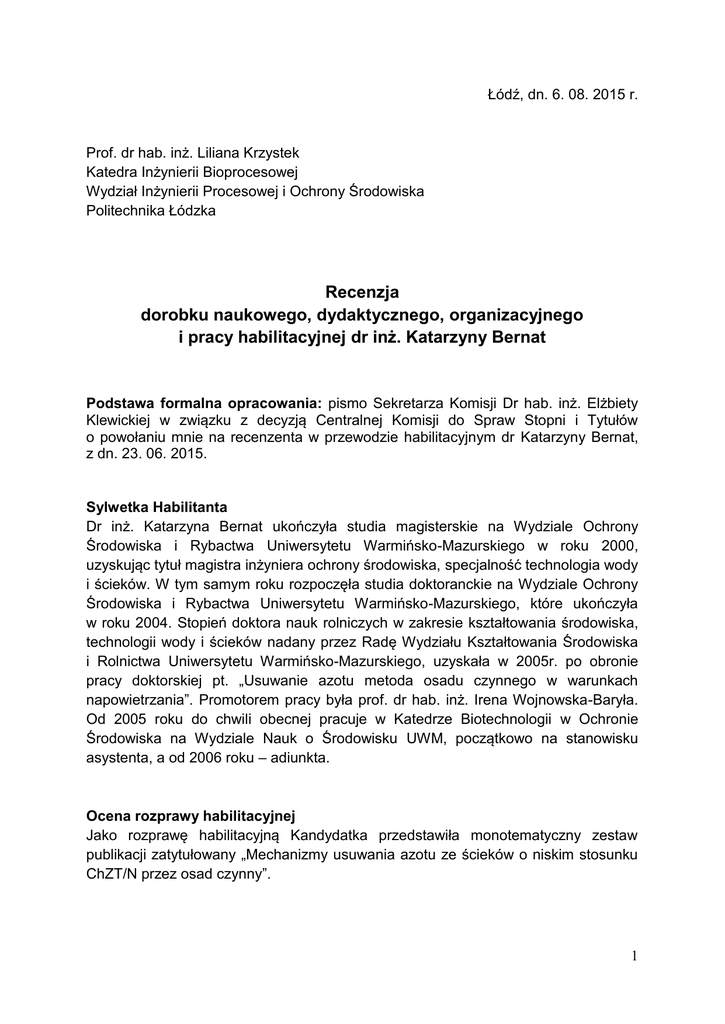 Łódź, dn. 6. 08. 2015 r. Prof. dr hab. inż. Liliana Krzystek Katedra Inżynierii Bioprocesowej Wydział Inżynierii Procesowej i Ochrony Środowiska Politechnika Łódzka Recenzja dorobku naukowego, dydaktycznego, organizacyjnego i pracy habilitacyjnej dr inż. Katarzyny Bernat Podstawa formalna opracowania: pismo Sekretarza Komisji Dr hab. inż. Elżbiety Klewickiej w związku z decyzją Centralnej Komisji do Spraw Stopni i Tytułów o powołaniu mnie na recenzenta w przewodzie habilitacyjnym dr Katarzyny Bernat, z dn. 23. 06. 2015. Sylwetka Habilitanta Dr inż. Katarzyna Bernat ukończyła studia magisterskie na Wydziale Ochrony Środowiska i Rybactwa Uniwersytetu Warmińsko-Mazurskiego w roku 2000, uzyskując tytuł magistra inżyniera ochrony środowiska, specjalność technologia wody i ścieków. W tym samym roku rozpoczęła studia doktoranckie na Wydziale Ochrony Środowiska i Rybactwa Uniwersytetu Warmińsko-Mazurskiego, które ukończyła w roku 2004. Stopień doktora nauk rolniczych w zakresie kształtowania środowiska, technologii wody i ścieków nadany przez Radę Wydziału Kształtowania Środowiska i Rolnictwa Uniwersytetu Warmińsko-Mazurskiego, uzyskała w 2005r. po obronie pracy doktorskiej pt. „Usuwanie azotu metoda osadu czynnego w warunkach napowietrzania”. Promotorem pracy była prof. dr hab. inż. Irena Wojnowska-Baryła. Od 2005 roku do chwili obecnej pracuje w Katedrze Biotechnologii w Ochronie Środowiska na Wydziale Nauk o Środowisku UWM, początkowo na stanowisku asystenta, a od 2006 roku – adiunkta. Ocena rozprawy habilitacyjnej Jako rozprawę habilitacyjną Kandydatka przedstawiła monotematyczny zestaw publikacji zatytułowany „Mechanizmy usuwania azotu ze ścieków o niskim stosunku ChZT/N przez osad czynny”. 1 Zestaw prac obejmuje 5 opublikowanych oryginalnych artykułów (I.A. 1-5) o spójnej tematyce, zgodnej z wymienionym wyżej tytułem. Wszystkie prace zostały wydrukowane w czasopismach z listy JCR: Bioresource Technology - 2 prace (IF = 4,98 i 5,093), Archives of Environmental Protection - 1 praca (IF = 0,506), Desalination and Water Treatment - 1 praca (IF = 0.852) Journal of Microbiology and Biotechnology - 1 praca (IF = 1,399). Są to prace głównie wieloautorskie (pięciu współautorów), jedynie w jednej pracy jest dwóch autorów. W trzech pracach Kandydatka jest autorem pierwszym. Jej udział w realizacji prac wyniósł, na podstawie oświadczeń współautorów od 40 do 70% (średnio 48%). Łączny współczynnik oddziaływania (IF) w/w prac wyniósł 12,830, a uwzględniwszy udział 6,158, ich punktacja według listy MNiSW 140 (67,2). Przedstawione prace dotyczą zagadnienia związanego z usuwaniem azotu przez osad czynny z wód nadosadowych oraz odcieków składowiskowych charakteryzujących się niskim stosunkiem ChZT/N w reaktorach SBR przy niskim stężeniu rozpuszczonego tlenu. Zainteresowania naukowe Kandydatki skupione są na określeniu efektywności nitryfikacji i denitryfikacji, kinetyki usuwania azotu amonowego, sprawności usuwania związków organicznych i produkcji osadu z wód nadosadowych i odcieków składowiskowych (I.A.1-2, 5), zmiany liczebności i zróżnicowania gatunkowego bakterii utleniających azot amonowy w osadzie czynnym (I.A.3-4) oraz wykorzystania gliceryny odpadowej jako alternatywnego źródła węgla (I.A.5). Ze względu na to, iż wspólne oczyszczanie ścieków komunalnych, wód nadosadowych lub odcieków składowiskowych w głównym ciągu technologicznym oczyszczalni ścieków powoduje obniżenie sprawności nitryfikacji, a tym samym usuwania związków azotu, poszukuje się rozwiązań technologicznych wykorzystujących inne niż klasyczna nitryfikacja i denitryfikacja mechanizmów usuwania azotu ze ścieków (częściowa nitryfikacja/denitryfikacja, SHARON lub Anammox). Celem określenia sprawności nitryfikacji i denitryfikacji podczas oczyszczania wód nadosadowych o niskim stosunku ChZT/N (34), dr inż. Katarzyna Bernat rozpoznała wpływ parametrów technologicznych (stopnia wymiany objętościowej oraz długości faz napowietrzania i mieszania) w reaktorze SBR na przebieg i kinetykę usuwania azotu przy niskim stężeniu rozpuszczonego tlenu (0,7 mg O2/l), (I.A.1-2). Na podstawie przeprowadzonych badań z naprzemiennym napowietrzaniem (7 h) i mieszaniem (1 h) w reaktorach SBR stwierdziła, że zwiększenie zawartości związków organicznych z 0,43 g ChZT/d do 2.13 g ChZT/d w strumieniu doprowadzanym do reaktora powoduje spadek sprawności usuwania związków organicznych z 95,0 do 86,6 %. Natomiast produkcja biomasy osadu czynnego w odniesieniu do wykorzystanych związków organicznych, niezależnie od stopnia wymiany objętościowej, n, utrzymuje się na zbliżonym poziomie (od 0,62 do 0,66 g s.m.o./g ChZT). Kandydatka wyznaczyła właściwą szybkość procesów endogennych 2 (kd) oraz wartość współczynnika utrzymania aktywności metabolicznej osadu (współczynnika zachowawczego, m). Wykazała, iż w reaktorze SBR utlenianie azotu amonowego przez osad czynny, niezależnie od n, zachodzi zgodnie z reakcją 0-rzędu, a efektywność utlenienia azotu amonowego jest na poziomie 96,098,4%. Wraz ze zwiększeniem stopnia wymiany objętościowej notowała wzrost szybkości utleniania azotu amonowego. Przy małym n azot amonowy był utleniany przez osad czynny w I fazie napowietrzania, przy n wynoszącym 0,5 d-1 utlenianie zachodziło zarówno w I jak i II fazie napowietrzania. Wskazała, iż mechanizm utleniania azotu amonowego przez osad czynny zależy od stopnia wymiany objętościowej. Przy najniższym n produktem utleniania były azotany (V), natomiast zwiększenie n do wartości 0,5 d-1 powoduje, że osad czynny utlenia azot amonowy do azotanów (III). Przy najwyższym stopniu wymiany objętościowej, sprawność denitryfikacji wynosiła 42% . W celu zwiększenia sprawności denitryfikacji w reaktorze SBR, dr inż. Katarzyna Bernat zmieniła cykl jego pracy, skracając cz