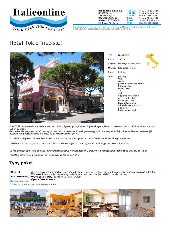Italieonline Sp. z o.o. Bryksova 757 198 00 Praga 9 Republika Czeska REGON: 27614140 NIP: CZ 27614140 Tel CZ: Tel SK: Tel PL: Fax: Email: Web: +420 284 811 218 +421 233 006 523 +48 223 987 493 +420 284 811 210 [email protected] www.italieonline.eu Biuro podróży Italieonline sp. z o.o. jest zapisane w Miejskim Sądzie w Pradze oddział C, wkład 118991 i ubezpieczone na wypadek upadku w ČPP a.s. Hotel Tokio (IT62-583) Typ: Hotel Plaża: 100 m Region: Wenecja Euganejska Miasto: Lido di Jesolo est Pokoje: 2+2 Opis*: parking Wi-Fi winda pobyt zwierząt zakazany klimatyzacja taras/balkon TV sejf niepełne wyżywienie piaszczysta plaża serwis plażowy Riwiera Wenecka odpowiednie dla rodzin z dziećmi Północny Adriatyk Hotel Tokio znajduje się we wschodniej części Lido di Jesolo przy głównej ulicy ze sklepami, barami i restauracjami, ok. 150 m od placu Milano i 100 m od plaży. Goście hotelu mogą korzystać z recepcji, baru, windy, restauracji, parkingu (dostępny do wyczerpania miejsc, bez możliwości rezerwacji) i bezpłatnego podłączenia do internetu na parterze budynku (Wi-Fi). Wyżywienie niepełne - śniadania w formie bufetu. Na życzenie za opłatą możliwość dokupienia niepełnego wyżywienia. Zniżki na 3. i 4. łóżko: jedno dziecko do 7 lat za darmo (drugie zniżka 50%), do 15 lat 50 %, pozostałe osoby - 20%. Na miejscu jest pobierana obowiązkowa opłata miejscowa w wysokości 0,60 €/os./noc, z której są zwolnione dzieci w wieku do 12 lat. * Niektóre usługi nie są wliczone w cenę i mogą być świadczone za dopłatą. Typy pokoi DBL+HB dwuosobowy pokój z możliwością dwóch dostawek, łazienka, balkon, TV, sejf, klimatyzacja, suszarka do włosów, telefon W cenie: klimatyzacja, niepełne wyżywienie, poszewki, ręczniki (za tydzień), serwis plażowy 2+2 (double) Wymagane opłaty: opłata miejscowa 4.20€/P Opłaty fakultatywne: Zarezerwować P - cena na osobę, A - cena za apartament/pokój Prezentowane zdjęcia są przykładowe. DBL+HB 2+2 Sezon (double) Terminy Cena za noc / P Początek pobytu Koniec pobytu Min. ilość nocy A 20.05. - 03.06.2017 02.09. - 16.09.2017 200 zł Każdy dzień Każdy dzień 3 B 04.06. - 30.06.2017 26.08. - 01.09.2017 224 zł Każdy dzień Każdy dzień 3 C 01.07. - 04.08.2017 19.08. - 25.08.2017 260 zł Każdy dzień Każdy dzień 3 D 05.08. - 18.08.2017 290 zł Sob Sob 7 Zniżka 5% Ważne do Do 21.04.2017 Dla pobytów od 20.05.2017 Do 15.09.2017 Warunek Zniżki nie można połączyć z innymi zniżkami https://www.italieonline.eu/pl/lido-di-jesolo/hotel-tokio-583.html www.ITALIEONLINE.eu TOUR OPERATOR FOR ITALY