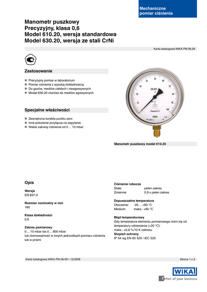 Manometr puszkowy Precyzyjny, klasa 0,6 Model 610.20, wersja standardowa Model 630.20, wersja ze stali CrNi Mechaniczne pomiar ciśnienia Karta katalogowa WIKA PM 06.09 Zastosowanie Precyzyjny pomiar w laboratorium Pomiar ciśnienia z wysoką dokładnością Do gazów, mediów ciekłych i nieagresywnych Model 630.20 również do mediów agresywnych Specjalne właściwości Zewnętrzna korekta punktu zero Inne położenie przyłącza na zapytanie Niskie zakresy ciśnienia od 0 ... 10 mbar Manometr puszkowy model 610.20 Opis Wersja EN 837-3 Rozmiar nominalny w mm 160 Klasa dokładności 0,6 Zakres pomiarowy 0 ... 10 mbar bis 0 ... 600 mbar lub równoważność w innych jednostkach pomiaru ciśnienia lub w próżni Karta katalogowa WIKA PM 06.09 ∙ 12/2008 Ciśnienie robocze Stałe: Zmienne: pełen zakres 0,9 x pełen zakres Dopuszczalna temperatura Otoczenie: -20 ... +60 °C Medium: maks.: +60 °C Błąd temperaturowy Gdy temperatura elementu pomiarowego różni się od temperatury odniesienia (+20 °C): maks.: ±0,6 %/10 K zakresu Stopień ochrony IP 54 wg EN 60 529 / lEC 529 Strona 1 z 2 Wersja standardowa Inne opcje Przyłącze procesowe Model 610.20: stop miedzi Model 630.20: stal CrNi Położenie gwintu: dolne lub tylne ekscentryczne Gwint zew. G ½ B, SW 22 Kołnierz przedni lub tylny, stal CrNi Obejma do montażu panelowego, stal CrNi z uchwytem Szyba przemysłowa lub wielowarstwowa bezpieczna Pokrywa typu Twist zaplombowana Element pomiarowy Podwójny mieszek, stal CrNi Mechanizm Stop miedzi, z łożyskiem kulkowym Wymiary w mm Wersja standardowa Podzielnia Białe aluminium z czarną skalą Przyłącze radialne dolne 2147335.01 Wskazówka Wskazówka nożowa, czarna z aluminium Korekta punktu zero Z przodu Obudowa Stal CrNi Szyba Szkło akrylowe Pokrywa Typu Twist, stal CrNi 2147343.01 Przyłącze tylne ekscentryczne Opcjonalnie Inne przyłącza procesowe Mechanizm stal CrNi, z łożyskiem kulkowym Dopuszczalne przeciążenie lub bezpieczne podciśnienie dla: zakresu > 25 mbar: 10 x pełen zakres zakresu ≤ 25 mbar: 3 x pełen zakres NS 160 Wymiary w mm a 15,5 b 65,5 b1 65,5 b2 99 D1 161 D2 159 e 17,5 f 50 G G½B h±1 118 SW 22 Waga w kg 1,2 Przyłącze procesowe wg EN 837-3 / 7.3 Dane do zamówienia Istnieje możliwość wprowadzenia modyfikacji i zmian specyfikacji materiałowej bez wcześniejszego powiadomienia. Specyfikacje i wymiary podane w niniejszej karcie przedstawiają stan konstrukcyjny aktualny w momencie wydruku. Strona 2 z 2 Karta katalogowa WIKAPM 06.09 ∙ 12/2008 WIKA Polska spółka z ograniczoną odpowiedzialnością sp. k. ul. Łęgska 29/35 87-800 Włocławek Tel.: (+48) 54 23 01 100 Fax: (+48) 54 23 01 101 E-mail: [email protected] www.wikapolska.pl 12/2008 based on 12/2008 Model / rozmiar nominalny / zakres pomiarowy / rozmiar przyłącza/ położenie przyłącza / opcjonalnie