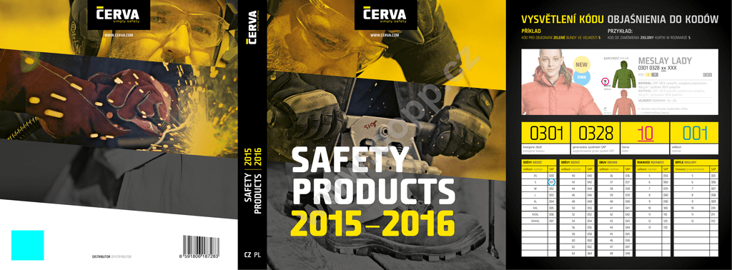 VYSVĚTLENÍ KÓDU OBJAŚNIENIA DO KODÓW WWW.CERVA.COM PŘÍKLAD PRZYKŁAD: KÓD PRO OBJEDNÁNÍ ZELENÉ BUNDY VE VELIKOSTI S KOD DO ZAMÓWIENIA ZIELONY KURTKI W ROZMIARZE S BAREVNOST KOLOR: cz WWW.CERVA.COM NEW CZ PL w .o w 0301 0328 xx XXX MOQ ZIMA 10 1 10 MATERIÁL: 310T 100 % nylon/PU, zateplená polyesterem, 160 g /m², podšívka 100 % polyester MATERIAŁ: 310T 100 % nylon/PU, poliestrowa ocieplina, 160 g /m², podszewka 100 % poliester zelená zielony p. op 8 591806 5 187283 w SAFETY 2015 PRODUCTS 2016 DISTRIBUTOR DYSTRYBUTOR SAFETY PRODUCTS 2015–2016 MESLAY LADY VELIKOSTI ROZMIARY: XS – 2XL 20 • dámská zimní bunda moderního střihu s odepínatelnou kapucí • vynikající termoizolační vlastnosti • lehká, nepromokavá • projmutý střih • vnitřní žebrované manžety z elastického materiálu • spodní lem ke stažení na šňůrku červená czerwony 0301 0328 10 56 bordó bordowy generováno systémem SAP kategorie zboží kategoria towaru wygenerowane przez system SAP ODĚVY ODZIEŻ velikost rozmiar ODĚVY ODZIEŻ SAP velikost rozmiar barva kolor OBUV OBUWIE 001 • damska kurtka zimowa o modnym kroju, z odpinanym kapturem • doskonała izolacja termiczna velikost • lekka, wodoodporna rozmiar • dopasowany krój • wewnętrzne, elastyczne ściągacze • regulacja u dołu za pomocą sznurka RUKAVICE RĘKAWICE BRÝLE OKULARY SAP 60 rozmiar velikost SAP velikost rozmiar SAP tmavost przyciemnienie SAP 036 5 050 5 005 XS 000 40 040 černá czarny36 S 001 42 042 37 037 6 060 6 006 M 002 44 044 38 038 7 070 7 007 L 003 46 046 39 039 8 080 8 008 XL 004 48 048 40 040 9 090 9 009 XXL 005 50 050 41 041 10 100 10 010 XXXL 006 52 052 42 042 11 110 11 011 XXXXL 007 54 054 43 043 12 120 12 012 56 056 44 044 13 130 58 058 45 045 60 060 46 046 62 062 47 047 64 064 48 048 KATALOG NA ROK 2015/16 Vážení obchodní partneři, Szanowni Państwo, vítejte na stránkách nového ČERVA katalogu. Stejně jako v předchozích letech, i letos bychom vám rádi představili řadu novinek připravených pro nadcházející sezónu 2015-2016. Významnou událostí roku je přestěhování centrálního skladu a kanceláří společnosti ČERVA ČR do nových prostor s dvojnásobnou skladovací plochou, čímž můžeme garantovat ještě vyšší kapacitu skladu a lepší dostupnost zboží pro všechny pobočky a státy, kde je naše společnost aktivní. Witamy na kartach nowej edycji katalogu CERVA. Jak każdego roku, znajdziecie tu Państwo bogatą ofertę nowości produktowych na sezon 2015-2016. Chcielibyśmy także pokrótce podzielić się z Państwem ważnymi zmianami/informacjami związanymi z rozwojem naszej firmy. Kluczowym wydarzeniem jest na pewno niedawna zmiana siedziby głównej wraz z magazynem centralnym CERVA CZ. Nowa lokalizacja, w stosunku do poprzedniej, ma dwukrotnie większą powierzchnię magazynową, dzięki czemu możemy teraz gromadzić większe zapasy towarów, a co za tym idzie zapewnić lepszą dostępność asortymentu dla wszystkich naszych oddziałów. Począwszy od tego roku, nowości produktowe są projektowane w nowopowstałym studiu projektowym CERVA, w którym nasi projektanci opracowują innowacyjne i stworzone zgodnie z najnowszymi trendami kolekcje produktów, które spełniają wszystkie konieczne wymogi bezpieczeństwa. Przykładem tego nowego, zintegrowanego podejścia jest zaprezentowana w tej edycji katalogu CERVA całkowicie nowa i oryginalna kolekcja OS. Wyróżnia ją niezwykła dbałość o detale i precyzyjny krój, dzięki czemu jest to jedna z najlepszych jakościowo kolekcji zapewniająca użytkownikowi zarówno bezpieczeństwo, jak i komfort. Polecamy również Państwa uwadze dobrze znane już naszym Klientom kolekcje – wzbogaciliśmy je o bluzy, t-shirty, kurtki i inne dodatki w nowej kolorystyce. Obserwując rosnące zapotrzebowanie na Środki Ochrony Indywidualnej uzupełniliśmy również naszą ofertę odzieży Hi-Vis o nowe, spełniające zachodnie standardy modele płaszczy, komplety przeciwdeszczowe oraz kolory. w .o op Od letošního roku vznikají naše produkty v nově fungujícím ČERVA designérském studiu, kde od nákresu až po výrobu vyvíjí naši návrháři kolekce v originálním designu zpracovaném v souladu s nejnovějšími světovými módními trendy i bezpečnostními požadavky. V tomto duchu vám na stránkách katalogu představujeme zcela novou originální kolekci OS. Pracovní pomůcky zařazené v kolekci OS patří kvalitativně a designově k těm nejlepším v kategorii pomůcek poskytujících ochranu, pohodlí s velkým důrazem na střih a detaily provedení. Za pozornost stojí i důkladné prostudování nabídky stávajících kolekcí, jenž byly pro letošní sezónu významně rozšířeny o nové mikiny, trička, bundy a další doplňky v nových barvách. Velké rozšíření doznala také naše kolekce high visibility produktů, jejíž barevné provedení bylo rozšířeno, a tím jsme se ještě více přiblížili západním standardům a zákaznickým požadavkům. V high visibility a dalších barvách jsme také zařadili nové PU pláště a sety do deště. V tomto segmentu OOPP zaznamenáváme rychle rostoucí poptávku ze strany koncových uživatelů. Zakres asortymentowy Środków Ochrony Indywidualnej CERVA składa się głównie z produktów wytwarzanych pod naszymi, prywatnymi markami, których proces produkcyjny ściśle nadzorujemy. Naszą ofertę uzupełniamy również asortymentem uznanych światowych producentów. W tej edycji katalogu, wszystkie nowe produkty zostały pogrupowane w kolekcje, tak abyście mogli Państwo łatwo wybrać preferowaną jakość i design. Dzięki takim rozwiązaniom możemy zaoferować Państwu najszerszą możliwą gamę produktów. p. Nabídka společnosti ČERVA je především sestavená z produktů vlastních privátních značek, jejichž kvalitu a výrobu neustále kontrolujeme, současně je doplněna o produ