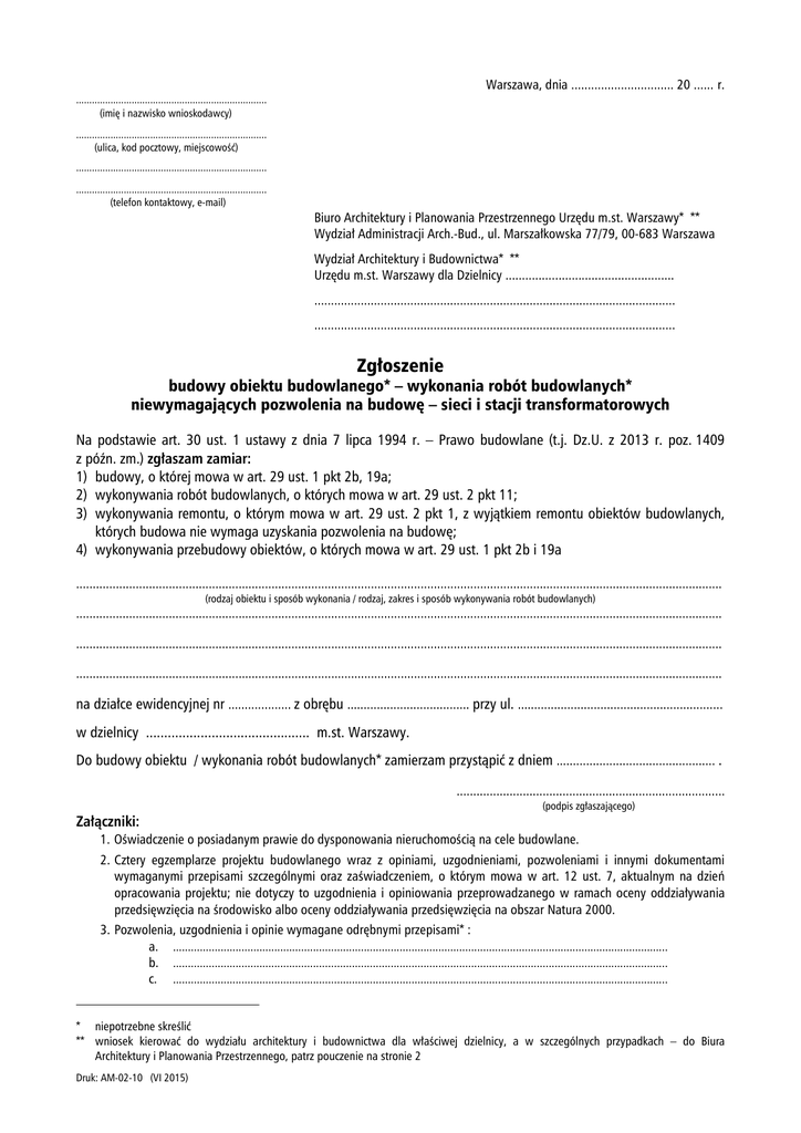 Warszawa, dnia ............................... 20 ...... r. ........................................................................ (imię i nazwisko wnioskodawcy) ........................................................................ (ulica, kod pocztowy, miejscowość) ........................................................................ ........................................................................ (telefon kontaktowy, e-mail) Biuro Architektury i Planowania Przestrzennego Urzędu m.st. Warszawy* ** Wydział Administracji Arch.-Bud., ul. Marszałkowska 77/79, 00-683 Warszawa Wydział Architektury i Budownictwa* ** Urzędu m.st. Warszawy dla Dzielnicy ................................................... ............................................................................................................. ............................................................................................................. Zgłoszenie budowy obiektu budowlanego* – wykonania robót budowlanych* niewymagających pozwolenia na budowę – sieci i stacji transformatorowych Na podstawie art. 30 ust. 1 ustawy z dnia 7 lipca 1994 r. – Prawo budowlane (t.j. Dz.U. z 2013 r. poz. 1409 z późn. zm.) zgłaszam zamiar: 1) budowy, o której mowa w art. 29 ust. 1 pkt 2b, 19a; 2) wykonywania robót budowlanych, o których mowa w art. 29 ust. 2 pkt 11; 3) wykonywania remontu, o którym mowa w art. 29 ust. 2 pkt 1, z wyjątkiem remontu obiektów budowlanych, których budowa nie wymaga uzyskania pozwolenia na budowę; 4) wykonywania przebudowy obiektów, o których mowa w art. 29 ust. 1 pkt 2b i 19a ................................................................................................................................................................................................... (rodzaj obiektu i sposób wykonania / rodzaj, zakres i sposób wykonywania robót budowlanych) ................................................................................................................................................................................................... ................................................................................................................................................................................................... ................................................................................................................................................................................................... na działce ewidencyjnej nr ................... z obrębu ..................................... przy ul. .............................................................. w dzielnicy ............................................. m.st. Warszawy. Do budowy obiektu / wykonania robót budowlanych* zamierzam przystąpić z dniem ................................................ . ................................................................................. (podpis zgłaszającego) Załączniki: 1. Oświadczenie o posiadanym prawie do dysponowania nieruchomością na cele budowlane. 2. Cztery egzemplarze projektu budowlanego wraz z opiniami, uzgodnieniami, pozwoleniami i innymi dokumentami wymaganymi przepisami szczególnymi oraz zaświadczeniem, o którym mowa w art. 12 ust. 7, aktualnym na dzień opracowania projektu; nie dotyczy to uzgodnienia i opiniowania przeprowadzanego w ramach oceny oddziaływania przedsięwzięcia na środowisko albo oceny oddziaływania przedsięwzięcia na obszar Natura 2000. 3. Pozwolenia, uzgodnienia i opinie wymagane odrębnymi przepisami* : a. ...................................................................................................................................................................... b. ...................................................................................................................................................................... c. ...................................................................................................................................................................... * niepotrzebne skreślić ** wniosek kierować do wydziału architektury i budownictwa dla właściwej dzielnicy, a w szczególnych przypadkach – do Biura Architektury i Planowania Przestrzennego, patrz pouczenie na stronie 2 Druk: AM-02-10 (VI 2015) Pouczenie: Wniosek kierować do Biura Architektury i Planowania Przestrzennego – Wydział Architektury Architektoniczno-Budowlanej w przypadku inwestycji: a) stanowiących obiekty kubaturowe o powierzchni całkowitej powyżej 15.000 m2, b) o wysokości powyżej 30 m, c) przedstawicielstw dyplomatycznych i urzędów konsularnych oraz organizacji międzynarodowych, d) naczelnych i centralnych organów administracji państwowej, e) wykraczających swoim zasięgiem poza granice dzielnicy, f) dotyczących dróg publicznych z wyjątkiem dróg gminnych. W przypadku inwestycji niewymienionych powyżej wniosek należy kierować do wydziału architektury i budownictwa dla właściwej dzielnicy. Zgłoszenia należy dokonać przed terminem zamierzonego rozpoczęcia robót budowlanych. Do wykonywania robót budowlanych można przystąpić nie wcześniej niż w ciągu 30 dni od zgłoszenia, jeżeli w tym terminie właściwy organ nie wniesie sprzeciwu w drodze decyzji i nie później niż po upływie 3 lat od terminu ich rozpoczęcia określonego w zgłoszeniu. Przedsięwzięcia, które wymagają przeprowadzenia oceny oddziaływania na środowisko, oraz przedsięwzięcia wymagające przeprowadzenia oceny oddziaływania na obszar Natura 2000, zgodnie z art. 59 ustawy z dnia 3 października 2008 r. o udostępnianiu informacji o środowisku i jego ochronie, udziale społeczeństwa w ochronie środowiska oraz o ocenach oddziaływania na środowisko wymagają uzyskania pozwolenia na budowę (art. 29 ust. 3). Zgodnie z ustawą Prawo budowlane: Art. 29. 1. Pozwolenia na budowę nie wymaga budowa: 1) obiektów gospodarczych związanych z pr