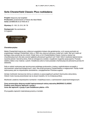 Sofa Chesterfield Classic Plus rozkładana http://www.futurefurniture.pl/pl/offer/meble/sofy/sofa-chesterfield-classic-plus-rozkladana.html/ Projekt: klasyczny styl angielski Producent:: produkowane w Polsce dla Ideal Meble Cena: od 5950.00 zł od 4400.00 zł Wymiary: D: 100 | S: 210 | W: 78 Dostępność: Na zamówienie 4-6 tygodni Charakterystyka: Meble Chesterfield kojarzą się z elitarnym angielskim klubem dla gentelmenów, a ich nazwa pochodzi od angielskiego hrabiego Chesterfield, który w 1900 roku stworzył pierwszy model tych mebli. Styl tych mebli od tamtego czasu prawie się nie zmienił. Dzięki temu w linii Chesterfieldów Classic możemy cieszyć się charakterystycznym dla stylu wzorem głęboko pikowanych guzikami sof i foteli. Sofa 3-osobowa tapicerowana wysokiej jakości naturalną skórą. Sofa ta wzbogacona została o wyjątkowo wygodnę opcję spania. Posiada stabilny stelarz oraz materac z pianki. Dodatkowa sofa ta może posiadać charkterystyczne pikowanie poniżej lini siedziska. Sofa w całości wykonana jest ręcznie przez polskiego producenta z troską o najdrobniejsze szczegóły z zachowaniem zasad technologicznych i stylu. Nie przetrzymujemy Chesterfieldów w magazynach. Każdy model wykonywany jest na indywidualne zamówienie z uwzględnieniem Państwa sugestii. Istnieje możliwość nieznacznej różnicy w odcieniu w poszczególnych partiach tkaniny/eko-skóry/skóry. Odcień może inaczej prezentować się na dużym kawałku niż na mniejszej próbce. Możliwość ustalenia indywidualnie rozmiarów i modyfikacji wzoru z zachowaniem zasad technologicznych. Ceny promocyjne dotyczą modeli tapicerowanych skórą naturalną MADRAS CLASSIC Podana cena dotyczy tapicerki z grupy I Cena dla tapicerki z grupy II jest dodatkowo płatna +15% W przypadku tapicerki materiałowej prosimy o kontakt. http://www.futurefurniture.pl Dostępne wersje produktu: nazwa produktu Sofa Chesterfield Classic 4 osobowa Sofa Chesterfield Classic 3 osobowa 210 cm Sofa Chesterfield Classic 2 osobowa 180 cm warianty Tapicerka skóra naturalna cena dostępne 6400.00zł 5800.00zł 4-6 tygodni Kryształki Swarovskiego (+1200.00 zł) Podwójny pik (+300.00 zł) Front z harmonijką (+200.00 zł) Tapicerka skóra 5950.00zł 4400.00zł 4-6 tygodni naturalna Kryształki Swarovskiego (+800.00 zł) Podwójny pik (+300.00 zł) Front z harmonijką (+200.00 zł) Tapicerka skóra 5850.00zł 3900.00zł 4-6 tygodni naturalna Kryształki Swarovskiego (+700.00 zł) Podwójny pik (+300.00 zł) Front z harmonijką (+200.00 zł) http://www.futurefurniture.pl Zdjęcia produktu: http://www.futurefurniture.pl Powered by TCPDF (www.tcpdf.org)