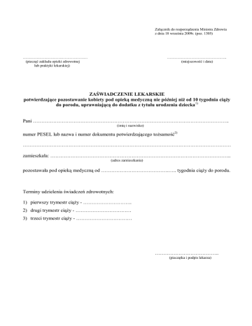 Załącznik do rozporządzenia Ministra Zdrowia z dnia 18 września 2009r. (poz. 1305) …………………………………………… (pieczęć zakładu opieki zdrowotnej lub praktyki lekarskiej) ……………………………………….. (miejscowość i data) ZAŚWIADCZENIE LEKARSKIE potwierdzające pozostawanie kobiety pod opieką medyczną nie później niż od 10 tygodnia ciąży do porodu, uprawniającą do dodatku z tytułu urodzenia dziecka1) Pani …………………………………………………………………………………………………….. (imię i nazwisko) numer PESEL lub nazwa i numer dokumentu potwierdzającego tożsamość2) …………………………………………………………………………………………………………… zamieszkała: …………………………………………………………………………………………….. (adres zamieszkania) pozostawała pod opieką medyczną od ………………………………….….. tygodnia ciąży do porodu. Terminy udzielenia świadczeń zdrowotnych: 1) pierwszy trymestr ciąży - ……………………….. 2) drugi trymestr ciąży - …………………………… 3) trzeci trymestr ciąży - …………………………… ……………………………….. (pieczątka i podpis lekarza)