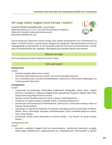 5EGPCTKWU\G\CLõçQRTCEQYCPGRT\G\)TWRõ4QDQE\ð'FW)+5YTC\\MQOGPVCT\GO KĚĐnjĞŐŽnjĂůĞǏLJǁLJŐůČĚŵŝĂƐƚƵƌŽƉLJŝƑǁŝĂƚĂ͍ :ŽĂŶŶĂWŽƌħďĂͲ<ǁŝĂƚŬŽǁƐŬĂ͕ĞƐƉſų^njŬſų L KŐſůŶŽŬƐnjƚĂųĐČĐLJĐŚŶƌϲŝŵ͘:ĂŶĂ<ŽĐŚĂŶŽǁƐŬŝĞŐŽǁZĂĚŽŵŝƵ͕ ZĂĚŽŵƐŬŝKƑƌŽĚĞŬŽƐŬŽŶĂůĞŶŝĂEĂƵĐnjLJĐŝĞůŝ͕ ũƉŬǁŝĂƚŬŽǁƐŬĂΛŐŵĂŝů͘ĐŽŵ dĞŵĂƚĚŽƚLJĐnjČĐLJĮnjũŽŶŽŵŝŝŵŝĂƐƚƵƌŽƉLJŽƌĂnjƑǁŝĂƚĂƉƌnjĞǁŝĚnjŝĂŶŽĚŽnjƌĞĂůŝnjŽǁĂŶŝĂŶĂ ůĞŬĐũŝǁ//ŬůĂƐŝĞůŝĐĞƵŵnjƌŽnjƐnjĞƌnjŽŶLJŵƉƌŽŐƌĂŵĞŵŐĞŽŐƌĂĮŝ͘ĂƉƌŽƉŽŶŽǁĂŶLJƐĐĞŶĂƌŝƵƐnj ŶĂũǁLJŐŽĚŶŝĞũƉƌnjĞƉƌŽǁĂĚnjŝđǁƐĂůŝŬŽŵƉƵƚĞƌŽǁĞũůƵďƉƌĂĐŽǁŶŝƉƌnjĞĚŵŝŽƚŽǁĞũnjĚŽƐƚħƉĞŵĚŽŬŽŵƉƵƚĞƌſǁ;ŶƉ͘ůĂƉƚŽƉLJͿ͘tLJŵĂŐĂŶĞũĞƐƚƐƉƌĂǁŶĞųČĐnjĞŝŶƚĞƌŶĞƚŽǁĞ͘ 'ųſǁŶLJĐĞůnjĂũħđ WŽnjŶĂŶŝĞŐųſǁŶLJĐŚƚLJƉſǁĮnjũŽŶŽŵŝĐnjŶLJĐŚŵŝĂƐƚ͘ Cele operacyjne tŝĂĚŽŵŽƑĐŝ hĐnjĞŷ͗ ʹ ǁLJũĂƑŶŝĂƉŽũħĐŝĞĮnjũŽŶŽŵŝĂŵŝĂƐƚĂ͖ ʹ ǁLJŵŝĞŶŝĂƚLJƉLJĮnjũŽŶŽŵŝĐnjŶĞŵŝĂƐƚŝŝĐŚĐĞĐŚLJĐŚĂƌĂŬƚĞƌLJƐƚLJĐnjŶĞ͖ ʹ nj ŶĂŝĐŚĂƌĂŬƚĞƌLJnjƵũĞĐnjLJŶŶŝŬŝ;ƑƌŽĚŽǁŝƐŬŽǁĞ͕ŚŝƐƚŽƌLJĐnjŶĞ͕ŬƵůƚƵƌŽǁĞͿǁƉųLJǁĂũČĐĞŶĂ njƌſǏŶŝĐŽǁĂŶŝĞĮnjũŽŶŽŵŝŝ͘ hŵŝĞũħƚŶŽƑĐŝ hĐnjĞŷ͗ ʹ ƌ ŽnjƉŽnjŶĂũĞ ŶĂ ƉŽĚƐƚĂǁŝĞ ŵĂƚĞƌŝĂųſǁ ǍƌſĚųŽǁLJĐŚ ;ĨŽƚŽŐƌĂĮĞ͕ ƉůĂŶLJ ŵŝĂƐƚ͕ njĚũħĐŝĂ ůŽƚŶŝĐnjĞŝƐĂƚĞůŝƚĂƌŶĞ͗ĂƉůŝŬĂĐũĂ'ŽŽŐůĞĂƌƚŚ͕ŐĞŽƉŽƌƚĂůĞŬƌĂũŽǁĞ͕^njŬŽůŶLJƚůĂƐ^͕ ŽƉŝƐLJͿƌſǏŶĞƚLJƉLJĮnjũŽŶŽŵŝĐnjŶĞŵŝĂƐƚ͖ ʹ ŽƉŝƐƵũĞĐĞĐŚLJĐŚĂƌĂŬƚĞƌLJƐƚLJĐnjŶĞŵŝĂƐƚŽĚĂŶLJŵƚLJƉŝĞĮnjũŽŶŽŵŝŝ͖ ʹ ǁƐŬĂnjƵũĞŶĂŵĂƉŝĞƑǁŝĂƚĂƉƌnjLJŬųĂĚLJŵŝĂƐƚŽǁƐŬĂnjĂŶĞũĮnjũŽŶŽŵŝŝ͖ ʹ Ɖ ŽƌſǁŶƵũĞƵǁĂƌƵŶŬŽǁĂŶŝĂƑƌŽĚŽǁŝƐŬŽǁĞ͕ŚŝƐƚŽƌLJĐnjŶĞŝŬƵůƚƵƌŽǁĞƌŽnjǁŽũƵŵŝĂƐƚŶĂ ƌſǏŶLJĐŚŬŽŶƚLJŶĞŶƚĂĐŚ͖ ʹ ǁ LJƐnjƵŬƵũĞǁ/ŶƚĞƌŶĞĐŝĞ;ƌſǁŶŝĞǏŶĂƐƚƌŽŶĂĐŚŽďĐŽũħnjLJĐnjŶLJĐŚͿƉƌĞnjĞŶƚĂĐũĞŵƵůƟŵĞĚŝĂůŶĞ͕ ĮůŵLJ͕ ŝŶĨŽƌŵĂĐũĞ ŽƉŝƐŽǁĞ ƉƌnjĞĚƐƚĂǁŝĂũČĐĞ ĐĞĐŚLJ ĐŚĂƌĂŬƚĞƌLJƐƚLJĐnjŶĞ ǁLJďƌĂŶLJĐŚŵŝĂƐƚƑǁŝĂƚĂ͖ ʹ Ɖ ƌĞnjĞŶƚƵũĞ ǁLJŶŝŬŝ ƉƌĂĐLJ ĚŽŵŽǁĞũ ŶĂ ƐƚƌŽŶŝĞ ƐnjŬŽųLJ ʹ ĐnjLJ ǁŝĞĐŝĞ͕ ǏĞ ŶĂƐnjĞ ŵŝĂƐƚŽ͕ ƐƚŽůŝĐĂ͙ hŵŝĞũħƚŶŽƑĐŝ'/^ hĐnjĞŷ͗ ʹ Ŭ ŽƌnjLJƐƚĂ nj ĂƉůŝŬĂĐũŝ 'ŽŽŐůĞ ĂƌƚŚ ĚŽ ǁLJƐnjƵŬŝǁĂŶŝĂ ŬŽŶŬƌĞƚŶĞũ ůŽŬĂůŝnjĂĐũŝ͕ ƉƌnjĞŐůČĚĂŶŝĂnjĚũħđƐĂƚĞůŝƚĂƌŶLJĐŚ͕njĂƉŽnjŶĂǁĂŶŝĂƐŝħnjĚŽĚĂƚŬŽǁLJŵŝŝŶĨŽƌŵĂĐũĂŵŝŽĚĂŶLJŵ 45 5EGPCTKWU\G\CLõçQRTCEQYCPGRT\G\)TWRõ4QDQE\ð'FW)+5YTC\\MQOGPVCT\GO ŵŝĞƑĐŝĞ ;ĚŽƐƚħƉ ĚŽ ĨŽƚŽŐƌĂĮŝ͕ ŵŽĚĞůŝ ϯ ďƵĚLJŶŬſǁͿ͕ ǁLJnjŶĂĐnjĂŶŝĂ ƐƚƌĞĨ njĂďƵĚŽǁLJ ǁŵŝĞƑĐŝĞ͖ ʹ Ŭ ŽƌnjLJƐƚĂ nj njĂŐƌĂŶŝĐnjŶLJĐŚ ŐĞŽƉŽƌƚĂůŝ ŽĨĞƌƵũČĐLJĐŚ ĚŽƐƚħƉ ĚŽ ŽƉƌĂĐŽǁĂŷ ŵĂƉŽǁLJĐŚ͕ ŽƌƚŽĨŽƚŽŵĂƉĚůĂĚĂŶĞŐŽŽďƐnjĂƌƵ͖ ʹ Ŭ ŽƌnjLJƐƚĂ nj ĂƉůŝŬĂĐũŝ ŵĂƉŽǁLJĐŚ ;KƉĞŶ^ƚƌĞĞƚ DĂƉ͕ 'ŽŽŐůĞ DĂƉƐͿ ĚŽ njĂƉŽnjŶĂŶŝĂ Ɛŝħ njƉůĂŶĂŵŝŵŝĂƐƚ͖ ʹ Ŭ ŽƌnjLJƐƚĂ nj ŽƉƌŽŐƌĂŵŽǁĂŶŝĂ YƵĂŶƚƵŵ '/^ ĚŽ ƉƌnjĞŐůČĚĂŶŝĂ ĚĂŶLJĐŚ ƉƌnjĞƐƚƌnjĞŶŶLJĐŚ ŽƌĂnjĂŶĂůŝnjLJͬǁLJũĂƑŶŝĂŶŝĂ ƵǁĂƌƵŶŬŽǁĂŷƌŽnjǁŽũƵ ƉƌnjĞƐƚƌnjĞŶŶĞŐŽ ǁLJďƌĂŶĞŐŽŵŝĂƐƚĂ ;ĐnjLJŶŶŝŬŝŬƵůƚƵƌŽǁŽͲŚŝƐƚŽƌLJĐnjŶĞ͕ƑƌŽĚŽǁŝƐŬŽǁĞͿ͘ Postawy hĐnjĞŷ͗ ʹ Ƶ njŶĂũĞƌſǁŶŽƌnjħĚŶŽƑđǁƐnjLJƐƚŬŝĐŚƚLJƉſǁĮnjũŽŶŽŵŝĐnjŶLJĐŚŵŝĂƐƚ͕ƌŽnjƵŵŝĞŝĐŚŬƵůƚƵƌŽǁČŝĐLJǁŝůŝnjĂĐLJũŶČƌſǏŶŽƌŽĚŶŽƑđ͘ DĞƚŽĚLJŝƚĞĐŚŶŝŬŝƉƌĂĐLJ භ WƌĂĐĂnjŵĂƚĞƌŝĂųĂŵŝǍƌſĚųŽǁLJŵŝ͗ ʹ Ɖ ŽnjLJƐŬŝǁĂŶŝĞŝƐĞůĞŬĐũĂĚĂŶLJĐŚnj/ŶƚĞƌŶĞƚƵ;ĂƉůŝŬĂĐũĞŵĂƉŽǁĞ͕ƉƌŽŐƌĂŵ'ŽŽŐůĞ ĂƌƚŚͿ͖ ʹ ĂŶĂůŝnjĂŝŝŶƚĞƌƉƌĞƚĂĐũĂĚĂŶLJĐŚ;ŬŽƌnjLJƐƚĂŶŝĞnjŐĞŽƉŽƌƚĂůŝ͕ǁƚLJŵnjĂŐƌĂŶŝĐnjŶLJĐŚͿ͘ භ W ƌĂĐĂnjŵĂƉĂŵŝǁĂƚůĂƐŝĞ͕njŵĂƉČƑĐŝĞŶŶČ;ůŽŬĂůŝnjŽǁĂŶŝĞŽďŝĞŬƚſǁŶĂŵĂƉŝĞƑĐŝĞŶŶĞũͿ͘ භ WƌĂĐĂnjĂƚůĂƐĞŵnjĚũħđƐĂƚĞůŝƚĂƌŶLJĐŚ͘ භ WƌĂĐĂnjĚĂŶLJŵŝƉƌnjĞƐƚƌnjĞŶŶLJŵŝŽƌĂnjŽƉƌŽŐƌĂŵŽǁĂŶŝĞŵ'/^;njĂŬƌĞƐƉŽĚƐƚĂǁŽǁLJͿ͘ භ LJƐŬƵƐũĂŵŽĚĞƌŽǁĂŶĂ͘ Formy pracy ďŝŽƌŽǁĂ͕ŐƌƵƉŽǁĂ͕ŝŶĚLJǁŝĚƵĂůŶĂ͘ _ƌŽĚŬŝĚLJĚĂŬƚLJĐnjŶĞ භ ŬŽŵƉƵƚĞƌLJnjĚŽƐƚħƉĞŵĚŽ/ŶƚĞƌŶĞƚƵʹŵŝŶŝŵƵŵϭŬŽŵƉƵƚĞƌĚůĂŐƌƵƉLJ͖ භ ƉƌŽŐƌĂŵYƵĂŶƚƵŵ'/^ŚƩƉ͗ͬͬǁǁǁ͘ƋŐŝƐ͘ŽƌŐϭ͖ භ d ŚĞƵƌŽƉĞĂŶ^ƉĂĐĞŐĞŶĐLJ^ĐŚŽŽůƚůĂƐŽƌĂnjĚĂŶĞƉƌnjĞƐƚƌnjĞŶŶĞnjĂųČĐnjŽŶĞĚŽĂƚůĂƐƵ ŶĂƉųLJĐŝĞs͗njĚũħĐŝĂƐĂƚĞůŝƚĂƌŶĞŽƌĂnjĚĂŶĞƚĞŵĂƚLJĐnjŶĞǁƉŽƐƚĂĐŝǁĞŬƚŽƌŽǁĞũϮ͖ භ ĂƉůŝŬĂĐũĂ'ŽŽŐůĞĂƌƚŚŚƩƉ͗ͬͬĞĂƌƚŚ͘ŐŽŽŐůĞ͘ĐŽŵ ϯ͖ භ ĂƉůŝŬĂĐũĞŵĂƉŽǁĞϰ͕ǁƚLJŵ͗ ʹ KƉĞŶ^ƚƌĞĞƚDĂƉŚƩƉ͗ͬͬǁǁǁ͘ŽƉĞŶƐƚƌĞĞƚŵĂƉ͘ŽƌŐ͖ ʹ 'ŽŽŐůĞDĂƉƐŚƩƉ͗ͬͬŵĂƉƐ͘