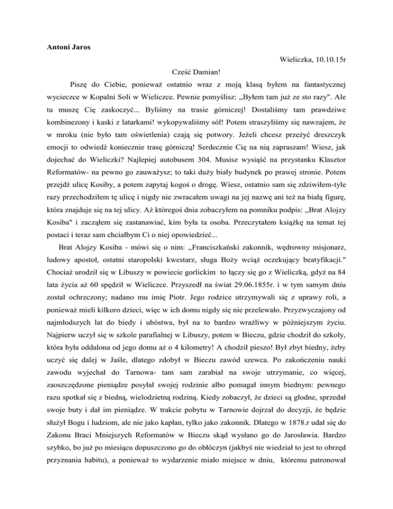 Antoni Jaros Wieliczka, 10.10.15r Cześć Damian! Piszę do Ciebie, ponieważ ostatnio wraz z moją klasą byłem na fantastycznej wycieczce w Kopalni Soli w Wieliczce. Pewnie pomyślisz: ,,Byłem tam już ze sto razy". Ale tu muszę Cię zaskoczyć... Byliśmy na trasie górniczej! Dostaliśmy tam prawdziwe kombinezony i kaski z latarkami! wykopywaliśmy sól! Potem straszyliśmy się nawzajem, że w mroku (nie było tam oświetlenia) czają się potwory. Jeżeli chcesz przeżyć dreszczyk emocji to odwiedź koniecznie trasę górniczą! Serdecznie Cię na nią zapraszam! Wiesz, jak dojechać do Wieliczki? Najlepiej autobusem 304. Musisz wysiąść na przystanku Klasztor Reformatów- na pewno go zauważysz; to taki duży biały budynek po prawej stronie. Potem przejdź ulicę Kosiby, a potem zapytaj kogoś o drogę. Wiesz, ostatnio sam się zdziwiłem-tyle razy przechodziłem tę ulicę i nigdy nie zwracałem uwagi na jej nazwę ani też na białą figurę, która znajduje się na tej ulicy. Aż któregoś dnia zobaczyłem na pomniku podpis: ,,Brat Alojzy Kosiba" i zacząłem się zastanawiać, kim była ta osoba. Przeczytałem książkę na temat tej postaci i teraz sam chciałbym Ci o niej opowiedzieć... Brat Alojzy Kosiba - mówi się o nim: ,,Franciszkański zakonnik, wędrowny misjonarz, ludowy apostoł, ostatni staropolski kwestarz, sługa Boży wciąż oczekujący beatyfikacji." Chociaż urodził się w Libuszy w powiecie gorlickim to łączy się go z Wieliczką, gdyż na 84 lata życia aż 60 spędził w Wieliczce. Przyszedł na świat 29.06.1855r. i w tym samym dniu został ochrzczony; nadano mu imię Piotr. Jego rodzice utrzymywali się z uprawy roli, a ponieważ mieli kilkoro dzieci, więc w ich domu nigdy się nie przelewało. Przyzwyczajony od najmłodszych lat do biedy i ubóstwa, był na to bardzo wrażliwy w późniejszym życiu. Najpierw uczył się w szkole parafialnej w Libuszy, potem w Bieczu, gdzie chodził do szkoły, która była oddalona od jego domu aż o 4 kilometry! A chodził pieszo! Był zbyt biedny, żeby uczyć się dalej w Jaśle, dlatego zdobył w Bieczu zawód szewca. Po zakończeniu nauki zawodu wyjechał do Tarnowa- tam sam zarabiał na swoje utrzymanie, co więcej, zaoszczędzone pieniądze posyłał swojej rodzinie albo pomagał innym biednym: pewnego razu spotkał się z biedną, wielodzietną rodziną. Kiedy zobaczył, że dzieci są głodne, sprzedał swoje buty i dał im pieniądze. W trakcie pobytu w Tarnowie dojrzał do decyzji, że będzie służył Bogu i ludziom, ale nie jako kapłan, tylko jako zakonnik. Dlatego w 1878.r udał się do Zakonu Braci Mniejszych Reformatów w Bieczu skąd wysłano go do Jarosławia. Bardzo szybko, bo już po miesiącu dopuszczono go do obłóczyn (jakbyś nie wiedział to jest to obrzęd przyznania habitu), a ponieważ to wydarzenie miało miejsce w dniu, któremu patronował święty Alojzy Gonzaga dlatego przyjął jego imię. I dlatego dziś znamy go jako Alojzego. Z klasztoru w Jarosławiu przeniesiono go do Wieliczki, ponieważ w wielickim klasztorze brakowało szewca. W wielickim klasztorze gorliwie wypełniał obowiązki brata zakonnego, bardzo dużo czasu spędzał na modlitwie i był wielkim czcicielem krzyża. Dużą część jego pracy w klasztorze wypełniała kwesta, czyli zbiórka darów przeznaczonych dla najuboższych. Wędrował od Wieliczki przez Bochnię, Dobczyce, Rabkę, Nowy Targ, aż po Zakopane. Przemieszczał się pieszo, wozem, czasem autobusem, nie zważał na upał czy niepogodę, nigdy nie okazywał zmęczenia i wszelkie trudy znosił dzielnie. Kwestował na rzecz biednych przez 61 lat i przez ten czas przeniósł na swoich plecach tysiące kilogramów darów, np.: zboże, ziemniaki, kury, kaczki, gęsi. Wszystko przekazywał na rzecz biednych, a niczego nie zatrzymywał dla siebie. Biednym starał się pomóc także dobrym słowem i modlitwą. Codziennie do furty klasztornej przychodziło ok. 20 osób, dla których na polecenie brata Alojzego gotowano posiłek, często jedyny w tym dniu. Niejednokrotnie dochodziło do sytuacji, w których oddawał swój posiłek biednym. Zmarł 4 stycznia 1939 r. Jego pogrzeb, mimo mrozu i zasp zgromadził tysiące ludzi z różnych stanów" bogatych i biednych. Jeden z współbraci zakonnych tak wspomina. ,,Wierni przychodzili do trumny jeszcze przed pogrzebem i modlili się do niego. Byli to ludzie różnego stanu, tak że pogrzeb wyglądał na manifestację. Napływ był spontaniczny, bo sługa Boży był tak znany i lubiany przez miejscową ludność." Szczątki brata Alojzego znajdują się w metalowej trumience w kaplicy Matki Bożej Łaskawej w wielickim klasztorze Ojców Reformatów. Za jego pośrednictwem ludzie doznają różnych cudów dlatego w 1963 r. biskup Karol Wojtyła rozpoczął dochodzenie o świętości Sługi Bożego Brata Alojzego Kosiby. Na terenie Wieliczki istnieje wiele dzieł kontynuujących pracę brata Alojzego, np.: Stowarzyszenie Brata Alojzego Kosiby, które prowadzi kuchnię dla potrzebujących mieszkańców, umożliwia wypoczynek biednym dzieciom oraz opiekuje się ludźmi starszymi i niepełnosprawnymi. Szkoły i przedszkola noszą imię Brata Alojzego, aby pamięć o jego życiu i czynach nie zaginęła. Mam nadzieję, że zachęciłem Cię do bliższego poznania tej niezwykłej postaci. W wielickim klasztorze możesz także obejrzeć miejsca związane z Bratem Alojzym np.: celę, gdzie mieszkał, przedmioty, których używał: sandały, kropidło różaniec, modlitewnik i inne. Pozdrawiam, Antek kl. V SP159 Sióstr Urszulanek URz w Krakowie Bibliografia: Brat Alojzy Kosiba Czciciel Księżnej Wieliczki, Wieliczka 2015 (Praca zbiorowa pod patronatem Miasta i Gminy Wieliczka) Brat Alojzy Kosiba Kwestarz- Sługa Ubogich, Wieliczka 2013 (Praca zbiorowa pod patronatem Miasta i Gminy Wieliczka)