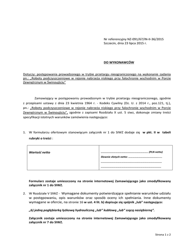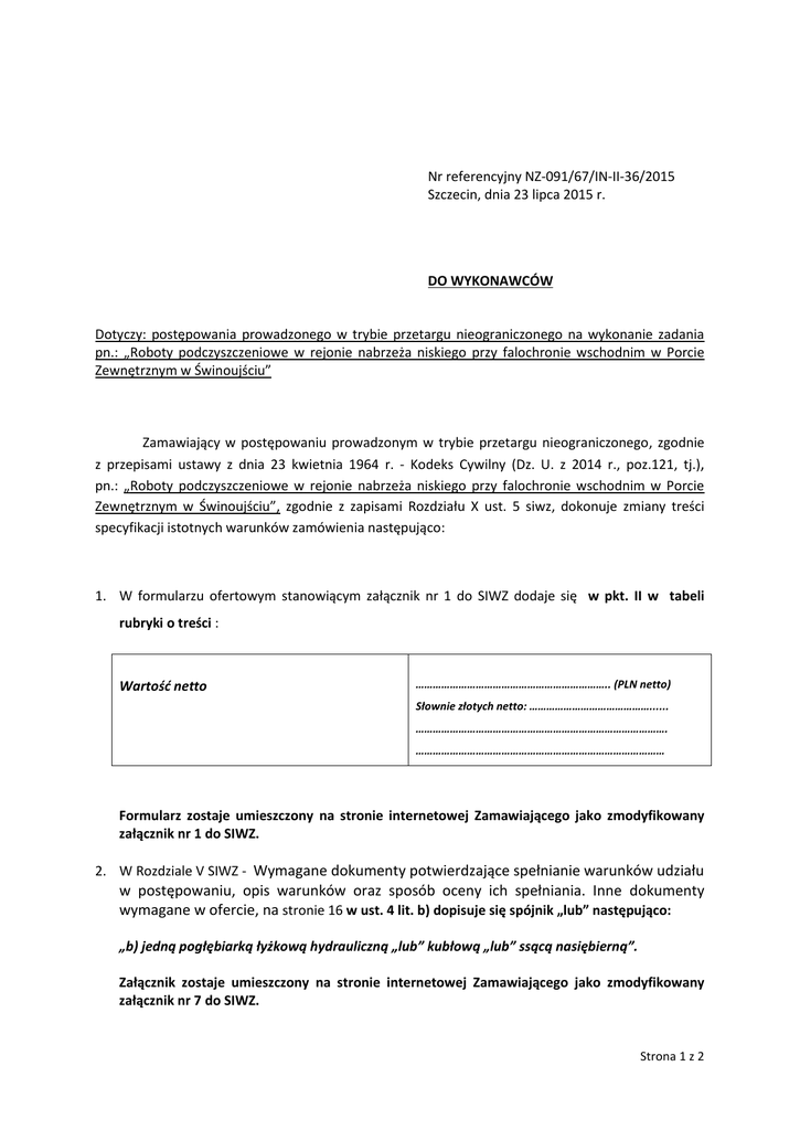 Nr referencyjny NZ-091/67/IN-II-36/2015 Szczecin, dnia 23 lipca 2015 r. DO WYKONAWCÓW Dotyczy: postępowania prowadzonego w trybie przetargu nieograniczonego na wykonanie zadania pn.: „Roboty podczyszczeniowe w rejonie nabrzeża niskiego przy falochronie wschodnim w Porcie Zewnętrznym w Świnoujściu” Zamawiający w postępowaniu prowadzonym w trybie przetargu nieograniczonego, zgodnie z przepisami ustawy z dnia 23 kwietnia 1964 r. - Kodeks Cywilny (Dz. U. z 2014 r., poz.121, tj.), pn.: „Roboty podczyszczeniowe w rejonie nabrzeża niskiego przy falochronie wschodnim w Porcie Zewnętrznym w Świnoujściu”, zgodnie z zapisami Rozdziału X ust. 5 siwz, dokonuje zmiany treści specyfikacji istotnych warunków zamówienia następująco: 1. W formularzu ofertowym stanowiącym załącznik nr 1 do SIWZ dodaje się w pkt. II w tabeli rubryki o treści : Wartość netto ………………………………………………………….. (PLN netto) Słownie złotych netto: ……………………………………...... ……………………………………………………………………………. …………………………………………………………………………… Formularz zostaje umieszczony na stronie internetowej Zamawiającego jako zmodyfikowany załącznik nr 1 do SIWZ. 2. W Rozdziale V SIWZ - Wymagane dokumenty potwierdzające spełnianie warunków udziału w postępowaniu, opis warunków oraz sposób oceny ich spełniania. Inne dokumenty wymagane w ofercie, na stronie 16 w ust. 4 lit. b) dopisuje się spójnik „lub” następująco: „b) jedną pogłębiarką łyżkową hydrauliczną „lub” kubłową „lub” ssącą nasiębierną”. Załącznik zostaje umieszczony na stronie internetowej Zamawiającego jako zmodyfikowany załącznik nr 7 do SIWZ. Strona 1 z 2 3. § 7 ust. 1 projektu umowy otrzymuje brzmienie: „Zabezpieczenie należytego wykonania umowy w wysokości 5 % wartości umownej brutto stanowi kwotę …………………………………. i zostaje wniesione w formie ………………………. Zabezpieczenie należytego wykonania umowy zostało ustanowione nie później niż w dniu zawarcia niniejszej umowy. Zabezpieczenie należytego wykonania umowy bezwarunkowe, nieodwołalne i płatne na każde żądanie obejmuje okres od daty podpisania umowy do 30 dnia po upływie terminu realizacji umowy”. Zamawiający jednocześnie informuje, że termin składania i otwarcia ofert nie ulega zmianie. Strona 2 z 2