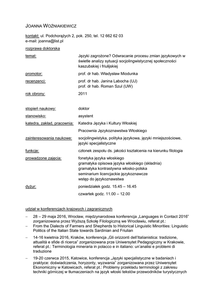 JOANNA WOŹNIAKIEWICZ kontakt: ul. Podchorążych 2, pok. 250