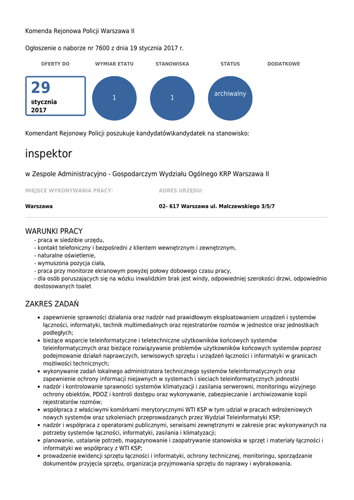 Komenda Rejonowa Policji Warszawa II Ogłoszenie o naborze nr 7600 z dnia 19 stycznia 2017 r. OFERTY DO 29 stycznia 2017 WYMIAR ETATU STANOWISKA 1 1 STATUS DODATKOWE archiwalny Komendant Rejonowy Policji poszukuje kandydatów\kandydatek na stanowisko: inspektor w Zespole Administracyjno - Gospodarczym Wydziału Ogólnego KRP Warszawa II MIEJSCE WYKONYWANIA PRACY: ADRES URZĘDU: Warszawa 02- 617 Warszawa ul. Malczewskiego 3/5/7 WARUNKI PRACY - praca w siedzibie urzędu, - kontakt telefoniczny i bezpośredni z klientem wewnętrznym i zewnętrznym, - naturalne oświetlenie, - wymuszona pozycja ciała, - praca przy monitorze ekranowym powyżej połowy dobowego czasu pracy, - dla osób poruszających się na wózku inwalidzkim brak jest windy, odpowiedniej szerokości drzwi, odpowiednio dostosowanych toalet ZAKRES ZADAŃ zapewnienie sprawności działania oraz nadzór nad prawidłowym eksploatowaniem urządzeń i systemów łączności, informatyki, technik multimedialnych oraz rejestratorów rozmów w jednostce oraz jednostkach podległych; bieżące wsparcie teleinformatyczne i teletechniczne użytkowników końcowych systemów teleinformatycznych oraz bieżące rozwiązywanie problemów użytkowników końcowych systemów poprzez podejmowanie działań naprawczych, serwisowych sprzętu i urządzeń łączności i informatyki w granicach możliwości technicznych; wykonywanie zadań lokalnego administratora technicznego systemów teleinformatycznych oraz zapewnienie ochrony informacji niejawnych w systemach i sieciach teleinformatycznych jednostki nadzór i kontrolowanie sprawności systemów klimatyzacji i zasilania serwerowni, monitoringu wizyjnego ochrony obiektów, PDOZ i kontroli dostępu oraz wykonywanie, zabezpieczanie i archiwizowanie kopii rejestratorów rozmów; współpraca z właściwymi komórkami merytorycznymi WTI KSP w tym udział w pracach wdrożeniowych nowych systemów oraz szkoleniach przeprowadzanych przez Wydział Teleinformatyki KSP; nadzór i współpraca z operatorami publicznymi, serwisami zewnętrznymi w zakresie prac wykonywanych na potrzeby systemów łączności, informatyki, zasilania i klimatyzacji; planowanie, ustalanie potrzeb, magazynowanie i zaopatrywanie stanowiska w sprzęt i materiały łączności i informatyki we współpracy z WTI KSP; prowadzenie ewidencji sprzętu łączności i informatyki, ochrony technicznej, monitoringu, sporządzanie dokumentów przyjęcia sprzętu, organizacja przyjmowania sprzętu do naprawy i wybrakowania. WYMAGANIA NIEZBĘDNE Wykształcenie: średnie doświadczenie zawodowe: - 6 miesięcy doświadczenia zawodowego w komórce logistycznej; znajomość systemów i aplikacji informatycznych; znajomość pracy na komputerze; komunikatywność; umiejętność organizacji pracy własnej; umiejętności interpersonalne na poziomie podstawowym; dostęp do informacji niejawnych oznaczonych klauzulą "poufne" lub zgoda na przeprowadzenie postępowania sprawdzającego Posiadanie obywatelstwa polskiego Korzystanie z pełni praw publicznych Nieskazanie prawomocnym wyrokiem za umyślne przestępstwo lub umyślne przestępstwo skarbowe DOKUMENTY I OŚWIADCZENIA NIEZBĘDNE Życiorys/CV i list motywacyjny Kopie dokumentów potwierdzających spełnienie wymagania niezbędnego w zakresie wykształcenia Kopie dokumentów potwierdzających spełnienie wymagania niezbędnego w zakresie doświadczenia zawodowego / stażu pracy kopia poświadczenia bezpieczeństwa uprawniającego do dostępu do informacji niejawnych oznaczonych klauzulą "poufne" lub oświadczenie o wyrażeniu zgody na przeprowadzenie postępowania sprawdzającego zgodnie z ustawą z dnia 5 sierpnia 2010 r. o ochronie informacji niejawnych (Dz. U. nr 182, poz. 1228) Oświadczenie o posiadaniu obywatelstwa polskiego albo kopia dokumentu potwierdzającego posiadanie polskiego obywatelstwa Oświadczenie o wyrażeniu zgody na przetwarzanie danych osobowych do celów naboru Oświadczenie o korzystaniu z pełni praw publicznych Oświadczenie o nieskazaniu prawomocnym wyrokiem za umyślne przestępstwo lub umyślne przestępstwo skarbowe TERMINY I MIEJSCE SKŁADANIA DOKUMENTÓW Dokumenty należy złożyć do: 29 stycznia 2017 r. Decyduje data: stempla pocztowego / osobistego dostarczenia oferty do urzędu Miejsce składania dokumentów: Komenda Rejonowa Policji Warszawa II ul. Malczewskiego 3/5/7 02- 617 Warszawa z dopiskiem na kopercie i w liście motywacyjnym numeru ogłoszenia oraz nazwy stanowiska pracy INNE INFORMACJE: W miesiącu poprzedzającym datę upublicznienia ogłoszenia wskaźnik zatrudnienia osób niepełnosprawnych w urzędzie, w rozumieniu przepisów o rehabilitacji zawodowej i społecznej oraz zatrudnianiu osób niepełnosprawnych, wynosi co najmniej 6%. Uposażenie zasadnicze - 2.265,10 zł wg mnożnika 1,2088 kwoty bazowej. Zatrudnienie nowego pracownika w Komendzie Rejonowej Policji Warszawa II może nastąpić po przeprowadzeniu przez Pełnomocnika Komendanta Rejonowego Policji Warszawa II ds. Ochrony Informacji Niejawnych postępowania sprawdzającego i wydaniu poświadczenia bezpieczeństwa lub po potwierdzeniu faktu wydania i ważności poświadczenia bezpieczeństwa w przypadku legitymowania się poświadczeniem bezpieczeństwa wydanym przez inny uprawniony podmiot. oferty, które nie spełniają wymogów formalnych oraz przesłane po terminie nie będą brane pod uwagę (liczy się data stempla pocztowego). Życiorys, list motywacyjny oraz oświadczenia muszą być podpisane własnoręcznie. Kandydaci zakwalifikowani zostaną poinformowani o terminie kolejnego etapu selekcji na stronie www.mokotow.policja.waw.pl Techniki i metody naboru: weryfikacja formalna nadesłanych ofert, rozmowa kwalifikacyjna. Nie zwracamy nadesłanych dokumentów. Informacje dodatkowe można uzyskać pod nr tel. 22 60 392 43. Legenda Pierwszeństwo dla osób z niepełnosprawnościami Ogłoszenie z tym symbolem oznacza, że pierwszeństwo w zatrudnieniu mają osoby z niepełnosprawno