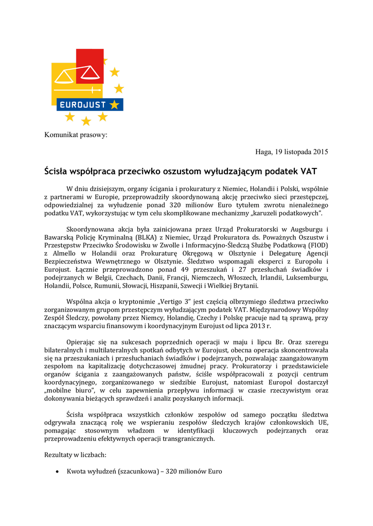 Komunikat prasowy: Haga, 19 listopada 2015 Ścisła współpraca przeciwko oszustom wyłudzającym podatek VAT W dniu dzisiejszym, organy ścigania i prokuratury z Niemiec, Holandii i Polski, wspólnie z partnerami w Europie, przeprowadziły skoordynowaną akcję przeciwko sieci przestępczej, odpowiedzialnej za wyłudzenie ponad 320 milionów Euro tytułem zwrotu nienależnego podatku VAT, wykorzystując w tym celu skomplikowane mechanizmy „karuzeli podatkowych”. Skoordynowana akcja była zainicjowana przez Urząd Prokuratorski w Augsburgu i Bawarską Policję Kryminalną (BLKA) z Niemiec, Urząd Prokuratora ds. Poważnych Oszustw i Przestępstw Przeciwko Środowisku w Zwolle i Informacyjno-Śledczą Służbę Podatkową (FIOD) z Almello w Holandii oraz Prokuraturę Okręgową w Olsztynie i Delegaturę Agencji Bezpieczeństwa Wewnętrznego w Olsztynie. Śledztwo wspomagali eksperci z Europolu i Eurojust. Łącznie przeprowadzono ponad 49 przeszukań i 27 przesłuchań świadków i podejrzanych w Belgii, Czechach, Danii, Francji, Niemczech, Włoszech, Irlandii, Luksemburgu, Holandii, Polsce, Rumunii, Słowacji, Hiszpanii, Szwecji i Wielkiej Brytanii. Wspólna akcja o kryptonimie „Vertigo 3” jest częścią olbrzymiego śledztwa przeciwko zorganizowanym grupom przestępczym wyłudzającym podatek VAT. Międzynarodowy Wspólny Zespół Śledczy, powołany przez Niemcy, Holandię, Czechy i Polskę pracuje nad tą sprawą, przy znaczącym wsparciu finansowym i koordynacyjnym Eurojust od lipca 2013 r. Opierając się na sukcesach poprzednich operacji w maju i lipcu Br. Oraz szeregu bilateralnych i multilateralnych spotkań odbytych w Eurojust, obecna operacja skoncentrowała się na przeszukaniach i przesłuchaniach świadków i podejrzanych, pozwalając zaangażowanym zespołom na kapitalizację dotychczasowej żmudnej pracy. Prokuratorzy i przedstawiciele organów ścigania z zaangażowanych państw, ściśle współpracowali z pozycji centrum koordynacyjnego, zorganizowanego w siedzibie Eurojust, natomiast Europol dostarczył „mobilne biuro”, w celu zapewnienia przepływu informacji w czasie rzeczywistym oraz dokonywania bieżących sprawdzeń i analiz pozyskanych informacji. Ścisła współpraca wszystkich członków zespołów od samego początku śledztwa odgrywała znaczącą rolę we wspieraniu zespołów śledczych krajów członkowskich UE, pomagając stosownym władzom w identyfikacji kluczowych podejrzanych oraz przeprowadzeniu efektywnych operacji transgranicznych. Rezultaty w liczbach: • Kwota wyłudzeń (szacunkowa) – 320 milionów Euro • • Liczba przeszukań – >49 Liczba przesłuchanych świadków / podejrzanych - >27 For interviews and further information, please contact: EUROJUST Ulf Bergström Head of Communications and External Relations Press & PR Service Tel: +31 70 412 5508 E-mail: [email protected] For all Eurojust press releases, please see www.eurojust.europa.eu (Press centre) EUROPOL Europol Corporate Communications Tel: +31 70 302 5001 [email protected]