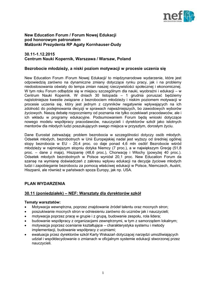 New Education Forum / Forum Nowej Edukacji pod honorowym patronatem Małżonki Prezydenta RP Agaty Kornhauser-Dudy 30.11-1.12.2015 Centrum Nauki Kopernik, Warszawa / Warsaw, Poland Bezrobocie młodzieży, a niski poziom motywacji w procesie uczenia się New Education Forum /Forum Nowej Edukacji/ to międzynarodowe wydarzenie, które jest odpowiedzią zarówno na dynamiczne zmiany dotyczące rynku pracy, jak i na problemy niedostosowania oświaty do tempa zmian naszej rzeczywistości społecznej i ekonomicznej. W tym roku Forum odbędzie się w miejscu szczególnym dla nauki, wyobraźni i edukacji – w Centrum Nauki Kopernik. W dniach 30 listopada – 1 grudnia poruszać będziemy najistotniejsze kwestie związane z bezrobociem młodzieży i niskim poziomem motywacji w procesie uczenia się, który jest jednym z czynników negatywnie wpływających na ich zdolność do podejmowania decyzji w sprawach najważniejszych, bo zawodowych wyborów życiowych. Naszą debatę rozpoczniemy od poznania nie tylko oczekiwań pracodawców, ale i ich wkładu w programy edukacyjne. Podsumowaniem Forum będą wnioski dotyczące nowego modelu współpracy pracodawców, nauczycieli i dyrektorów szkół jako istotnych mentorów dla młodych ludzi poszukujących swego miejsca w przyszłym, dorosłym życiu. Dane Eurostat zatrważają: problem bezrobocia w szczególności dotyczy osób młodych. Odsetek młodych, bezrobotnych w Unii Europejskiej nadal jest wyższy od średniej ogólnej stopy bezrobocia w EU - 20,4 proc. co daje ponad 4,6 mln osób! Bezrobocie wśród młodzieży w najmniejszym stopniu dotyka Niemcy (7 proc.), a w największym Grecję (51,8 proc. – dane z maja), Hiszpanię (48,6 proc.), Chorwację i Włochy (powyżej 40 proc.). Odsetek młodych bezrobotnych w Polsce wyniósł 20,1 proc. New Education Forum da szansę na wymianę doświadczeń z zakresu wpływu edukacji na decyzje życiowe młodych ludzi i zapobieganie bezrobociu za pomocą właściwej edukacji w Polsce, Niemczech, Austrii, Hiszpanii, ale również w państwach spoza Europy, jak np. USA. PLAN WYDARZENIA 30.11 (poniedziałek) – NEF: Warsztaty dla dyrektorów szkół Tematy warsztatów: Motywacja wewnętrzna, poprzez znajdowanie źródeł talentu oraz mocnych stron; poszukiwanie mocnych stron w odniesieniu zarówno do uczniów jak i nauczycieli; motywacja poprzez pracę w grupie i z grupą, budowanie zespołu, rola lidera; budowanie współpracy z organizacjami zewnętrznymi, w tym z samorządem lokalnym; motywacja poprzez ocenianie kształtujące – charakterystyka systemu i metody implementacji, budowanie współpracy z uczniami; ewaluacja przez dyrektorów szkół Karty Wskazań dotyczącej narzędzi umożliwiających udział i współdecydowanie o zmianach w oficjalnym systemie edukacji stworzonej przez nauczycieli. 1 1.12.2015 (wtorek) – NEF: Forum Nowej Edukacji Konferencja 8.30 Rejestracja 9.15 Networking: okrągły stół dyrektorów szkół i instytucji wspierających edukację – wspólne stanowisko w sprawie Karty Wskazań; zwiedzanie Centrum Nauki Kopernik (dla nauczycieli – mentorów); warsztaty dla dyrektorów szkół „Jak wspierać odkrywców? Programy Centrum Nauki Kopernik i Krajowego Funduszu na rzecz Dzieci sprzyjające rozwijaniu zainteresowań i uzdolnień uczniów”; strefa networkingowa – prezentacja programów dla szkół. 11.00 Otwarcie New Education Forum przez Izabelę Rakuć-Kochaniak (Fundacja PZU) i Joannę Bochniarz (Centrum Innowacyjnej Edukacji). 11.15 Key Note Speech Komisarza EU Tibora Navracsicsa o istotnej roli edukacji w przeciwdziałaniu bezrobociu wśród młodych ludzi. 11.30 Panel I – DIAGNOZA: kto przychodzi na rynek pracy i czego mu brakuje, jak możemy wpływać na młodzież na ostatnim etapie edukacji (dyskusja) Rozwinięcie: Jakie kompetencje miękkie powinien posiadać każdy młody człowiek wchodząc na rynek pracy? Bezrobocie młodych na świecie: które rozwiązania najlepiej poradziły sobie z tym problemem? Edukacja zorientowana na rynek pracy. Jak można skutecznie dotrzeć do młodych ludzi, wykształcić ich i z sukcesem wprowadzić na rynek pracy? Jak można zainspirować młodzież? Paneliści: Marcin Barański, Dyrektor Generalny, VOX Meble i Składy VOX Patricia Gonzalez, Dyrektor Zarządzająca, Grupo Femxa, Hiszpania Monika Lamparska-Przybysz, Scientific and Funding Access Manager, Polpharma 12.30 Panel II – PRÓBY: motywacyjne metody pracy z uczniem sprawdzone w już działających programach (dyskusja) Rozwinięcie: Na czym polega sukces motywacyjnych programów edukacyjnych? Jakie elementy tych programów można już w tym momencie wprowadzić do obecnego systemu edukacji i w jaki sposób to zrobić? Paneliści: Krystyna Boczkowska, Prezes Zarządu, BOSCH Polska Gary Crow, Prodziekan, Indiana University School of Education, USA Claudia Parliament, Profesor, Board of Directors, Minnesota Council of Economic Education, USA Andreas Riepl, doradca w Federalnym Ministerstwie Edukacji Austrii; COOL-Impulse-Centre, Vocational Schools, Austria 2 13.30 Przerwa obiadowa. 14.20 Podsumowanie programu MENTOR i wręczenie dyplomów z ukończenia warsztatów MENTOR, prezentacja Karty Wskazań. 14.50 Wystąpienie Michała Federowicza, Dyrektora Instytutu Badań Edukacyjnych 15.00 Panel III – ROZWIĄZANIE: Jak sprawdzone, jeśli chodzi o potencjał motywacyjny, programy edukacyjne wywodzące się z biznesu lub organizacji pozarządowych można i należy wprowadzać do szkół? Jaka jest w tym rola dyrekcji i nauczycieli? Rozwinięcie: Rola mentoringu jako innowacyjnej metody. Jak stworzyć niezbędną przestrzeń dla kreatywnych działań nauczycieli realizujących postawę wyjścia naprzeciw uczniowi, jego talentom, ambicjom, potrzebom? Potrzeba Karty Wskazań. Oczekiwana rola EU i MEN w rozpowszechnianiu i wykorzystywaniu na szerszą skalę najlepszych programów edukacyjnych. Paneliści: Dominika Bettman, Członek Zarząd ds Finansowych, Siemens Polska Dia