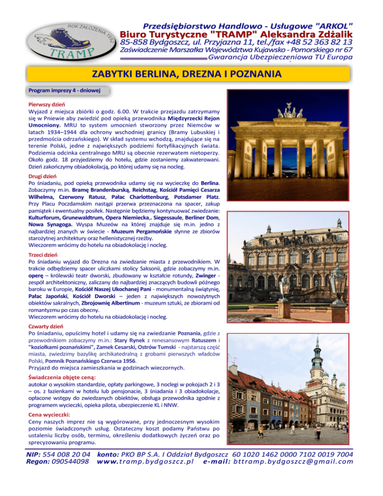 ZABYTKI BERLINA, DREZNA I POZNANIA Program imprezy 4 - dniowej Pierwszy dzień Wyjazd z miejsca zbiórki o godz. 6.00. W trakcie przejazdu zatrzymamy się w Pniewie aby zwiedzić pod opieką przewodnika Międzyrzecki Rejon Umocniony. MRU to system umocnień stworzony przez Niemców w latach 1934–1944 dla ochrony wschodniej granicy (Bramy Lubuskiej i przedmościa odrzańskiego). W skład systemu wchodzą, znajdujące się na terenie Polski, jedne z największych podziemi fortyfikacyjnych świata. Podziemia odcinka centralnego MRU są obecnie rezerwatem nietoperzy. Około godz. 18 przyjedziemy do hotelu, gdzie zostaniemy zakwaterowani. Dzień zakończymy obiadokolacją, po której udamy się na nocleg. Drugi dzień Po śniadaniu, pod opieką przewodnika udamy się na wycieczkę do Berlina. Zobaczymy m.in. Bramę Brandenburską, Reichstag, Kościół Pamięci Cesarza Wilhelma, Czerwony Ratusz, Pałac Charlottenburg, Potsdamer Platz. Przy Placu Poczdamskim nastąpi przerwa przeznaczona na spacer, zakup pamiątek i ewentualny posiłek. Następnie będziemy kontynuować zwiedzanie: Kulturforum, Grunewaldtrum, Opera Niemiecka,. Siegessaule, Berliner Dom, Nowa Synagoga. Wyspa Muzeów na której znajduje się m.in. jedno z najbardziej znanych w świecie - Muzeum Pergamońskie słynne ze zbiorów starożytnej architektury oraz hellenistycznej rzeźby. Wieczorem wrócimy do hotelu na obiadokolację i nocleg. Trzeci dzień Po śniadaniu wyjazd do Drezna na zwiedzanie miasta z przewodnikiem. W trakcie odbędziemy spacer uliczkami stolicy Saksonii, gdzie zobaczymy m.in. operę – królewski teatr dworski, zbudowany w kształcie rotundy, Zwinger zespół architektoniczny, zaliczany do najbardziej znaczących budowli późnego baroku w Europie, Kościół Naszej Ukochanej Pani - monumentalną świątynię, Pałac Japoński, Kościół Dworski – jeden z największych nowożytnych obiektów sakralnych, Zbrojownię Albertinum - muzeum sztuki, ze zbiorami od romantyzmu po czas obecny. Wieczorem wrócimy do hotelu na obiadokolację i nocleg. Czwarty dzień Po śniadaniu, opuścimy hotel i udamy się na zwiedzanie Poznania, gdzie z przewodnikiem zobaczymy m.in.: Stary Rynek z renesansowym Ratuszem i "koziołkami poznańskimi", Zamek Cesarski, Ostrów Tumski - najstarszą część miasta, zwiedzimy bazylikę archikatedralną z grobami pierwszych władców Polski, Pomnik Poznańskiego Czerwca 1956. Przyjazd do miejsca zamieszkania w godzinach wieczornych. Świadczenia objęte ceną: autokar o wysokim standardzie, opłaty parkingowe, 3 noclegi w pokojach 2 i 3 – os. z łazienkami w hotelu lub pensjonacie, 3 śniadania i 3 obiadokolacje, opłacone wstępy do zwiedzanych obiektów, obsługa przewodnika zgodnie z programem wycieczki, opieka pilota, ubezpieczenie KL i NNW. Cena wycieczki: Ceny naszych imprez nie są wygórowane, przy jednoczesnym wysokim poziomie świadczonych usług. Ostateczny koszt podamy Państwu po ustaleniu liczby osób, terminu, określeniu dodatkowych życzeń oraz po sprecyzowaniu programu.