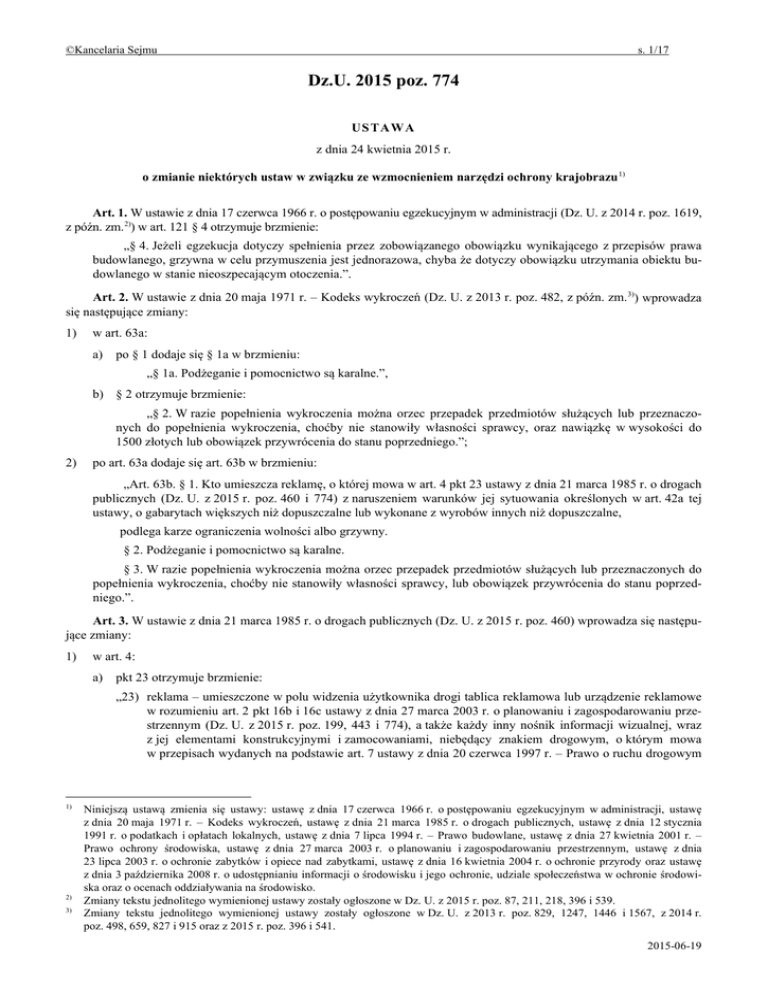 ©Kancelaria Sejmu s. 1/17 Dz.U. 2015 poz. 774 US T AW A z dnia 24 kwietnia 2015 r. o zmianie niektórych ustaw w związku ze wzmocnieniem narzędzi ochrony krajobrazu 1) Art. 1. W ustawie z dnia 17 czerwca 1966 r. o postępowaniu egzekucyjnym w administracji (Dz. U. z 2014 r. poz. 1619, z późn. zm. 2)) w art. 121 § 4 otrzymuje brzmienie: „§ 4. Jeżeli egzekucja dotyczy spełnienia przez zobowiązanego obowiązku wynikającego z przepisów prawa budowlanego, grzywna w celu przymuszenia jest jednorazowa, chyba że dotyczy obowiązku utrzymania obiektu budowlanego w stanie nieoszpecającym otoczenia.”. Art. 2. W ustawie z dnia 20 maja 1971 r. – Kodeks wykroczeń (Dz. U. z 2013 r. poz. 482, z późn. zm. 3)) wprowadza się następujące zmiany: 1) w art. 63a: a) po § 1 dodaje się § 1a w brzmieniu: „§ 1a. Podżeganie i pomocnictwo są karalne.”, b) § 2 otrzymuje brzmienie: „§ 2. W razie popełnienia wykroczenia można orzec przepadek przedmiotów służących lub przeznaczonych do popełnienia wykroczenia, choćby nie stanowiły własności sprawcy, oraz nawiązkę w wysokości do 1500 złotych lub obowiązek przywrócenia do stanu poprzedniego.”; 2) po art. 63a dodaje się art. 63b w brzmieniu: „Art. 63b. § 1. Kto umieszcza reklamę, o której mowa w art. 4 pkt 23 ustawy z dnia 21 marca 1985 r. o drogach publicznych (Dz. U. z 2015 r. poz. 460 i 774) z naruszeniem warunków jej sytuowania określonych w art. 42a tej ustawy, o gabarytach większych niż dopuszczalne lub wykonane z wyrobów innych niż dopuszczalne, podlega karze ograniczenia wolności albo grzywny. § 2. Podżeganie i pomocnictwo są karalne. § 3. W razie popełnienia wykroczenia można orzec przepadek przedmiotów służących lub przeznaczonych do popełnienia wykroczenia, choćby nie stanowiły własności sprawcy, lub obowiązek przywrócenia do stanu poprzedniego.”. Art. 3. W ustawie z dnia 21 marca 1985 r. o drogach publicznych (Dz. U. z 2015 r. poz. 460) wprowadza się następujące zmiany: 1) w art. 4: a) pkt 23 otrzymuje brzmienie: „23) reklama – umieszczone w polu widzenia użytkownika drogi tablica reklamowa lub urządzenie reklamowe w rozumieniu art. 2 pkt 16b i 16c ustawy z dnia 27 marca 2003 r. o planowaniu i zagospodarowaniu przestrzennym (Dz. U. z 2015 r. poz. 199, 443 i 774), a także każdy inny nośnik informacji wizualnej, wraz z jej elementami konstrukcyjnymi i zamocowaniami, niebędący znakiem drogowym, o którym mowa w przepisach wydanych na podstawie art. 7 ustawy z dnia 20 czerwca 1997 r. – Prawo o ruchu drogowym 1) 2) 3) Niniejszą ustawą zmienia się ustawy: ustawę z dnia 17 czerwca 1966 r. o postępowaniu egzekucyjnym w administracji, ustawę z dnia 20 maja 1971 r. – Kodeks wykroczeń, ustawę z dnia 21 marca 1985 r. o drogach publicznych, ustawę z dnia 12 stycznia 1991 r. o podatkach i opłatach lokalnych, ustawę z dnia 7 lipca 1994 r. – Prawo budowlane, ustawę z dnia 27 kwietnia 2001 r. – Prawo ochrony środowiska, ustawę z dnia 27 marca 2003 r. o planowaniu i zagospodarowaniu przestrzennym, ustawę z dnia 23 lipca 2003 r. o ochronie zabytków i opiece nad zabytkami, ustawę z dnia 16 kwietnia 2004 r. o ochronie przyrody oraz ustawę z dnia 3 października 2008 r. o udostępnianiu informacji o środowisku i jego ochronie, udziale społeczeństwa w ochronie środowiska oraz o ocenach oddziaływania na środowisko. Zmiany tekstu jednolitego wymienionej ustawy zostały ogłoszone w Dz. U. z 2015 r. poz. 87, 211, 218, 396 i 539. Zmiany tekstu jednolitego wymienionej ustawy zostały ogłoszone w Dz. U. z 2013 r. poz. 829, 1247, 1446 i 1567, z 2014 r. poz. 498, 659, 827 i 915 oraz z 2015 r. poz. 396 i 541. 2015-06-19 ©Kancelaria Sejmu s. 2/17 (Dz. U. z 2012 r. poz. 1137, z późn. zm. 4)), ustawionym przez gminę znakiem informującym o obiektach zlokalizowanych przy drodze, w tym obiektach użyteczności publicznej, znakiem informującym o formie ochrony zabytków lub tablicą informacyjną o nazwie formy ochrony przyrody w rozumieniu art. 115 ustawy z dnia 16 kwietnia 2004 r. o ochronie przyrody (Dz. U. z 2013 r. poz. 627, z późn. zm. 5));”, b) pkt 25 otrzymuje brzmienie: „25) pojazd nienormatywny – pojazd lub zespół pojazdów w rozumieniu art. 2 pkt 35a ustawy z dnia 20 czerwca 1997 r. – Prawo o ruchu drogowym;”; 2) w art. 22 po ust. 2b dodaje się ust. 2c i 2d w brzmieniu: „2c. W granicach miast na prawach powiatu tablice reklamowe i urządzenia reklamowe mogą być umieszczane na gruntach, o których mowa w ust. 1, na podstawie odpłatnej umowy cywilnoprawnej w wypadkach uzasadnionych względami funkcjonalnymi, w szczególności wówczas gdy takie tablice lub urządzenia są umieszczone na wiatach przystankowych lub obiektach małej architektury. 2d. Wartość świadczeń pieniężnych lub niepieniężnych przysługujących zarządowi dróg w sytuacji, o której mowa w ust. 2c, nie może być niższa niż wysokość opłaty za zajęcie pasa drogowego, która miałaby zastosowanie w przypadku danej tablicy reklamowej lub urządzenia reklamowego umieszczanych na podstawie decyzji, o której mowa w art. 40 ust. 1.”; 3) art. 36 otrzymuje brzmienie: „Art. 36. W przypadku zajęcia pasa drogowego bez zezwolenia zarządcy drogi lub niezgodnie z warunkami podanymi w tym zezwoleniu, lub bez zawarcia odpłatnej umowy cywilnoprawnej, o której mowa w art. 22 ust. 2, 2a lub 2c, lub niezgodnie z warunkami tej umowy, właściwy zarządca drogi orzeka, w drodze decyzji administracyjnej, o jego przywróceniu do stanu poprzedniego. Przepisu tego nie stosuje się w przypadku zajęcia pasa drogowego bez zezwolenia zarządcy drogi lub niezgodnie z warunkami podanymi w tym zezwoleniu, wymagającego podjęcia przez właściwy organ nadzoru budowlanego decyzji o rozbiórce obiektu budowlanego.”; 4) w art. 39: a) w ust. 1 pkt 5 otrzymuje brzmienie: „5) umieszczania reklam: a) imitujących znaki i sygnały drogowe oraz urządzenia bezpieczeństwa ruc