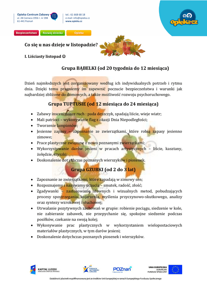 Opieka Centrum Zabawy tel.: 61 668 68 18 ul. 28 Czerwca 1956 r. nr 398 61-441 Poznań e-mail: [email protected] www.opieka.cz Co się u nas dzieje w listopadzie? I. Liściasty listopad Grupa BĄBELKI (od 20 tygodnia do 12 miesiąca) Dzień najmłodszych jest zorganizowany według ich indywidualnych potrzeb i rytmu dnia. Dzięki temu pragniemy im zapewnić poczucie bezpieczeństwa i warunki jak najbardziej zbliżone do domowych, a także możliwość rozwoju psychoruchowego. Grupa TUPTUSIE (od 12 miesiąca do 24 miesiąca) Zabawy inscenizujące ruch : pada deszczyk, spadają liście, wieje wiatr; Mali patrioci – wykonywanie flag z okazji Dnia Niepodległości; Tworzenie lampionów; Jesienne zapasy – zapoznanie ze zwierzątkami, które robią zapasy jesienno zimowe; Prace plastyczne związane z nowo poznanymi zwierzątkami; Wykorzystywanie darów jesieni w pracach artystycznych – liście, kasztany, żołędzie, szyszki; Doskonalenie dot ychczas poznanych wierszyków i piosenek. Grupa GZUBKI (od 2 do 3 lat) Zapoznanie ze zwierzątkami, które zapadają w zimowy sen; Rozpoznajemy i nazywamy uczucia – smutek, radość, złość; Zgadywanki – zastosowanie słownych i wizualnych metod, pobudzających procesy spostrzegania, kojarzenia, myślenia przyczynowo-skutkowego, analizy oraz syntezy wzrokowej i słuchowej; Utrwalanie pozytywnych zachowań w grupie: robienie pociągu, siedzenie w kole, nie zabieranie zabawek, nie przepychanie się, spokojne siedzenie podczas posiłków, czekanie na swoją kolej; Wykonywanie prac plastycznych w wykorzystaniem wielopostaciowych materiałów plastycznych, w tym darów jesieni; Doskonalenie dotychczas poznanych piosenek i wierszyków. Opieka Centrum Zabawy tel.: 61 668 68 18 ul. 28 Czerwca 1956 r. nr 398 61-441 Poznań e-mail: [email protected] www.opieka.cz II. Ruch to zdrowie: Pokonywanie torów przeszkód z wykorzystaniem elementów o różnej płaszczyźnie, wielkości i kształcie; Rozwijanie motoryki dużej oraz prawidłowości w postawie ciała poprzez zindywidualizowane ćwiczenia gimnastyczne; Zajęcia ruchowe przy muzyce – taniec. III. Czynności samoobsługowe: Wspieranie procesu kształtowania nawyków higienicznych i prozdrowotnych; Nauka sygnalizowania potrzeb fizjologicznych; Ćwiczenie samodzielnego jedzenia i picia; Ubieramy się na zimę – nauka samodzielnego ubierania się. IV. Listopadowy kalendarz: 3 listopada – Święto Myśliwych 5 listopada- Dzień postaci z bajek 11 listopada – Narodowe Święto Niepodległości 10 listopada- Dzień Jeża 12 listopada- Światowy dzień bicia rekordów 14 listopada – Dzień Króla Juliana 21 listopada- Światowy dzień życzliwości 22 listopada – Dzień Kredki 24 listopada- Dzień Buraka 25 listopada- Dzień Pluszowego Misia i Dzień Kolejarza Opieka Centrum Zabawy tel.: 61 668 68 18 ul. 28 Czerwca 1956 r. nr 398 61-441 Poznań e-mail: [email protected] www.opieka.cz PIOSENKI I WIERSZYKI, KTÓRYCH SIĘ UCZYMY 1. Idzie, idzie jeż ten kłujący zwierz. Nóżkami tup, tup i pod listek - siup! Jeżu, jeżu nasz skąd igiełki masz? Jeżu, jeżu nasz skąd igiełki masz? 2. Spójrzcie na Jasia, co za chudzina, słaby, mizerny, ponura mina, a inny chłopcy silni jak słonie, każdy gra w piłkę lepiej niż Boniek. mówione: dlaczego Jasio wciąż mizernieje, bo to głuptasek, witamin nie je ref.: Witaminki witaminki, dla chłopczyka i dziewczyki, wszyscy mamy dziarskie minki, bo zjadamy witaminki. Wiśnie i śliwki, ruda marchewka, grusza pietruszka i kalarepka, smaczne porzeczki, słodkie maliny, to wszystko właśnie są witaminy. 3. Mały misiu dużo je – chce być silny to się wie Mały lisek dużo je – chce być sprytny to się wie Mała małpka dużo je – chce być zwinna to się wie A Ty – jeśli wszystko zjesz – będziesz Tym kim tylko chcesz! 4. Spadła gruszka do fartuszka, a za gruszką dwa jabłuszka, lecz śliweczka spaść nie chciała, bo była jeszcze niedojrzała.