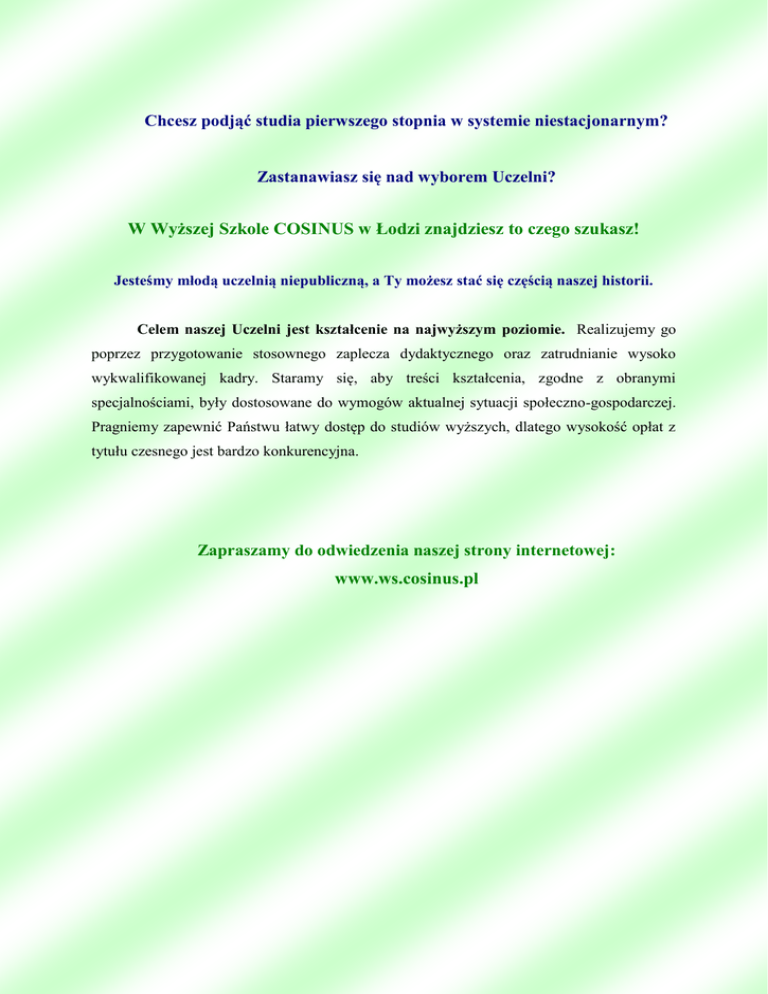 Chcesz podjąć studia pierwszego stopnia w systemie niestacjonarnym? Zastanawiasz się nad wyborem Uczelni? W Wyższej Szkole COSINUS w Łodzi znajdziesz to czego szukasz! Jesteśmy młodą uczelnią niepubliczną, a Ty możesz stać się częścią naszej historii. Celem naszej Uczelni jest kształcenie na najwyższym poziomie. Realizujemy go poprzez przygotowanie stosownego zaplecza dydaktycznego oraz zatrudnianie wysoko wykwalifikowanej kadry. Staramy się, aby treści kształcenia, zgodne z obranymi specjalnościami, były dostosowane do wymogów aktualnej sytuacji społeczno-gospodarczej. Pragniemy zapewnić Państwu łatwy dostęp do studiów wyższych, dlatego wysokość opłat z tytułu czesnego jest bardzo konkurencyjna. Zapraszamy do odwiedzenia naszej strony internetowej: www.ws.cosinus.pl 1. SŁOWO OD REKTORA Drodzy Absolwenci, pragnę zaprosić was do podjęcia studiów w Wyższej Szkole COSINUS w Łodzi. Prowadzimy studia pierwszego stopnia na kierunku Administracja (studia licencjackie w systemie niestacjonarnym). Wyższa Szkoła COSINUS w Łodzi jest wprawdzie uczelnią młodą, jednakże znaną i cenioną w środowisku akademickim. Dbamy o wysoką jakość kształcenia m.in. w zakresie nauk prawnych, nauk o państwie i administracji; staramy się łączyć teorię z praktyką funkcjonowania administracji i wyposażyć naszych studentów w praktyczne umiejętności przydatne w pracy zawodowej. Wyższa Szkoła COSINUS w Łodzi jest uczelnią „otwartą na studenta”. Tworzymy nowoczesne programy nauczania, organizujemy praktyki w administracji publicznej i prywatnej, oferujemy dobre warunki studiowania, przyjazne środowisko oraz niskie opłaty za studia, a nawet rabaty i zwolnienia z opłat. Atrakcyjna lokalizacja Uczelni w centrum Łodzi, w sąsiedztwie innych ośrodków naukowych i akademickich, jak Politechnika Łódzka i Uniwersytet Łódzki – zapewnia przyjazną atmosferę akademicką. W celu realizacji procesu dydaktycznego Uczelnia nie tylko zatrudnia wysoko wykwalifikowaną kadrę naukowo-dydaktyczną, ale także stawia na przygotowanie zawodowe swoich studentów m.in. realizując obowiązkowy program praktyk studenckich w administracji publicznej lub instytucjach prywatnych. Studentom zdolnym i pracowitym Uczelnia zapewnia pomoc finansową. Pamiętamy także o tych osobach, które borykają się z problemami finansowymi. Wyższa Szkoła COSINUS w Łodzi posiada system pomocy finansowej dla studentów, którzy mogą otrzymać wsparcie finansowe w formie stypendium za wyniki w nauce, stypendiów socjalnych i innych form pomocy materialnej. Zapraszam na studia do Wyższej Szkoły COSINUS w Łodzi! Z wyrazami szacunku dr Beata Piotrowska 2. WŁADZE UCZELNI Rektor kieruje działalnością naukowo - dydaktyczną Uczelni i reprezentuje ją na zewnątrz. Funkcję Rektora w Wyższej Szkole COSINUS w Łodzi pełni dr Beata Piotrowska. Dziekan kieruje Wydziałem i reprezentuje go na zewnątrz. Funkcję Dziekana w Wyższej Szkole COSINUS w Łodzi pełni dr Iwona Sobczyk. Kanclerz kieruje administracją i gospodarką Uczelni. Funkcję Kanclerza w Wyższej Szkole COSINUS w Łodzi pełni mgr Anna Wojtaszek. 3. OFERTA EDUKACYJNA Naszym kandydatom proponujemy podjęcie studiów I-go stopnia w systemie niestacjonarnym na kierunku Administracja. Studia trwają 3 lata (6 semestrów). Zajęcia odbywają się w weekendy – w soboty i niedziele. Absolwenci naszej Uczelni otrzymują dyplom ukończenia studiów I – go stopnia, uzyskując tym samym tytuł licencjata. Głównym celem kształcenia na kierunku Administracja jest przygotowanie absolwenta do wypełniania funkcji urzędniczych w organach administracji rządowej i samorządowej zarówno pod względem merytorycznym, jak i etycznym. Absolwent kierunku Administracja posiada wiedzę o organach władzy publicznej i organizacji aparatu tej władzy w państwie. Jest zorientowany i rozumie procesy zachodzące w sferze administracji, rozumie jej rolę w organizacji państwa i społeczeństwa. Interpretuje zjawiska społeczne (polityczne, prawne, kulturowe, ekonomiczne). Absolwent potrafi wykorzystać podstawową wiedzę teoretyczną dla analizy poszczególnych problemów prawnych, posiada umiejętność posługiwania się aktami normatywnymi i ich interpretowania, przygotowywania decyzji administracyjnych. a także rozumie konieczność przestrzegania norm etycznych. W kształceniu na kierunku Administracja zwraca się również uwagę na nauki ekonomiczne i polityczne oraz na nabycie umiejętności posługiwania się przynajmniej jednym językiem obcym, w tym z wykorzystaniem specjalistycznego słownictwa niezbędnego w pracy urzędnika. Rozpoczynając naukę w Wyższej Szkole COSINUS w Łodzi otrzymasz legitymację studencką potwierdzającą status studenta oraz uprawniającą do zniżek w wielu instytucjach, a także na przejazdy komunikacją miejską. W ramach kierunku Administracja studenci wybierają jedną z proponowanych specjalności: Administracja samorządowa Praca i zabezpieczenia społeczne Administracja bezpieczeństwa i porządku publicznego Administracja finansów publicznych Integracja społeczna i aktywizacja zawodowa osób niepełnosprawnych Prawo i administracja dla przedsiębiorców 4. SPECJALNOŚCI Specjalność Administracja samorządowa - studia w ramach tej specjalności adresowane są do osób, które pragną w pełni profesjonalnie poznać strukturę organizacyjną administracji publicznej i zadania jednostek samorządowych. Studia pozwalają na doskonałą orientację w zagadnieniach gospodarki komunalnej i przestrzennej oraz sprawnego zarządzania instytucjami samorządu. Perspektywy zatrudnienia: jednostkach administracyjnych i gospodarczych samorządu terytorialnego, urzędach gminy/miasta, starostwach powiatowych, urzędach marszałkowskich, jednostkach pomocniczych gminy (osiedlach, dzielnicach, sołectwach). Specjalność Praca i zabezpieczenia społeczne – jej celem jest prezentacja zasadnicz