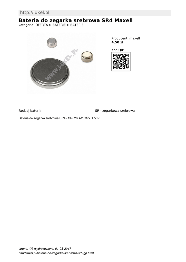 http://luxel.pl Bateria do zegarka srebrowa SR4 Maxell kategoria: OFERTA > BATERIE > BATERIE Producent: maxell 4,50 zł Kod QR: Rodzaj baterii: SR - zegarkowa srebrowa Bateria do zegarka srebrowa SR4 / SR626SW / 377 1.55V strona: 1/3 wydrukowano: 01-03-2017 http://luxel.pl/bateria-do-zegarka-srebrowa-sr5-gp.html strona: 2/3 wydrukowano: 01-03-2017 http://luxel.pl/bateria-do-zegarka-srebrowa-sr5-gp.html strona: 3/3 wydrukowano: 01-03-2017 http://luxel.pl/bateria-do-zegarka-srebrowa-sr5-gp.html