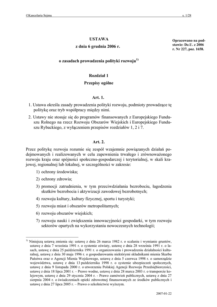©Kancelaria Sejmu s. 1/28 USTAWA Opracowano na podstawie: Dz.U. z 2006 r. Nr 227, poz. 1658. z dnia 6 grudnia 2006 r. o zasadach prowadzenia polityki rozwoju1) Rozdział 1 Przepisy ogólne Art. 1. 1. Ustawa określa zasady prowadzenia polityki rozwoju, podmioty prowadzące tę politykę oraz tryb współpracy między nimi. 2. Ustawy nie stosuje się do programów finansowanych z Europejskiego Funduszu Rolnego na rzecz Rozwoju Obszarów Wiejskich i Europejskiego Funduszu Rybackiego, z wyłączeniem przepisów rozdziałów 1, 2 i 7. Art. 2. Przez politykę rozwoju rozumie się zespół wzajemnie powiązanych działań podejmowanych i realizowanych w celu zapewnienia trwałego i zrównoważonego rozwoju kraju oraz spójności społeczno-gospodarczej i terytorialnej, w skali krajowej, regionalnej lub lokalnej, w szczególności w zakresie: 1) ochrony środowiska; 2) ochrony zdrowia; 3) promocji zatrudnienia, w tym przeciwdziałania bezrobociu, łagodzenia skutków bezrobocia i aktywizacji zawodowej bezrobotnych; 4) rozwoju kultury, kultury fizycznej, sportu i turystyki; 5) rozwoju miast i obszarów metropolitarnych; 6) rozwoju obszarów wiejskich; 7) rozwoju nauki i zwiększenia innowacyjności gospodarki, w tym rozwoju sektorów opartych na wykorzystaniu nowoczesnych technologii; 1) Niniejszą ustawą zmienia się: ustawę z dnia 26 marca 1982 r. o scalaniu i wymianie gruntów, ustawę z dnia 7 września 1991 r. o systemie oświaty, ustawę z dnia 28 września 1991 r. o lasach, ustawę z dnia 25 października 1991 r. o organizowaniu i prowadzeniu działalności kulturalnej, ustawę z dnia 30 maja 1996 r. o gospodarowaniu niektórymi składnikami mienia Skarbu Państwa oraz o Agencji Mienia Wojskowego, ustawę z dnia 5 czerwca 1998 r. o samorządzie województwa, ustawę z dnia 13 października 1998 r. o systemie ubezpieczeń społecznych, ustawę z dnia 9 listopada 2000 r. o utworzeniu Polskiej Agencji Rozwoju Przedsiębiorczości, ustawę z dnia 18 lipca 2001 r. – Prawo wodne, ustawę z dnia 28 marca 2003 r. o transporcie kolejowym, ustawę z dnia 29 stycznia 2004 r. - Prawo zamówień publicznych, ustawę z dnia 27 sierpnia 2004 r. o świadczeniach opieki zdrowotnej finansowanych ze środków publicznych i ustawę z dnia 27 lipca 2005 r. – Prawo o szkolnictwie wyższym. 2007-01-22 ©Kancelaria Sejmu s. 2/28 8) rozwoju zachowań prospołecznych wspólnot lokalnych oraz budowy i umacniania struktur społeczeństwa obywatelskiego; 9) rozwoju zasobów ludzkich, w tym podnoszenia poziomu wykształcenia społeczeństwa, kwalifikacji obywateli, jak również zapobiegania wykluczeniu społecznemu oraz łagodzeniu jego negatywnych skutków; 10) stymulowania powstawania nowych miejsc pracy; 11) tworzenia i modernizacji infrastruktury społecznej i technicznej; 12) wspierania i unowocześniania instytucji państwa; 13) wspierania rozwoju przedsiębiorczości; 14) wspierania wzrostu gospodarczego; 15) zwiększania konkurencyjności gospodarki. Art. 3. Politykę rozwoju prowadzą: 1) w skali kraju – Rada Ministrów; 2) w skali regionu – samorząd województwa; 3) w skali lokalnej – samorząd powiatowy i gminny. Art. 4. 1. Politykę rozwoju prowadzi się na podstawie strategii rozwoju. 2. Politykę rozwoju realizuje się, w szczególności, przy pomocy: 1) programów operacyjnych, służących osiąganiu celów, o których mowa w art. 2, przy wykorzystaniu środków publicznych; 2) strategii rozwoju kraju, strategii sektorowych oraz planów wykonawczych. 3. Polityka rozwoju może być prowadzona również na podstawie innych instrumentów prawnych i finansowych określonych w odrębnych przepisach. Art. 5. Użyte w ustawie określenia oznaczają: 1) beneficjent – osobę fizyczną, osobę prawną lub jednostkę organizacyjną nieposiadającą osobowości prawnej, której ustawa przyznaje zdolność prawną, realizującą projekty finansowane z budżetu państwa lub ze źródeł zagranicznych na podstawie umowy o dofinansowanie projektu; 2) instytucja zarządzająca – właściwego ministra, ministra właściwego do spraw rozwoju regionalnego lub, w przypadku regionalnego programu operacyjnego, zarząd województwa, odpowiedzialnych za przygotowanie i realizację programu operacyjnego; 3) instytucja pośrednicząca – organ administracji publicznej lub inną jednostkę sektora finansów publicznych, której została powierzona, w dro2007-01-22 ©Kancelaria Sejmu s. 3/28 dze porozumienia zawartego z instytucją zarządzającą, część zadań związanych z realizacją programu operacyjnego; 4) instytucja wdrażająca – podmiot publiczny lub prywatny odpowiedzialny za realizację części lub całości priorytetów programu operacyjnego na podstawie odpowiednio porozumienia lub umowy o dofinansowanie realizacji powierzonych jej zadań; 5) kontrakt wojewódzki – porozumienie o dofinansowaniu programu operacyjnego środkami pochodzącymi z budżetu państwa, państwowych funduszy celowych lub ze źródeł zagranicznych, zawierane przez ministra właściwego do spraw rozwoju regionalnego z zarządem województwa, na warunkach określonych przez Radę Ministrów; 6) kwalifikowalność wydatków – spełnienie przez wydatki poniesione w ramach programów operacyjnych kryteriów: a) spójności z postanowieniami przyjętego programu operacyjnego, b) określonych szczegółowo przez instytucję zarządzającą zgodnie z art. 26 ust. 1 pkt 6, c) dodatkowych, przewidzianych dla danego źródła finansowania, w przypadku programów finansowanych ze źródeł zagranicznych; 7) partnerzy społeczni i gospodarczy – organizacje pracodawców i organizacje związkowe reprezentatywne w rozumieniu ustawy z dnia 6 lipca 2001 r. o Trójstronnej Komisji do Spraw Społeczno-Gospodarczych i wojewódzkich komisjach dialogu społecznego (Dz. U. Nr 100, poz. 1080, z późn. zm.2)), samorządy zawodowe, izby gospodarcze, organizacje pozarządowe oraz jednostki naukowe w rozumieniu art. 2 pkt 9 ustawy z dnia 8 