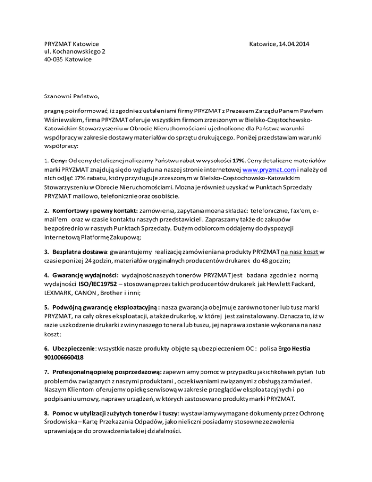 PRYZMAT Katowice ul. Kochanowskiego 2 40-035 Katowice Katowice, 14.04.2014 Szanowni Państwo, pragnę poinformować, iż zgodnie z ustaleniami firmy PRYZMAT z Prezesem Zarządu Panem Pawłem Wiśniewskim, firma PRYZMAT oferuje wszystkim firmom zrzeszonym w Bielsko-CzęstochowskoKatowickim Stowarzyszeniu w Obrocie Nieruchomościami ujednolicone dla Państwa warunki współpracy w zakresie dostawy materiałów do sprzętu drukującego. Poniżej przedstawiam warunki współpracy: 1. Ceny: Od ceny detalicznej naliczamy Państwu rabat w wysokości 17%. Ceny detaliczne materiałów marki PRYZMAT znajdują się do wglądu na naszej stronie internetowej www.pryzmat.com i należy od nich odjąć 17% rabatu, który przysługuje zrzeszonym w Bielsko-Częstochowsko-Katowickim Stowarzyszeniu w Obrocie Nieruchomościami. Można je również uzyskać w Punktach Sprzedaży PRYZMAT mailowo, telefonicznie oraz osobiście. 2. Komfortowy i pewny kontakt: zamówienia, zapytania można składać: telefonicznie, fax'em, email'em oraz w czasie kontaktu naszych przedstawicieli. Zapraszamy także do zakupów bezpośrednio w naszych Punktach Sprzedaży. Dużym odbiorcom oddajemy do dyspozycji Internetową Platformę Zakupową; 3. Bezpłatna dostawa: gwarantujemy realizację zamówienia na produkty PRYZMAT na nasz koszt w czasie poniżej 24 godzin, materiałów oryginalnych producentów drukarek do 48 godzin; 4. Gwarancję wydajności: wydajność naszych tonerów PRYZMAT jest badana zgodnie z normą wydajności ISO/IEC19752 – stosowaną przez takich producentów drukarek jak Hewlett Packard, LEXMARK, CANON , Brother i inni; 5. Podwójną gwarancję eksploatacyjną : nasza gwarancja obejmuje zarówno toner lub tusz marki PRYZMAT, na cały okres eksploatacji, a także drukarkę, w której jest zainstalowany. Oznacza to, iż w razie uszkodzenie drukarki z winy naszego tonera lub tuszu, jej naprawa zostanie wykonana na nasz koszt; 6. Ubezpieczenie: wszystkie nasze produkty objęte są ubezpieczeniem OC : polisa Ergo Hestia 901006660418 7. Profesjonalną opiekę posprzedażową: zapewniamy pomoc w przypadku jakichkolwiek pytań lub problemów związanych z naszymi produktami , oczekiwaniami związanymi z obsługą zamówień. Naszym Klientom oferujemy opiekę serwisową w zakresie przeglądów eksploatacyjnych i po podpisaniu umowy, naprawy urządzeń, w których zastosowano produkty marki PRYZMAT. 8. Pomoc w utylizacji zużytych tonerów i tuszy: wystawiamy wymagane dokumenty przez Ochronę Środowiska – Kartę Przekazania Odpadów, jako nieliczni posiadamy stosowne zezwolenia uprawniające do prowadzenia takiej działalności. 9. Indywidualnie przygotowaną i elastyczną ofertę: w przypadku zmiany urządzeń uzupełnimy ofertę, jesteśmy w stanie realizować zamówienia również na nietypowe , trudno dostępne materiały eksploatacyjne do drukarek. 10. Forma płatności : : gotówka ; karta płatnicza (tylko w punkcie sprzedaży) ; płatność z odroczonym terminem -indywidualnie do uzgodnienia. W razie jakichkolwiek pytań jesteśmy do Państwa dyspozycji i chętnie rozwiejemy wszelkie wątpliwości. Z wyrazami szacunku Kierownik punktu sprzedaży Michał Lasocki