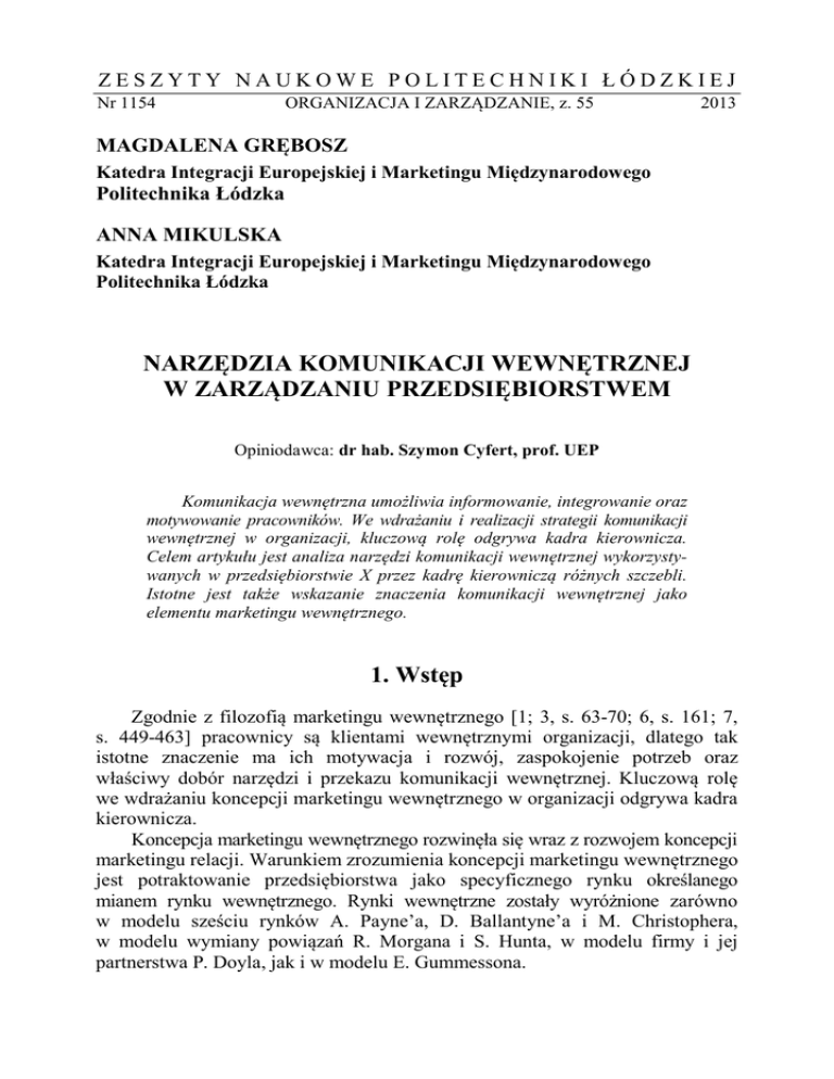 ZESZYTY NAUKOWE POLITECHNIKI ŁÓDZKIEJ Nr 1154 ORGANIZACJA I ZARZĄDZANIE, z. 55 2013 MAGDALENA GRĘBOSZ Katedra Integracji Europejskiej i Marketingu Międzynarodowego Politechnika Łódzka ANNA MIKULSKA Katedra Integracji Europejskiej i Marketingu Międzynarodowego Politechnika Łódzka NARZĘDZIA KOMUNIKACJI WEWNĘTRZNEJ W ZARZĄDZANIU PRZEDSIĘBIORSTWEM Opiniodawca: dr hab. Szymon Cyfert, prof. UEP Komunikacja wewnętrzna umożliwia informowanie, integrowanie oraz motywowanie pracowników. We wdrażaniu i realizacji strategii komunikacji wewnętrznej w organizacji, kluczową rolę odgrywa kadra kierownicza. Celem artykułu jest analiza narzędzi komunikacji wewnętrznej wykorzystywanych w przedsiębiorstwie X przez kadrę kierowniczą różnych szczebli. Istotne jest także wskazanie znaczenia komunikacji wewnętrznej jako elementu marketingu wewnętrznego. 1. Wstęp Zgodnie z filozofią marketingu wewnętrznego [1; 3, s. 63-70; 6, s. 161; 7, s. 449-463] pracownicy są klientami wewnętrznymi organizacji, dlatego tak istotne znaczenie ma ich motywacja i rozwój, zaspokojenie potrzeb oraz właściwy dobór narzędzi i przekazu komunikacji wewnętrznej. Kluczową rolę we wdrażaniu koncepcji marketingu wewnętrznego w organizacji odgrywa kadra kierownicza. Koncepcja marketingu wewnętrznego rozwinęła się wraz z rozwojem koncepcji marketingu relacji. Warunkiem zrozumienia koncepcji marketingu wewnętrznego jest potraktowanie przedsiębiorstwa jako specyficznego rynku określanego mianem rynku wewnętrznego. Rynki wewnętrzne zostały wyróżnione zarówno w modelu sześciu rynków A. Payne’a, D. Ballantyne’a i M. Christophera, w modelu wymiany powiązań R. Morgana i S. Hunta, w modelu firmy i jej partnerstwa P. Doyla, jak i w modelu E. Gummessona. 44 Magdalena Grębosz, Anna Mikulska Marketing wewnętrzny nakłada na kadrę kierowniczą obowiązek niestandardowego spojrzenia na pracownika, który będąc klientem wewnętrznym posiada swoje potrzeby i oczekiwania. Celem marketingu wewnętrznego jest stymulowanie pracowników w taki sposób, aby jak najlepiej reprezentowali swoje przedsiębiorstwo. Dodatkowo marketing wewnętrzny odgrywa ważną rolę w systemie motywacyjnym pracowników i przyczynia się do silniejszego związania pracowników z przedsiębiorstwem, a tym samym ma znaczny wpływ na zmniejszanie fluktuacji kadr [6, s. 50-51, 163-164; 2, s. 291]. Jednym z elementów marketingu wewnętrznego jest strategia komunikacji, która powinna być realizowana nie tylko w otoczeniu zewnętrznym, ale także poprzez ukierunkowanie działań komunikacyjnych na pracowników. Zaangażowanie personelu zależy bowiem w dużym stopniu od sprawnego procesu komunikowania wewnętrznego, który jest możliwy dzięki odpowiedniemu doborowi narzędzi komunikacji oraz dostosowanie przekazu do potrzeb i możliwości poszczególnych grup pracowników. 2. Znaczenie komunikacji wewnętrznej Komunikacja wewnętrzna to proces przekazywania informacji i pozyskiwanie informacji zwrotnej, odbywający się wewnątrz organizacji pomiędzy wszystkimi jej członkami. Celem komunikacji wewnętrznej jest informowanie pracowników o sytuacji w przedsiębiorstwie, integracja poszczególnych działów, motywowanie oraz edukacja pracowników. Komunikacja wewnętrzna pozwala także na uzyskiwanie opinii i pomysłów pracowników. Szczególnie ważną rolę komunikacja wewnętrzna odgrywa w czasie kryzysu gospodarczego, w przypadku pojawienia się problemów w przedsiębiorstwie lub podczas wprowadzania zmian. Do podstawowych celów komunikacji wewnętrznej zaliczyć więc można informowanie, integrowanie oraz motywowanie. Nie bez znaczenia pozostaje także aktywowanie pracowników, którzy dzięki możliwości komunikowania się z pracodawcą czują się bardziej związani z przedsiębiorstwem i mają realny wpływ na zmiany w organizacji. Nawiązanie silnych relacji pomiędzy pracodawcą a pracownikiem powoduje wzrost poziomu lojalności pracownika i przywiązania do miejsca pracy. Dobra komunikacja wewnątrz organizacji zapewnia także poprawę zdolności reagowania na potrzeby innych pracowników oraz większe poczucie odpowiedzialności w realizacji wspólnych celów zarysowanych w wizji, misji i strategii przedsiębiorstwa. Komunikacja wewnętrzna tworzy unikatową kulturę organizacji, motywuje do pracy oraz poprawia morale [10, s. 213]. Efektywny system komunikacji wewnętrznej warunkuje także skuteczność relacji organizacji z jej klientami oraz innymi uczestnikami rynku, dzięki stworzeniu spójnego wizerunku organizacji w oczach pracowników, dystrybutorów, dostawców oraz klientów. Narzędzia komunikacji wewnętrznej w zarządzaniu przedsiębiorstwem 45 Brak komunikacji wewnętrznej lub marginalizowanie jej znaczenia może przyczynić się do problemów przedsiębiorstwa, zwłaszcza jeśli komunikacja jest zaniedbana w okresie wprowadzania zmian, restrukturyzacji lub w sytuacji kryzysu. Wszelkie zmiany powodują naturalny opór ze strony kadry pracowniczej, dlatego zaniedbanie komunikacji w trudnych dla przedsiębiorstwa i pracowników okresach może przyczynić się do tworzenia negatywnego wizerunku przedsiębiorstwa w otoczeniu zewnętrznym. Nie tylko inicjatywy, ale także postawy i zachowania kadry kierowniczej wpływają na odbiór przekazu przyczyniając się lub nie do poprawy know-how oraz zaangażowania pracowników. Według S. Lachiewicza [4, s. 33] wysoki stopień zaangażowania organizacyjnego skłania pracowników do poświęceń na rzecz całej organizacji i jest czynnikiem zachęcającym do współdziałania oraz partycypacji w życiu organizacyjnym. Wypracowanie strategii komunikacji wewnętrznej integrującej pracowników w realizowaniu celów i misji przedsiębiorstwa wymaga umiejętności kadry kierowniczej przede wszystkim w obszarze zarządzania zasobami ludzkimi, ale także w obszarze marketingu. 3. Przekaz w komunikacji wewnętrznej 3.1. Treść i forma przekazu W komuni