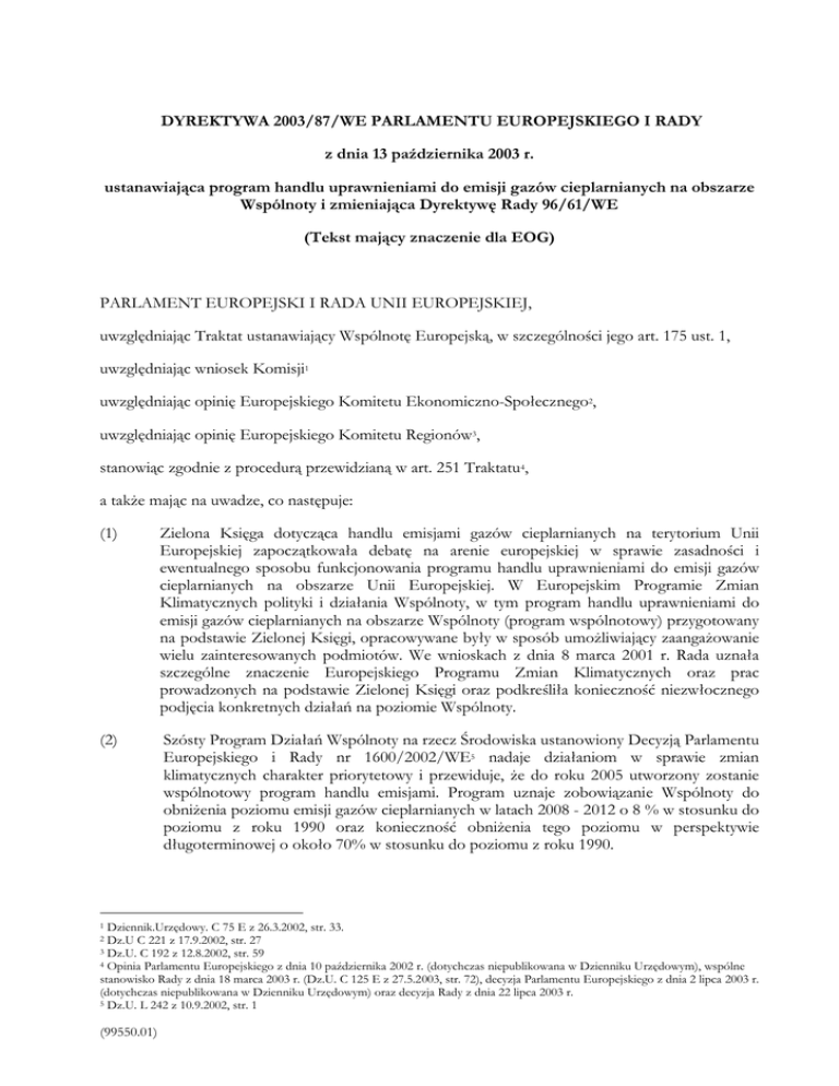 DYREKTYWA 2003/87/WE PARLAMENTU EUROPEJSKIEGO I RADY z dnia 13 października 2003 r. ustanawiająca program handlu uprawnieniami do emisji gazów cieplarnianych na obszarze Wspólnoty i zmieniająca Dyrektywę Rady 96/61/WE (Tekst mający znaczenie dla EOG) PARLAMENT EUROPEJSKI I RADA UNII EUROPEJSKIEJ, uwzględniając Traktat ustanawiający Wspólnotę Europejską, w szczególności jego art. 175 ust. 1, uwzględniając wniosek Komisji1 uwzględniając opinię Europejskiego Komitetu Ekonomiczno-Społecznego2, uwzględniając opinię Europejskiego Komitetu Regionów3, stanowiąc zgodnie z procedurą przewidzianą w art. 251 Traktatu4, a także mając na uwadze, co następuje: (1) Zielona Księga dotycząca handlu emisjami gazów cieplarnianych na terytorium Unii Europejskiej zapoczątkowała debatę na arenie europejskiej w sprawie zasadności i ewentualnego sposobu funkcjonowania programu handlu uprawnieniami do emisji gazów cieplarnianych na obszarze Unii Europejskiej. W Europejskim Programie Zmian Klimatycznych polityki i działania Wspólnoty, w tym program handlu uprawnieniami do emisji gazów cieplarnianych na obszarze Wspólnoty (program wspólnotowy) przygotowany na podstawie Zielonej Księgi, opracowywane były w sposób umożliwiający zaangażowanie wielu zainteresowanych podmiotów. We wnioskach z dnia 8 marca 2001 r. Rada uznała szczególne znaczenie Europejskiego Programu Zmian Klimatycznych oraz prac prowadzonych na podstawie Zielonej Księgi oraz podkreśliła konieczność niezwłocznego podjęcia konkretnych działań na poziomie Wspólnoty. (2) Szósty Program Działań Wspólnoty na rzecz Środowiska ustanowiony Decyzją Parlamentu Europejskiego i Rady nr 1600/2002/WE5 nadaje działaniom w sprawie zmian klimatycznych charakter priorytetowy i przewiduje, że do roku 2005 utworzony zostanie wspólnotowy program handlu emisjami. Program uznaje zobowiązanie Wspólnoty do obniżenia poziomu emisji gazów cieplarnianych w latach 2008 - 2012 o 8 % w stosunku do poziomu z roku 1990 oraz konieczność obniżenia tego poziomu w perspektywie długoterminowej o około 70% w stosunku do poziomu z roku 1990. Dziennik.Urzędowy. C 75 E z 26.3.2002, str. 33. Dz.U C 221 z 17.9.2002, str. 27 3 Dz.U. C 192 z 12.8.2002, str. 59 4 Opinia Parlamentu Europejskiego z dnia 10 października 2002 r. (dotychczas niepublikowana w Dzienniku Urzędowym), wspólne stanowisko Rady z dnia 18 marca 2003 r. (Dz.U. C 125 E z 27.5.2003, str. 72), decyzja Parlamentu Europejskiego z dnia 2 lipca 2003 r. (dotychczas niepublikowana w Dzienniku Urzędowym) oraz decyzja Rady z dnia 22 lipca 2003 r. 5 Dz.U. L 242 z 10.9.2002, str. 1 1 2 (99550.01) (3) Ostatecznym celem Ramowej Konwencji Narodów Zjednoczonych w sprawie Zmian Klimatycznych, zatwierdzonej Decyzją Rady z dnia 15 grudnia 1993 r. nr 94/69/WE dotyczącą zawarcia Ramowej Konwencji Narodów Zjednoczonych w sprawie Zmian Klimatycznych6, jest stabilizacja stężeń gazów cieplarnianych w atmosferze na poziomie uniemożliwiającym wszelkie niebezpieczne zakłócenia antropogeniczne systemu klimatycznego. (4) Protokół z Kioto, zatwierdzony Decyzją Rady z dnia 25 kwietnia 2002 r. nr 2002/358/WE w sprawie zatwierdzenia w imieniu Wspólnoty Europejskiej Protokołu z Kioto do Ramowej Konwencji Narodów Zjednoczonych w sprawie Zmian Klimatycznych oraz wspólnej realizacji zobowiązań z niego wynikających7, będzie zobowiązywał Wspólnotę i jej Państwa Członkowskie, z chwilą wejścia w życie, do ograniczenia łącznej antropogenicznej emisji gazów cieplarnianych wymienionych w załączniku A do Protokołu o 8% w stosunku do poziomu z roku 1990 w okresie od 2008 do 2012 roku. (5) Zgodnie z Decyzją 2002/358/WE, Wspólnota oraz jej Państwa Członkowskie zobowiązały się wspólnie realizować zobowiązania do redukcji antropogenicznej emisji gazów cieplarnianych podjęte w ramach Protokołu z Kioto. Niniejsza dyrektywa ma na celu wsparcie realizacji zobowiązań Wspólnoty Europejskiej i jej Państw Członkowskich w sposób bardziej skuteczny poprzez sprawny europejski rynek handlu uprawnieniami do emisji gazów cieplarnianych, przy możliwie jak najmniejszym ograniczeniu rozwoju gospodarczego i poziomu zatrudnienia. (6) Decyzja Rady 93/389/EWG z dnia 24 czerwca 1993 r. w sprawie systemu monitorowania emisji CO2 i innych gazów cieplarnianych na obszarze Wspólnoty8 ustanowiła mechanizm monitorowania emisji gazów cieplarnianych oraz oceny postępu w dziedzinie realizacji zobowiązań podjętych w sprawie tychże emisji. Państwa Członkowskie będą korzystać z tego mechanizmu przy określaniu całkowitej wielkości emisji objętych uprawnieniami będącymi przedmiotem alokacji. (7) Celem zapewnienia integralności rynku wewnętrznego oraz uniknięcia zniekształcania konkurencji, konieczne jest przyjęcie przepisów wspólnotowych regulujących alokację uprawnień przez poszczególne Państwa Członkowskie. (8) Dokonując alokacji uprawnień, Państwa Członkowskie powinny mieć na uwadze możliwości sektora produkcji przemysłowej w zakresie redukcji emisji. (9) Państwa Członkowskie mogą postanowić, że w odniesieniu do uprawnień umorzonych wydawać będą podmiotom uprawnienia ważne przez okres pięciu lat począwszy od 2008 r., odpowiadające redukcji emisji osiągniętej przez te podmioty na terytorium ich kraju w okresie trzech lat począwszy od 2005 r. (10) Począwszy od wyżej wymienionego okresu pięcioletniego, wszelkie zbycia uprawnień na rzecz innego Państwa Członkowskiego wymagać będą stosownych korekt łącznego pułapu emisyjnego przypisanego danemu państwu na podstawie Protokołu z Kioto. (11) Państwa Członkowskie powinny zapewnić, by podmioty prowadzące określone rodzaje działalności posiadały pozwolenia na emisję gazów cieplarnianych oraz by monitorowały Dz.U. L 33 z 7.2.1994, str. 11 Dz.U. L 130 z 15.5.2002, str. 1 8 Dz. U. L 167 z 9.7.1993, str. 31. Decyzja zmieniona Decyzją 1999/296/WE (Dz.U. 
