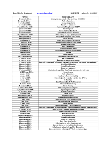 Zespół Szkół w Otrębusach TERMIN 1 września 2016r. 5 września 2016r. 9 września 2016r 12 września 2016r. 14 października 2016r. październik 2016r październik 2016r. październik 2016r. 31 października 2016r. 1 listopada 2016r. 7 listopada 2016r. listopad 2016r. 11 listopada 2016r. 16 listopada 2016r. listopad 2016r. listopad 2016r. listopad 2016r. grudzień 2016r. 5 grudnia 2016r. 23-31 grudnia 2016r 5 stycznia 2017r. 6 stycznia 2017r. 9 stycznia 2017r. 20 stycznia 2017r. 23 stycznia 2017r. 23 stycznia 2017r. 27 stycznia 2017r. 13-26 lutego 2017r. marzec 2017r. marzec 2017r. 13 marca 2017r. marzec 2017r. marzec 2017r 21 marca 2017r 3 kwietnia 2017r. 13-18 kwietnia 2017r. 19,20, 21kwietnia 2017r. 24 kwietnia 2017r. kwiecień 2017r. kwiecień/maj 2017r. kwiecień / maj 2017r. 2 maja 2017r. maj 2017r. 8 maja 2017r. maj 2017r. 29 maja 2017r. 2 czerwca 2017r. czerwiec 2017r. czerwiec 2017r Do 12 czerwca 2017r. 12 czerwca 2017r. 12 czerwca 2017r. 15 czerwca 2017r. 16 czerwca 2017r. 21 czerwca 2017r. 22 czerwca 2017r. 23 czerwca 2017r. www.otrebusy.edu.pl KALENDARZ rok szkolny 2016/2017 RODZAJ DZIAŁAŃ Uroczyste rozpoczęcie roku szkolnego 2016/2017 Rada szkoleniowa Rada pedagogiczna Zebranie z rodzicami Ślubowanie klas pierwszych/ SP/ Dzień Papieski Dzień Bibliotek Szkolnych Tydzień Świadomości Dysleksji Dzień wolny od zajęć dydaktycznych Wszystkich Swiętych- dzień wolny Dzień otwarty Święto Niepodległości- akademia Święto Niepodległości- dzień wolny Rada śródokresowa Rada szkoleniowa Dzień Pluszowego Misia Gminny konkurs pieśni patriotycznej Jasełka Dzień otwarty Zimowa przerwa świąteczna Bal karnawałowy Święto Trzech Króli- dzień wolny Zebranie z rodzicami/ informacje o przewidyw ocenach/ zagrożenia oceną niedost Dzień Babci i Dziadka Rada klasyfikacyjna Zebrania z rodzicami Zatwierdzenie wyników klasyfikacji- zakończenie I półrocza Ferie zimowe Rada szkoleniowa Festiwal kultury niemieckiej Prezentacja dla rodziców uczniów klas OP i I sp Rekolekcje Dzień Patrona Szkoły Podstawowej Pierwszy dzień wiosny Dzień otwarty Wiosenna przerwa świątczna Egzamin gimnazjalny Rada śródokresowa Dzień Ziemi Sesja ekologiczna Gminny konkurs historyczny Dzień wolny od zajęć dydaktycznych Festiwal piosenki angielskiej Dzień otwarty Święto Konstytucji 3 Maja- akademia Zebrania z rodzicami/ inf o zagrożeniach i przewidywanych ocenach końcoworocz/ Dzień Dziecka – Gminna Olimpiada Sportowa Dzień Patrona Gimnazjum Wieczór teatralny Wystawianie ocen Rada klasyfikacyjna Zebrania z rodzicami Boże Ciało- dzień wolny Dzień wolny od zajęć dydaktycznych Zatwierdzenie wyników klasyfikacji rocznej Zakończenie roku szkolnego klas Gimnazjum Zakończenie roku szkolnego SP/ Rada podsumowująca
