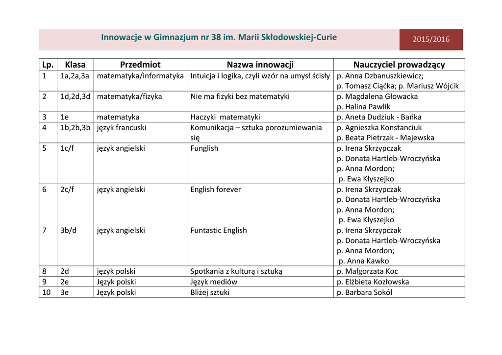 Innowacje w Gimnazjum nr 38 im. Marii Skłodowskiej-Curie Lp. 1 2 3 4 5 6 7 8 9 10 Klasa Przedmiot Nazwa innowacji 2015/2016 Nauczyciel prowadzący 1a,2a,3a matematyka/informatyka Intuicja i logika, czyli wzór na umysł ścisły p. Anna Dzbanuszkiewicz; p. Tomasz Ciąćka; p. Mariusz Wójcik 1d,2d,3d matematyka/fizyka Nie ma fizyki bez matematyki p. Magdalena Głowacka p. Halina Pawlik 1e matematyka Haczyki matematyki p. Aneta Dudziuk - Bańka 1b,2b,3b język francuski Komunikacja – sztuka porozumiewania p. Agnieszka Konstanciuk się p. Beata Pietrzak - Majewska 1c/f język angielski Funglish p. Irena Skrzypczak p. Donata Hartleb-Wroczyńska p. Anna Mordon; p. Ewa Kłyszejko 2c/f język angielski English forever p. Irena Skrzypczak p. Donata Hartleb-Wroczyńska p. Anna Mordon; p. Ewa Kłyszejko 3b/d język angielski Funtastic English p. Irena Skrzypczak p. Donata Hartleb-Wroczyńska p. Anna Mordon; p. Anna Kawko 2d język polski Spotkania z kulturą i sztuką p. Małgorzata Koc 2e Język polski Język mediów p. Elżbieta Kozłowska 3e Język polski Bliżej sztuki p. Barbara Sokół