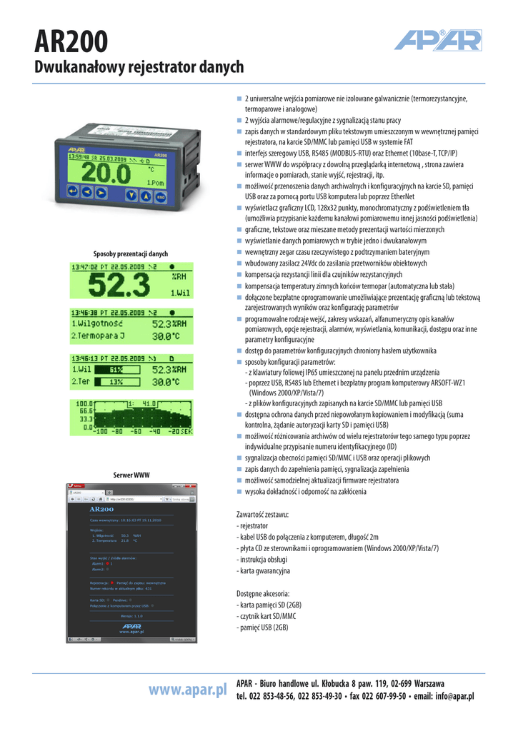 AR200 Dwukanałowy rejestrator danych 2 uniwersalne wejścia pomiarowe nie izolowane galwanicznie (termorezystancyjne, n termoparowe i analogowe) 2 wyjścia alarmowe/regulacyjne z sygnalizacją stanu pracy n zapis danych w standardowym pliku tekstowym umieszczonym w wewnętrznej pamięci n rejestratora, na karcie SD/MMC lub pamięci USB w systemie FAT interfejs szeregowy USB, RS485 (MODBUS-RTU) oraz Ethernet (10base-T, TCP/IP) n serwer WWW do współpracy z dowolną przeglądarką internetową , strona zawiera n informacje o pomiarach, stanie wyjść, rejestracji, itp. możliwość przenoszenia danych archiwalnych i konfiguracyjnych na karcie SD, pamięci n USB oraz za pomocą portu USB komputera lub poprzez EtherNet wyświetlacz graficzny LCD, 128x32 punkty, monochromatyczny z podświetleniem tła n (umożliwia przypisanie każdemu kanałowi pomiarowemu innej jasności podświetlenia) graficzne, tekstowe oraz mieszane metody prezentacji wartości mierzonych n wyświetlanie danych pomiarowych w trybie jedno i dwukanałowym n Sposoby prezentacji danych wewnętrzny zegar czasu rzeczywistego z podtrzymaniem bateryjnym n wbudowany zasilacz 24Vdc do zasilania przetworników obiektowych n kompensacja rezystancji linii dla czujników rezystancyjnych n kompensacja temperatury zimnych końców termopar (automatyczna lub stała) n dołączone bezpłatne oprogramowanie umożliwiające prezentację graficzną lub tekstową n zarejestrowanych wyników oraz konfigurację parametrów programowalne rodzaje wejść, zakresy wskazań, alfanumeryczny opis kanałów n Serwer WWW pomiarowych, opcje rejestracji, alarmów, wyświetlania, komunikacji, dostępu oraz inne parametry konfiguracyjne dostęp do parametrów konfiguracyjnych chroniony hasłem użytkownika n sposoby konfiguracji parametrów: n - z klawiatury foliowej IP65 umieszczonej na panelu przednim urządzenia - poprzez USB, RS485 lub Ethernet i bezpłatny program komputerowy ARSOFT-WZ1 (Windows 2000/XP/Vista/7) - z plików konfiguracyjnych zapisanych na karcie SD/MMC lub pamięci USB dostępna ochrona danych przed niepowołanym kopiowaniem i modyfikacją (suma n kontrolna, żądanie autoryzacji karty SD i pamięci USB) możliwość różnicowania archiwów od wielu rejestratorów tego samego typu poprzez n indywidualne przypisanie numeru identyfikacyjnego (ID) sygnalizacja obecności pamięci SD/MMC i USB oraz operacji plikowych n zapis danych do zapełnienia pamięci, sygnalizacja zapełnienia n możliwość samodzielnej aktualizacji firmware rejestratora n wysoka dokładność i odporność na zakłócenia n Zawartość zestawu: - rejestrator - kabel USB do połączenia z komputerem, długość 2m - płyta CD ze sterownikami i oprogramowaniem (Windows 2000/XP/Vista/7) - instrukcja obsługi - karta gwarancyjna Dostępne akcesoria: - karta pamięci SD (2GB) - czytnik kart SD/MMC - pamięć USB (2GB) www.apar.pl APAR - Biuro handlowe ul. Kłobucka 8 paw. 119, 02-699 Warszawa tel. 022 853-48-56, 022 853-49-30 • fax 022 607-99-50 • email: [email protected] Obudowa i sposób montażu Dane techniczne Uniwersalne wejścia (programowalne): zakresy pomiarowe Mocowanie tablicowe, uchwytami z boku obudowy - Pt100 (RTD, 3- lub 2-przewodowe) -200 ÷ 850 °C Wymiary 96 × 48 × 79 mm - Ni100 (RTD, 3- lub 2-przewodowe) -50 ÷ 170 °C Okno tablicy 92 × 46 mm - termopara J (TC, Fe-CuNi) -40 ÷ 800 °C Materiał samogasnący NORYL 94V-0, poliwęglan - termopara K (TC, NiCr-NiAl) -40 ÷ 1200 °C 300 ÷ 1800 °C - termopara R (TC, PtRh13-Pt) -40 ÷ 1600 °C - termopara T (TC, Cu-CuNi) -25 ÷ 350 °C - termopara E (TC, NiCr-CuNi) -25 ÷ 850 °C - termopara N (TC, NiCrSi-NiSi) -35 ÷ 1300 °C - prądowe (Rwe = 110 Ω) 0/4 ÷ 7 72 17 NORYL 45 -40 ÷ 1600 °C - termopara B (TC, PtRh30PtRh6) poliwęglan - termopara S (TC, PtRh 10-Pt) 20 mA - napięciowe (Rwe = 250 kΩ ) 0 ÷ 10 V - napięciowe (Rwe > 2 M Ω) 0 ÷ 60 mV - rezystancyjne (3- lub 2-przewodowe) 0 ÷ 850 Ω WIDOK OD STRONY UCHWYTU MOCUJĄCEGO Ilość wejść pomiarowych 2 Czas odpowiedzi (10÷90%) 1 ÷ 10 s (programowalny) Rezystancja doprowadzeń (RTD, Ω) Rd < 25 Ω (dla każdej linii) Prąd wejścia rezystancyjnego (RTD, Ω) ~550 μA Listwa zaciskowa i gniazda Błędy przetwarzania (w temperaturze otoczenia 25°C): - podstawowy - dla RTD, mA, V,mV, Ω 0,1 % zakresu pomiarowego ±1 cyfra - dla termopar 0,2 % zakresu pomiarowego ±1 cyfra - dodatkowy dla termopar < 2 °C (temperatura zimnych końców) - dodatkowy od zmian temp. otoczenia < 0,005 % zakresu wejścia /°C Rozdzielczość mierzonej temperatury Interfejsy komunikacyjne - USB (typu A4) 0,1 °C - tryb podrzędny (device) sterowniki dla systemu Windows 2000/XP/Vista/7 - tryb nadrzędny host, obsługa pamięci USB (pendrive) - RS485 protokół MODBUS-RTU, SLAVE, szybkość 2,4 ÷ 115,2 kbit/s, format znaku 8N1, nieseparowany galwanicznie - EtherNet (opcja) 10base-T, RJ45, serwer www, protokoły TCP/IP: DHCP, NetBIOS, ICMP, UDP, TCP, transfer danych ok. 10 kB/s Okres zapisu danych programowalny od 1s do 8 godz. (1) Pamięć danych (nieulotna, zapis do 18 mln. pomiarów dla 2 kanałów i pamięci 1GB): - wewnętrzna 4MB, typu FLASH, system plików FAT12, zapis do 72 tys. pomiarów dla 2 kanałów - zewnętrzna karta SD/MMC FAT16, FAT32, maksymalny rozmiar 2GB, zalecany rozmiar ≤1GB i FAT16, złącze z wyrzutnikiem - zewnętrzna pamięć USB (pendrive) FAT16, FAT32, maksymalny rozmiar 4GB, zalecany rozmiar ≤ 1GB i FAT16, złącze typu A4 Sposób Zamawiania Zegar czasu rzeczywistego (RTC) kwarcowy, uwzględnia lata przestępne, podtrzymanie bateria litowa CR1220 AR200 / o /o /o Wyjścia (2 ze wspólnym - przekaźnikowe 5A / 250V~ (dla obciążeń rezyst.), SPST tykiem) tranzystorowe typu NPN OC, 24V, rezystancja wewnętrzna 850 Ω - SSR (opcja) Wyświetlacz graficzny LCD Zasilanie 85 ÷ 260 Vac/ 5VA - 24Vac/dc (opcja) 20 ÷ 50 Vac/ 5VA, 22 ÷ 72 Vdc/ 5W Zasilacz przetworników obiektowych 24Vdc / 50mA Znamionowe warunki użytkowania 0 ÷ 50°C, <