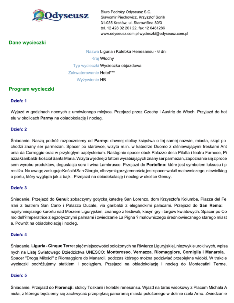 Biuro Podróży Odyseusz S.C. Sławomir Piechowicz, Krzysztof Sonik 31-035 Kraków, ul. Starowiślna 80/3 tel. 12 428 02 20 i 22, fax 12 6481286 www.odyseusz.com.pl [email protected] Dane wycieczki Nazwa Liguria i Kolebka Renesansu - 6 dni Kraj Włochy Typ wycieczki Wycieczka objazdowa Zakwaterowanie Hotel*** Wyżywienie HB Program wycieczki Dzień: 1 Wyjazd w godzinach nocnych z umówionego miejsca. Przejazd przez Czechy i Austrię do Włoch. Przyjazd do hot elu w okolicach Parmy na obiadokolację i nocleg. Dzień: 2 Śniadanie. Naszą podróż rozpoczniemy od Parmy: dawnej stolicy księstwa o tej samej nazwie, miasta, skąd po chodzi znany ser parmezan. Spacer po starówce, wizyta m.in. w katedrze Duomo z olśniewającymi freskami Ant onia da Correggio oraz w przyległym baptysterium. Następnie spacer obok Palazzo della Pilotta i teatru Farnese, Pi azza Garibaldi i kościół Santa Maria. Wizyta w jednej z fattorii wyrabiających znany ser parmezan, zapoznanie się z proce sem wyrobu produktów, degustacja sera i wina Lambrusco. Przejazd do Portofino: które jest symbolem luksusu i p restiżu. Na uwagę zasługuje Kościół San Giorgio, olbrzymią przyjemnością jest spacer wokół malowniczego, niewielkieg o portu, który wygląda jak z bajki. Przejazd na obiadokolację i nocleg w okolice Genuy. Dzień: 3 Śniadanie. Przejazd do Genui: zobaczymy gotycką katedrę San Lorenzo, dom Krzysztofa Kolumba, Piazza del Fe rrari z teatrem San Carlo i Palazzo Ducale, via garibaldi z eleganckimi pałacami. Przejazd do San Remo: najsłynniejszego kurortu nad Morzem Liguryjskim, znanego z festiwali, kasyn gry i targów kwiatowych. Spacer po Co rso dell?Imperatrice z egzotycznymi palmami i zwiedzanie La Pigna ? malowniczego średniowiecznego starego miast a. Powrót na obiadokolację i nocleg. Dzień: 4 Śniadanie. Liguria - Cinque Terre: pięć miejscowości położonych na Riwierze Liguryjskiej, niezwykle urokliwych, wpisa nych na Listę Światowego Dziedzictwa UNESCO: Monterosso, Vernazza, Riomaggiore, Corniglia i Manarola. Spacer "Drogą Miłości" z Riomaggiore do Manaroli, podczas którego można podziwiać przepiękne widoki. W trakcie wycieczki podróżujemy statkiem i pociągiem. Przejazd na obiadokolację i nocleg do Montecatini Terme. Dzień: 5 Śniadanie. Przejazd do Florencji: stolicy Toskanii i kolebki renesansu. Wjazd na taras widokowy z Placem Michała A nioła, z którego będziemy się zachwycać przepiękną panoramą miasta położonego w dolinie rzeki Arno. Zwiedzanie centrum rozpoczniemy od Kościoła Santa Croce - Św. Krzyża - miejsca pochówku najznamienitszych Włochów z Michałe m Aniołem na czele. Następnie Piazza Signoria, przy którym stoją Galeria Uffizi oraz słynny Palazzo Vecchio będąc y przez wiele lat siedzibą rodu Medyceuszy, najbardziej znana gotycka Katedra Santa Maria del Fiore, którą wie ńczy słynna kopuła Bruneleschiego oraz Wieżę Giotta i Baptysterium. Nasz spacer zakończymy na "kipiącym złotem" Ponte Vecchio zwanym Mostem Złotników. Po 9 godzinach pobytu wyjazd do Polski. Dzień: 6 Zakończenie wycieczki w godzinach południowych. Uwaga!!! Wycieczkę można rozszerzyć o dodatkowy dzień i popłynąć na Wyspę Elbę - Głównym miastem jest Portoferraio zlokalizowane na cyplu ze stromymi zboczami, z trzech stron otoczone morzem. Na uwagę zasługują tu liczne forty oraz Dom Napoleona z XIXw. z czasów jego pobytu tutaj na wygnaniu z resztkami swoich oddziałów. Cena zawiera: przejazd komfortowym autokarem (WC, AC, DVD, barek), 4 noclegi w hotelach*** w pokojach 2,3 osobowych z łazienkami, 4 śniadania, 4 obiadokolacje, opiekę pilota, ubezpieczenie KL, NNW, wszystkie opłaty drogowe oraz parkingi. Cena nie zawiera: biletów wstępu do zwiedzanych obiektów, lokalnych przewodników, opłat klimatycznych, napojów do obiadokolacji, dopłaty do pokoju 1-osobowego, dopłaty do klimatyzacji w okresach letnich, zestawów słuchawkowych. Gwarantujemy konkurencyjne ceny i dobrą jakość usług. Cena Miasto wyjazdu Katowice Kraków Rzeszów Cena w przypadku 35os. 1450.00 zł 1470.00 zł 1525.00 zł Cena w przypadku 47os. 1250.00 zł 1265.00 zł 1310.00 zł