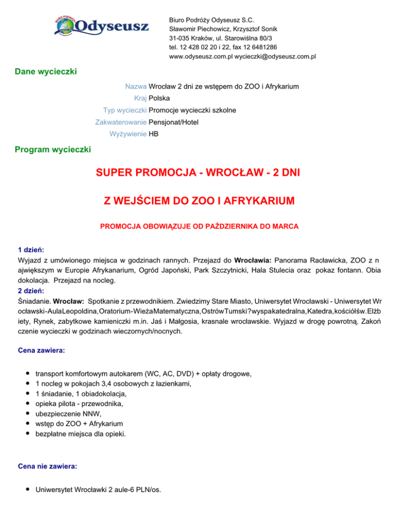 Biuro Podróży Odyseusz S.C. Sławomir Piechowicz, Krzysztof Sonik 31-035 Kraków, ul. Starowiślna 80/3 tel. 12 428 02 20 i 22, fax 12 6481286 www.odyseusz.com.pl [email protected] Dane wycieczki Nazwa Wrocław 2 dni ze wstępem do ZOO i Afrykarium Kraj Polska Typ wycieczki Promocje wycieczki szkolne Zakwaterowanie Pensjonat/Hotel Wyżywienie HB Program wycieczki SUPER PROMOCJA - WROCŁAW - 2 DNI Z WEJŚCIEM DO ZOO I AFRYKARIUM PROMOCJA OBOWIĄZUJE OD PAŹDZIERNIKA DO MARCA 1 dzień: Wyjazd z umówionego miejsca w godzinach rannych. Przejazd do Wrocławia: Panorama Racławicka, ZOO z n ajwiększym w Europie Afrykanarium, Ogród Japoński, Park Szczytnicki, Hala Stulecia oraz pokaz fontann. Obia dokolacja. Przejazd na nocleg. 2 dzień: Śniadanie. Wrocław: Spotkanie z przewodnikiem. Zwiedzimy Stare Miasto, Uniwersytet Wrocławski - Uniwersytet Wr ocławski - Aula Leopoldina, Oratorium - Wieża Matematyczna, Ostrów Tumski ? wyspa katedralna, Katedra, kościół św. Elżb iety, Rynek, zabytkowe kamieniczki m.in. Jaś i Małgosia, krasnale wrocławskie. Wyjazd w drogę powrotną. Zakoń czenie wycieczki w godzinach wieczornych/nocnych. Cena zawiera: transport komfortowym autokarem (WC, AC, DVD) + opłaty drogowe, 1 nocleg w pokojach 3,4 osobowych z łazienkami, 1 śniadanie, 1 obiadokolacja, opieka pilota - przewodnika, ubezpieczenie NNW, wstęp do ZOO + Afrykarium bezpłatne miejsca dla opieki. Cena nie zawiera: Uniwersytet Wrocławki 2 aule-6 PLN/os. Panorama Racławicka ? 18 PLN/os. Ogród Japoński ? 3 PLN/os. Cena Miasto wyjazdu Katowice Kraków Rzeszów Cena w przypadku 44os. 215.00 zł 225.00 zł 255.00 zł