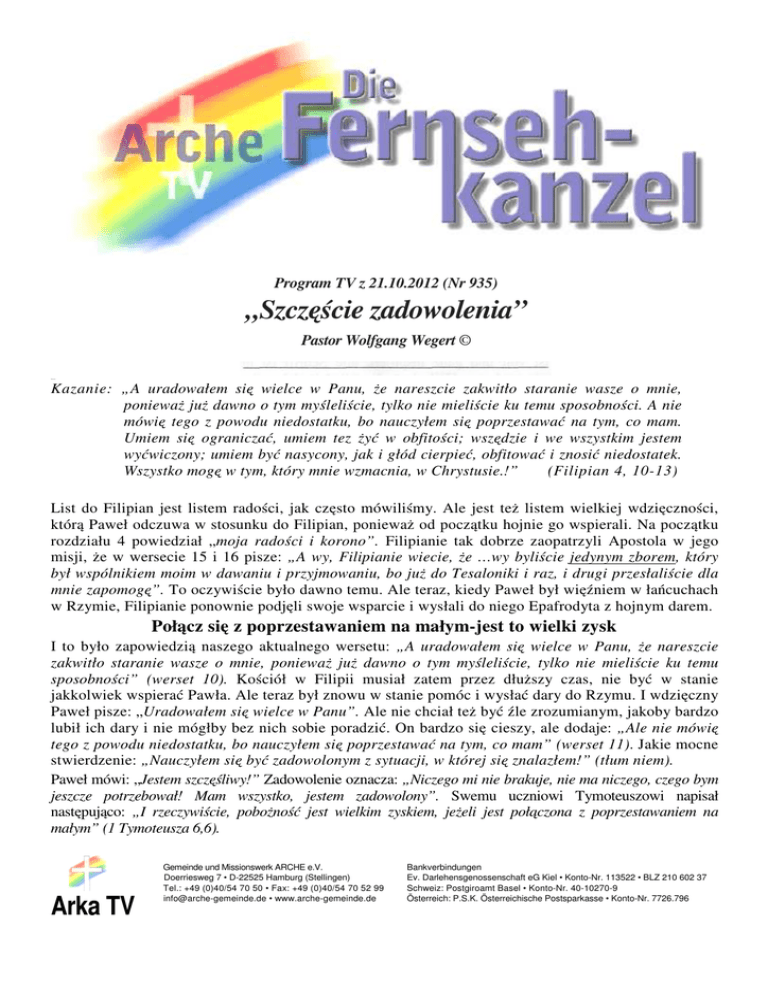 Program TV z 21.10.2012 (Nr 935) „Szczęście zadowolenia” Pastor Wolfgang Wegert © Christian Kazanie: „A uradowałem się wielce w Panu, że nareszcie zakwitło staranie wasze o mnie, ponieważ już dawno o tym myśleliście, tylko nie mieliście ku temu sposobności. A nie mówię tego z powodu niedostatku, bo nauczyłem się poprzestawać na tym, co mam. Umiem się ograniczać, umiem tez żyć w obfitości; wszędzie i we wszystkim jestem wyćwiczony; umiem być nasycony, jak i głód cierpieć, obfitować i znosić niedostatek. Wszystko mogę w tym, który mnie wzmacnia, w Chrystusie.!” (Filipian 4, 10-13) List do Filipian jest listem radości, jak często mówiliśmy. Ale jest też listem wielkiej wdzięczności, którą Paweł odczuwa w stosunku do Filipian, ponieważ od początku hojnie go wspierali. Na początku rozdziału 4 powiedział „moja radości i korono”. Filipianie tak dobrze zaopatrzyli Apostola w jego misji, że w wersecie 15 i 16 pisze: „A wy, Filipianie wiecie, że …wy byliście jedynym zborem, który był wspólnikiem moim w dawaniu i przyjmowaniu, bo już do Tesaloniki i raz, i drugi przesłaliście dla mnie zapomogę”. To oczywiście było dawno temu. Ale teraz, kiedy Paweł był więźniem w łańcuchach w Rzymie, Filipianie ponownie podjęli swoje wsparcie i wysłali do niego Epafrodyta z hojnym darem. Połącz się z poprzestawaniem na małym-jest to wielki zysk I to było zapowiedzią naszego aktualnego wersetu: „A uradowałem się wielce w Panu, że nareszcie zakwitło staranie wasze o mnie, ponieważ już dawno o tym myśleliście, tylko nie mieliście ku temu sposobności” (werset 10). Kościół w Filipii musiał zatem przez dłuższy czas, nie być w stanie jakkolwiek wspierać Pawła. Ale teraz był znowu w stanie pomóc i wysłać dary do Rzymu. I wdzięczny Paweł pisze: „Uradowałem się wielce w Panu”. Ale nie chciał też być źle zrozumianym, jakoby bardzo lubił ich dary i nie mógłby bez nich sobie poradzić. On bardzo się cieszy, ale dodaje: „Ale nie mówię tego z powodu niedostatku, bo nauczyłem się poprzestawać na tym, co mam” (werset 11). Jakie mocne stwierdzenie: „Nauczyłem się być zadowolonym z sytuacji, w której się znalazłem!” (tłum niem). Paweł mówi: „Jestem szczęśliwy!” Zadowolenie oznacza: „Niczego mi nie brakuje, nie ma niczego, czego bym jeszcze potrzebował! Mam wszystko, jestem zadowolony”. Swemu uczniowi Tymoteuszowi napisał następująco: „I rzeczywiście, pobożność jest wielkim zyskiem, jeżeli jest połączona z poprzestawaniem na małym” (1 Tymoteusza 6,6). Arka TV Gemeinde und Missionswerk ARCHE e.V. Doerriesweg 7 • D-22525 Hamburg (Stellingen) Tel.: +49 (0)40/54 70 50 • Fax: +49 (0)40/54 70 52 99 [email protected] • www.arche-gemeinde.de Bankverbindungen Ev. Darlehensgenossenschaft eG Kiel • Konto-Nr. 113522 • BLZ 210 602 37 Schweiz: Postgiroamt Basel • Konto-Nr. 40-10270-9 Österreich: P.S.K. Österreichische Postsparkasse • Konto-Nr. 7726.796 Strona 2 - TV-Program 935/ „Szczęście zadowolenia” I dwa wersety dalej czytamy: „Jeżeli zatem mamy wyżywienie i odzież, poprzestawajmy na tym”. A List do Hebrajczyków potwierdza: „Niech życie wasze będzie wolne od chciwości; poprzestawajcie na tym, co posiadacie; sam bowiem powiedział; Nie porzucę cię ani cię nie opuszczę” (Hebrajczyków 13, 5). Diogenes mieszkał w beczce. Gdy Aleksander Wielki przyszedł i zaoferował biednemu, aby zażyczył sobie tego, co by chciał, Diogenes odpowiedział: „Odejdź ode mnie”. Są więc też ludzie ze świata, którzy mogą być zadowoleni z tego co mają, co jest w naszym konsumenckim podatkowym świecie bardzo rzadkie. Dziś mówimy: „Gdybym tylko miał więcej dochodów, gdybym tylko miał inną żonę, jeśli tylko mógłbym pojechać na urlop, żeby była lepsza pogoda, gdybym to lepiej wyglądał…” Zadowolenie Pawła jest inne niż Diogenesa. To są duchowe cnoty, którymi Duch Święty oddziałuje. Musimy wziąć pod uwagę, w jakiej sytuacji Paweł to napisał: On był więziony w kajdanach, strzeżony stale, nie miał żadnego komfortu i żył w absolutnym minimum. Ale napisał: „Mianowicie nauczyłem się, być zadowolonym z sytuacji, w której się znajduję” (werset 11) (Tłum niem). Oczywiście miał on jeszcze pragnienia, ale one nie panowały nad nim. Miał wszystko, co było niezbędne do życia i z tego był zadowolony. Zadowolenie-zaufanie Bożej Opatrzności Jest dla mnie bardzo pocieszające, gdyż ja sam często jestem wciąż niezadowolony. On mówi: „nauczyłem się” . Zadowolenie jest więc procesem wzrostu duchowego. To ma coś wspólnego z uświęceniem. I tak, jak wzrastać w wierze, w miłości lub cierpliwości, tak można też wzrastać w zadowoleniu. Jak można szczegółowo opisać to zadowolenie? Po pierwsze, jest ufnością w opatrzność Bożą. Jak widzieliśmy, Filipianie nie mogli przez długi czas wesprzeć Pawła. John Mac Arthur uważa, że było to 10 lat. Ale teraz Paweł pisze: „A uradowałem się wielce w Panu, że nareszcie zakwitło staranie wasze o mnie, ponieważ już dawno o tym myśleliście, tylko nie mieliście ku temu sposobności” (werset 10). Paweł nie obwinia Filipian, on nie był sfrustrowany, że tak długo się nim nie zajmowali. Nie rozgniewał się na nich, ale wiedział, że Bóg też go zaopatrzy, jeśli tego Filipianie nie uczynią. Wiedział, że Bóg będzie miał wtedy inną drogę. Apostoł nie wpadł w panikę. Ty także tak zaufaj, kochany chrześcijaninie w zawsze mądrą opatrzność twojego niebieskiego Ojca. On kontroluje wszystkie okoliczności życiowe. Ta wiara wygania jakąkolwiek panikę w życiu. Pan wszystkie twoje potrzeby spełni w ten lub inny sposób, w odpowiednim czasie i On ma wspaniałą drogę. On ciebie nigdy nie porzuci, ani nie opuści - też jeśli Filipianie nie wysłaliby więcej pieniędzy. A ponieważ Paweł to wiedział,
