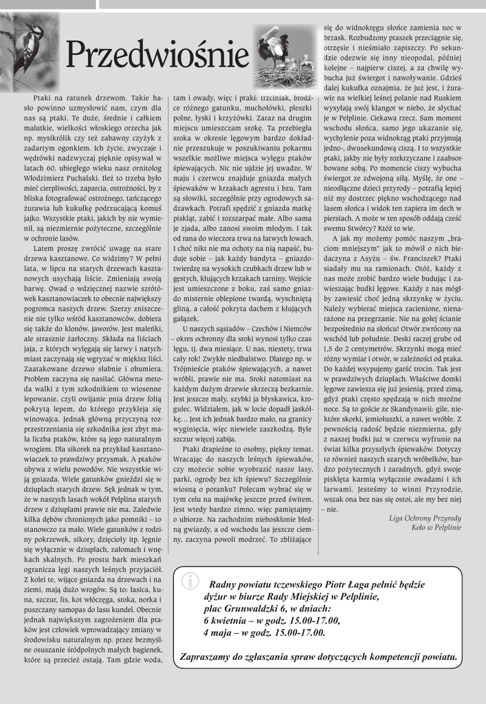 Przedwiośnie się do widnokręgu słońce zamienia noc w brzask. Rozbudzony ptaszek przeciągnie się, otrzęsie i nieśmiało zapiszczy. Po sekundzie odezwie się inny nieopodal, później kolejne – najpierw ciszej, a za chwilę wybucha już świergot i nawoływanie. Gdzieś dalej kukułka oznajmia, że już jest, i żurawie na wielkiej leśnej polanie nad Ruskiem wysyłają swój klangor w niebo, że słychać je w Pelplinie. Ciekawa rzecz. Sam moment wschodu słońca, samo jego ukazanie się, wychylenie poza widnokrąg ptaki przyjmują jedno-, dwusekundową ciszą. I to wszystkie ptaki, jakby nie były rozkrzyczane i zaabsorbowane sobą. Po momencie ciszy wybucha świergot ze zdwojoną siłą. Myślę, że one – nieodłączne dzieci przyrody – potrafią lepiej niż my dostrzec piękno wschodzącego nad lasem słońca i widok ten zapiera im dech w piersiach. A może w ten sposób oddają cześć swemu Stwórcy? Któż to wie. A jak my możemy pomóc naszym „braciom mniejszym” jak to mówił o nich biedaczyna z Asyżu – św. Franciszek? Ptaki siadały mu na ramionach. Otóż, każdy z nas może zrobić bardzo wiele budując i zawieszając budki lęgowe. Każdy z nas mógłby zawiesić choć jedną skrzynkę w życiu. Należy wybierać miejsca zacienione, nienarażone na przegrzanie. Nie na gołej ścianie bezpośrednio na słońcu! Otwór zwrócony na wschód lub południe. Deski raczej grube od 1,5 do 2 centymetrów. Skrzynki mogą mieć różny wymiar i otwór, w zależności od ptaka. Do każdej wsypujemy garść trocin. Tak jest w prawdziwych dziuplach. Właściwe domki lęgowe zawiesza się już jesienią, przed zimą, gdyż ptaki często spędzają w nich mroźne noce. Są to goście ze Skandynawii: gile, niektóre skorki, jemiołuszki, a nawet wróble. Z pewnością radość będzie niezmierna, gdy z naszej budki już w czerwcu wyfrunie na świat kilka przyszłych śpiewaków. Dotyczy to również naszych szarych wróbelków, bardzo pożytecznych i zaradnych, gdyż swoje pisklęta karmią wyłącznie owadami i ich larwami. Jesteśmy to winni Przyrodzie, wszak ona bez nas się ostoi, ale my bez niej – nie. Liga Ochrony Przyrody Koło w Pelplinie Ptaki na ratunek drzewom. Takie ha- tam i owady, więc i ptaki: trzciniak, brodźce różnego gatunku, muchołówki, pleszki sło powinno uzmysłowić nam, czym dla polne, łyski i krzyżówki. Zaraz na drugim nas są ptaki. Te duże, średnie i całkiem miejscu umieszczam srokę. Ta przebiegła malutkie, wielkości włoskiego orzecha jak sroka w okresie lęgowym bardzo dokładnp. mysikrólik czy też zabawny czyżyk z nie przeszukuje w poszukiwaniu pokarmu zadartym ogonkiem. Ich życie, zwyczaje i wszelkie możliwe miejsca wylęgu ptaków wędrówki nadzwyczaj pięknie opisywał w śpiewających. Nic nie ujdzie jej uwadze. W latach 60. ubiegłego wieku nasz ornitolog maju i czerwcu znajduje gniazda małych Włodzimierz Puchalski. Ileż to trzeba było śpiewaków w krzakach agrestu i bzu. Tam mieć cierpliwości, zaparcia, ostrożności, by z są słowiki, szczególnie przy ogrodowych sabliska fotografować ostrożnego, tańczącego dzawkach. Potrafi spędzić z gniazda matkę żurawia lub kukułkę podrzucającą komuś jajko. Wszystkie ptaki, jakich by nie wymie- piskląt, zabić i rozszarpać małe. Albo sama je zjada, albo zanosi swoim młodym. I tak nił, są niezmiernie pożyteczne, szczególnie od rana do wieczora trwa na łatwych łowach. w ochronie lasów. I choć nikt nie ma ochoty na nią napaść, buLatem proszę zwrócić uwagę na stare duje sobie – jak każdy bandyta – gniazdodrzewa kasztanowe. Co widzimy? W pełni lata, w lipcu na starych drzewach kaszta- twierdzę na wysokich czubkach drzew lub w gęstych, kłujących krzakach tarniny. Wejście nowych usychają liście. Zmieniają swoją barwę. Owad o wdzięcznej nazwie szrótó- jest umieszczone z boku, zaś samo gniazdo misternie oblepione twardą, wyschniętą wek kasztanowiaczek to obecnie największy pogromca naszych drzew. Szerzy zniszcze- gliną, a całość pokryta dachem z kłujących gałązek. nie nie tylko wśród kasztanowców, dobiera U naszych sąsiadów – Czechów i Niemców się także do klonów, jaworów. Jest maleńki, ale strasznie żarłoczny. Składa na liściach – okres ochronny dla sroki wynosi tylko czas jaja, z których wylęgają się larwy i natych- lęgu, tj. dwa miesiące. U nas, niestety, trwa miast zaczynają się wgryzać w miękisz liści. cały rok! Zwykłe niedbalstwo. Dlatego np. w Zaatakowane drzewo słabnie i obumiera. Trójmieście ptaków śpiewających, a nawet Problem zaczyna się nasilać. Główna meto- wróbli, prawie nie ma. Sroki natomiast na każdym dużym drzewie skrzeczą bezkarnie. da walki z tym szkodnikiem to wiosenne Jest jeszcze mały, szybki ja błyskawica, krolepowanie, czyli owijanie pnia drzew folią gulec. Widziałem, jak w locie dopadł jaskółpokrytą lepem, do którego przykleja się winowajca. Jednak główną przyczyną roz- kę… Jest ich jednak bardzo mało, na granicy przestrzeniania się szkodnika jest zbyt ma- wyginięcia, więc niewiele zaszkodzą. Byle szczur więcej zabija. ła liczba ptaków, które są jego naturalnym Ptaki drapieżne to osobny, piękny temat. wrogiem. Dla sikorek na przykład kasztanoWracając do naszych leśnych śpiewaków, wiaczek to prawdziwy przysmak. A ptaków ubywa z wielu powodów. Nie wszystkie wi- czy możecie sobie wyobrazić nasze lasy, parki, ogrody bez ich śpiewu? Szczególnie ją gniazda. Wiele gatunków gnieździ się w dziuplach starych drzew. Sęk jednak w tym, wiosną o poranku? Polecam wybrać się w tym celu na majówkę jeszcze przed świtem. że w naszych lasach wokół Pelplina starych Jest wtedy bardzo zimno, więc pamiętajmy drzew z dziuplami prawie nie ma. Zaledwie o ubiorze. Na zachodnim nieboskłonie bledkilka dębów chronionych jako pomniki – to stanowczo za mało. Wiele gatunków z rodzi- ną gwiazdy, a od wschodu las