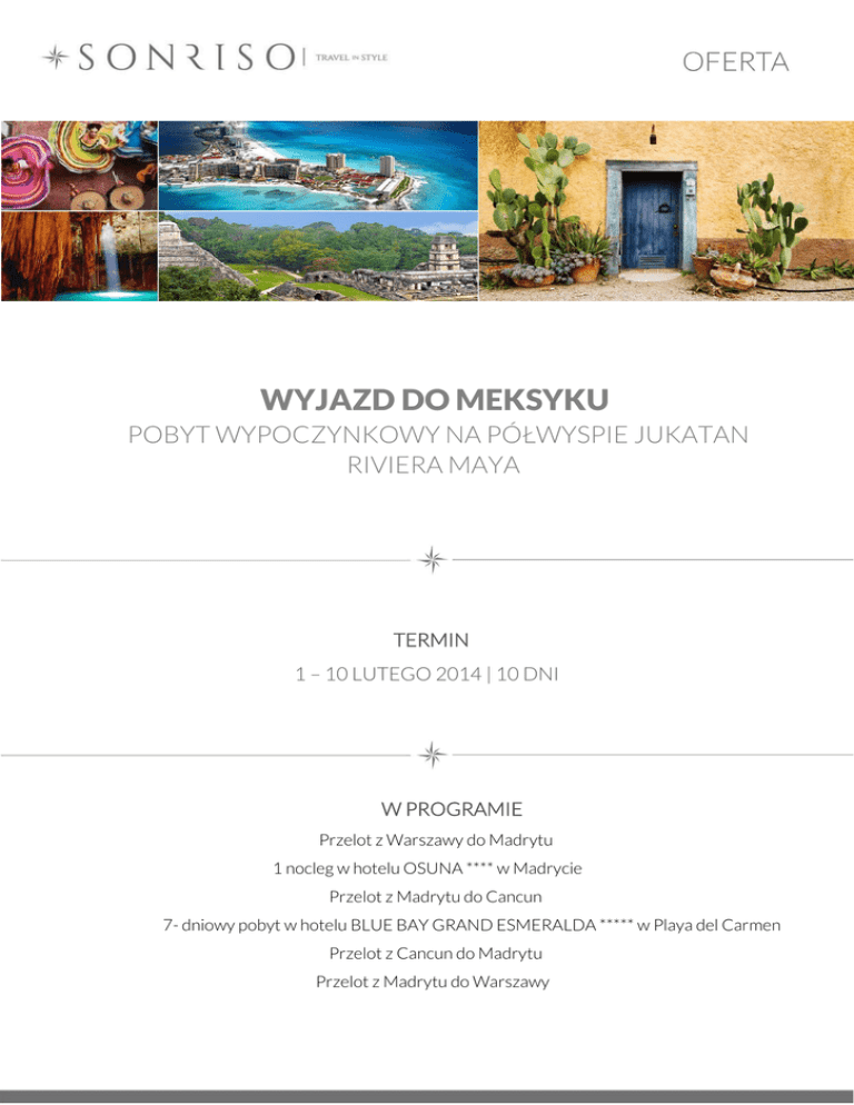 WYJAZD DO MEKSYKU POBYT WYPOCZYNKOWY NA PÓŁWYSPIE JUKATAN RIVIERA MAYA TERMIN 1 – 10 LUTEGO 2014 | 10 DNI W PROGRAMIE Przelot z Warszawy do Madrytu 1 nocleg w hotelu OSUNA **** w Madrycie Przelot z Madrytu do Cancun 7- dniowy pobyt w hotelu BLUE BAY GRAND ESMERALDA ***** w Playa del Carmen Przelot z Cancun do Madrytu Przelot z Madrytu do Warszawy PROPOZYCJA PRZELOTU Wylot: LH 1352 01 LUTY 2014 Warszawa - Madryt via Frankfurt 13:15 - 15:50 PLM7003 02 LUTY 2014 Madryt – Cancun 15:00 - 18:00 PLM7103 09 LUTY 2014 Cancun - Madryt 20:50 - 13:15+1 PLM7003 10 LUTY 2014 Madryt – Warszawa via Frankfurt 11:50 - 19:50 Powrót: Linia lotnicza: przelot na trasie Warszawa – Madryt: LUFTHANSA / lot z przesiadką we Frankfurcie przelot na trasie Madryt – Cancun: PULLMANTUR AIR / lot bezpośredni HOTEL BLUEBAY GRAND ESMERALDA***** http://bluebayresorts.com/en/hotel-bluebay-grand-esmeralda.html Pięciogwiazdkowy hotel zlokalizowany w mieście Playa del Carmen. Plaże tej miejscowości znane są z białego piasku oraz krystalicznie czystej wody. Hotel położony jest na rozległym 180 hektarowym terenie, otoczonym pięknym ogrodem. Do dyspozycji Gości jest prywatna, piaszczysta plaża, centrum SPA, a także kilka restauracji serwujących rozmaite specjały. W ofercie obiektu jest możliwość korzystania z rozmaitych sportów wodnych takich jak windsurfing czy nurkowanie. Na terenie hotelu zlokalizowana jest także siłownia i sauna oraz klub dla dzieci.Hotel jest bardzo nowoczesny i posiada komfortowo wyposażony pokoje. W ofercie proponujemy pokój kategorii standard z łóżkiem typu queen-size bed lub dwoma łóżkami pojedynczymi. Do dyspozycji gości w pokoju jest telewizor z dostępem do TV kablowej, sejf, mini-bar, klimatyzacja. W łazience znajduje się m.in. prysznic oraz suszarka do włosów. KALKULACJA CENOWA 6850,- PLN/os. Powyższe ceny zostały skalkulowane w oparciu o dostępność przelotów oraz ceny z dnia 26.08.2013 r. Dokładna cena zostanie potwierdzona w momencie zakładania rezerwacji. Istnieje możliwość zmiany terminu wylotu oraz pobytu. CENA ZAWIERA Przelot do/z Cancun 1 nocleg w hotelu Osuna ****Madrycie w dniu 01.02.201 (nocleg ze śniadaniem) 7 noclegów w pokoju 2-os standard w hotelu Bluebay Grand Esmeralda***** wyżywienie w formule all inclusive w hotelu Bluebay Grand Esmeralda***** (3 posiłki dziennie, napoje do posiłków, przekąski, wybór lokalnych alkoholi) trasnfery w Madrycie z/na lotnisko transfery w Meksyku z/na lotnisko ubezpieczenie turystyczne TU EUROPA (KL-3000 EUR/os. NNW – 5000 EUR/os. OC- 5000 EUR/os. bagaż – 500EUR/os.) DODATKOWE OPŁATY korzystanie z mini baru w hotelu wydatki osobiste koszt opłaty wjazdowej w Meksyku (pobierana w dniu przylotu do Meksyku ok. 30 USD/os.) ubezpieczenie od chorób przewlekłych wycieczki fakultatywne w Meksyku dopłata do pokoju 1- os. KONTAKT SONRISO WARSZAWA Lipiński Passage Al. Jerozolimskie 61 00-697 Warszawa tel. +48 22 206 45 00 e-mail: [email protected] SONRISO POZNAŃ City Park (Stare Koszary) ul. Wojskowa 4 60-792 Poznań tel. +48 61 674 60 70 e-mail: [email protected]