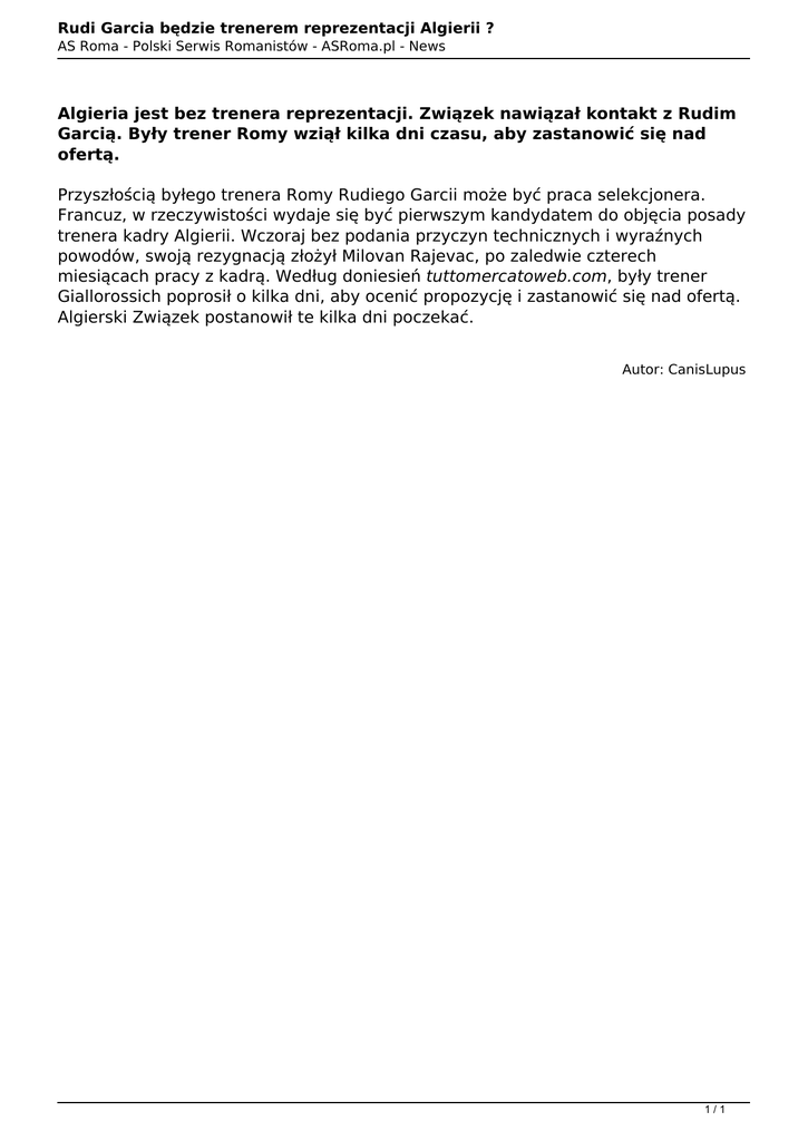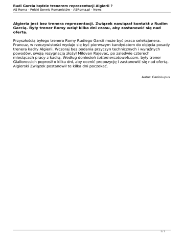 Rudi Garcia będzie trenerem reprezentacji Algierii ? AS Roma - Polski Serwis Romanistów - ASRoma.pl - News Algieria jest bez trenera reprezentacji. Związek nawiązał kontakt z Rudim Garcią. Były trener Romy wziął kilka dni czasu, aby zastanowić się nad ofertą. Przyszłością byłego trenera Romy Rudiego Garcii może być praca selekcjonera. Francuz, w rzeczywistości wydaje się być pierwszym kandydatem do objęcia posady trenera kadry Algierii. Wczoraj bez podania przyczyn technicznych i wyraźnych powodów, swoją rezygnacją złożył Milovan Rajevac, po zaledwie czterech miesiącach pracy z kadrą. Według doniesień tuttomercatoweb.com, były trener Giallorossich poprosił o kilka dni, aby ocenić propozycję i zastanowić się nad ofertą. Algierski Związek postanowił te kilka dni poczekać. Autor: CanisLupus 1/1 Powered by TCPDF (www.tcpdf.org)