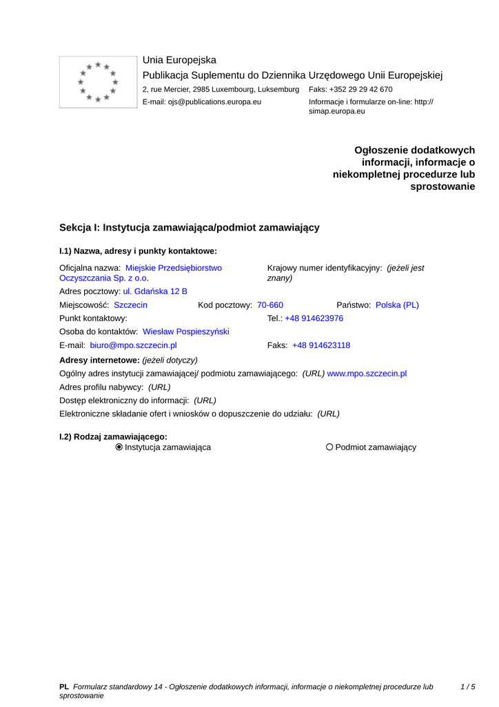 Unia Europejska Publikacja Suplementu do Dziennika Urzędowego Unii Europejskiej 2, rue Mercier, 2985 Luxembourg, Luksemburg Faks: +352 29 29 42 670 E-mail: [email protected] Informacje i formularze on-line: http:// simap.europa.eu Ogłoszenie dodatkowych informacji, informacje o niekompletnej procedurze lub sprostowanie Sekcja I: Instytucja zamawiająca/podmiot zamawiający I.1) Nazwa, adresy i punkty kontaktowe: Oficjalna nazwa: Miejskie Przedsiębiorstwo Oczyszczania Sp. z o.o. Krajowy numer identyfikacyjny: (jeżeli jest znany) _____ Adres pocztowy: ul. Gdańska 12 B Miejscowość: Szczecin Kod pocztowy: 70-660 Punkt kontaktowy: _____ Państwo: Polska (PL) Tel.: +48 914623976 Osoba do kontaktów: Wiesław Pospieszyński E-mail: [email protected] Faks: +48 914623118 Adresy internetowe: (jeżeli dotyczy) Ogólny adres instytucji zamawiającej/ podmiotu zamawiającego: (URL) www.mpo.szczecin.pl Adres profilu nabywcy: (URL) _____ Dostęp elektroniczny do informacji: (URL) _____ Elektroniczne składanie ofert i wniosków o dopuszczenie do udziału: (URL) _____ I.2) Rodzaj zamawiającego: Instytucja zamawiająca Podmiot zamawiający PL Formularz standardowy 14 - Ogłoszenie dodatkowych informacji, informacje o niekompletnej procedurze lub sprostowanie 1/5 Sekcja II: Przedmiot zamówienia II.1.1) Nazwa nadana zamówieniu: Dostawa fabrycznie nowego, 3 osiowego samochodu ciężarowego z urządzeniem hakowym oraz przyczepą w formie leasingu finansowego II.1.2) Krótki opis zamówienia lub zakupu:(podano w pierwotnym ogłoszeniu) Przedmiot zamówienia obejmuje dostawę fabrycznie nowego, ciężarowego samochodu specjalistycznego z urządzeniem hakowym oraz przyczepą. Samochów jest kupowany w formie leasingu finansowego. Szczegółowe wymagania techniczne jakim musi odpowiadać samochód określa Specyfikacja Istotnych Warunków Zamówienia zamieszczona na stronie internetowej Zamawiającego. II.1.3) Wspólny Słownik Zamówień (CPV) Główny przedmiot Słownik główny 34144510 Słownik uzupełniający (jeżeli dotyczy) PL Formularz standardowy 14 - Ogłoszenie dodatkowych informacji, informacje o niekompletnej procedurze lub sprostowanie 2/5 Sekcja IV: Procedura IV.1)Rodzaj procedury(podano w pierwotnym ogłoszeniu) Otwarta Ograniczona Ograniczona przyspieszona Negocjacyjna Negocjacyjna przyspieszona Dialog konkurencyjny Negocjacyjna z uprzednim ogłoszeniem Negocjacyjna bez uprzedniego ogłoszenia Negocjacyjna z publikacją ogłoszenia o zamówieniu Negocjacyjna bez publikacji ogłoszenia o zamówieniu Udzielenie zamówienia bez uprzedniej publikacji ogłoszenia o zamówieniu w Dzienniku Urzędowym Unii Europejskiej IV.2)Informacje administracyjne IV.2.1)Numer referencyjny: (podano w pierwotnym ogłoszeniu) 02/2012 IV.2.2)Dane referencyjne ogłoszenia w przypadku ogłoszeń przesłanych drogą elektroniczną: Pierwotne ogłoszenie przesłane przez eNotices TED eSender Login: ENOTICES_mposzcz Dane referencyjne ogłoszenia: 2012-059868 rok i numer dokumentu IV.2.3)Ogłoszenie, którego dotyczy niniejsza publikacja: Numer ogłoszenia w Dz.U.: 2012/S 84-137972 z dnia: 02/05/2012 (dd/mm/rrrr) IV.2.4)Data wysłania pierwotnego ogłoszenia: 26/04/2012 (dd/mm/rrrr) PL Formularz standardowy 14 - Ogłoszenie dodatkowych informacji, informacje o niekompletnej procedurze lub sprostowanie 3/5 Sekcja VI: Informacje uzupełniające VI.1) Ogłoszenie dotyczy: Procedury niepełnej Sprostowania Informacji dodatkowych VI.2) Informacje na temat niepełnej procedury udzielenia zamówienia: Postępowanie o udzielenie zamówienia zostało przerwane Postępowanie o udzielenie zamówienia uznano za nieskuteczne Zamówienia nie udzielono Zamówienie może być przedmiotem ponownej publikacji VI.3) Informacje do poprawienia lub dodania : VI.3.1) Zmiana oryginalnej informacji podanej przez instytucję zamawiającą Publikacja w witrynie TED niezgodna z oryginalną informacją, przekazaną przez instytucję zamawiającą Oba przypadki VI.3.2) W ogłoszeniu pierwotnym W odpowiedniej dokumentacji przetargowej (więcej informacji w odpowiedniej dokumentacji przetargowej) W obu przypadkach (więcej informacji w odpowiedniej dokumentacji przetargowej) VI.3.3) Tekst, który należy poprawić w pierwotnym ogłoszeniu Miejsce, w którym znajduje się Zamiast: zmieniany tekst: II.3) Sekcja II.3) Czas trwania zamówienia lub termin realizacji Rozpoczęcie 10.6.2012. Zakończenie 31.7.2012 Miejsce, w którym znajduje się zmieniany tekst: Sekca VI.3) Miejsce, w którym znajduje się zmieniany tekst: Sekcja II.3) Powinno być: II.3) Czas trwania zamówienia lub termin realizacji Wydanie Zamawiającemu pojazdu wraz z przyczepą powinno nastąpić w siedzibie Zamawiającego nie później niż w ciągu 60 dni od dnia zawarcia umowy leasingu. Zamiast: Powinno być: Termin dostawy pojazdu wyznacza Wydanie Zamawiającemu pojazdu się na dzień 31.7.2012 r. Początkowy wraz z przyczepą powinno nastąpić dzień realizacji zamówienia jaki w siedzibie Zamawiającego nie jestwskazany w treści ogłoszenia później niż w ciągu 60 dni od dnia zależy od dnia rozstrzygnięcia zawarcia umowy leasingu. postępowania. Zamiast: Powinno być: II.3) Czas trwania zamówienia lub termin realizacji Rozpoczęcie 10.6.2012. Zakończenie 31.7.2012 II.3) Czas trwania zamówienia lub termin realizacji Wydanie Zamawiającemu pojazdu wraz z przyczepą powinno nastąpić w siedzibie Zamawiającego nie później niż w ciągu 60 dni od dnia zawarcia umowy leasingu. PL Formularz standardowy 14 - Ogłoszenie dodatkowych informacji, informacje o niekompletnej procedurze lub sprostowanie 4/5 Miejsce, w którym znajduje się zmieniany tekst: Sekca VI.3) Zamiast: Powinno być: Termin dostawy pojazdu wyznacza Wydanie Zamawiającemu pojazdu się na dzień 31.7.2012 r. Początkowy wraz z przyczepą powinno nastąpić dzień realizacji zamówienia jaki w siedzibie Zamawiającego nie jestwskazany w treści ogłoszenia później niż w ciągu 60 dni od dnia zależy 