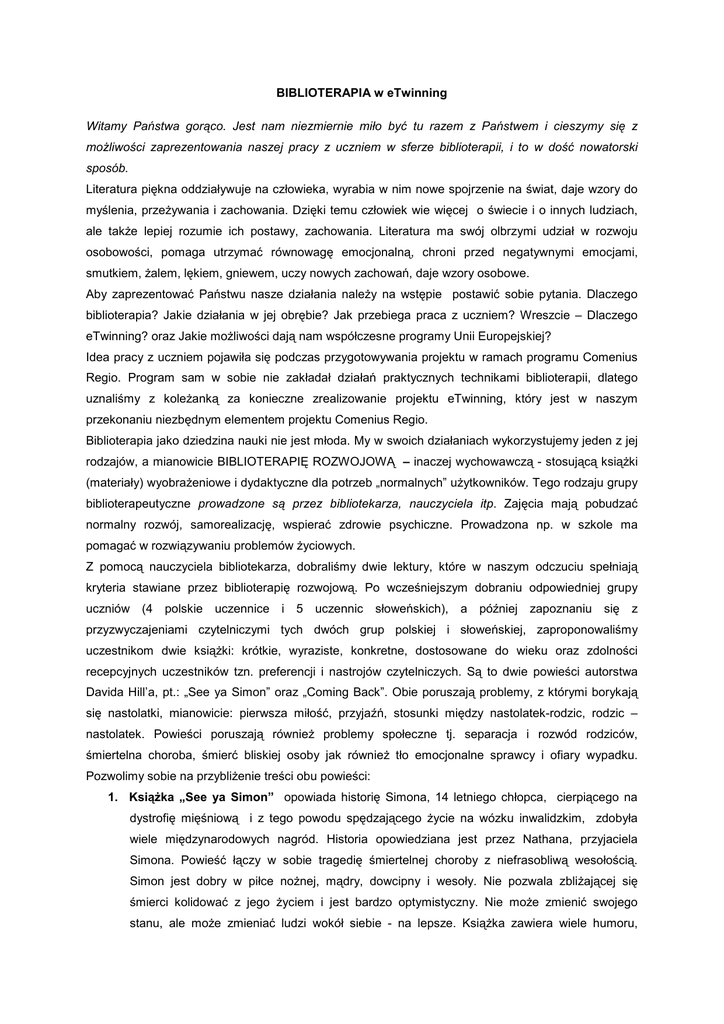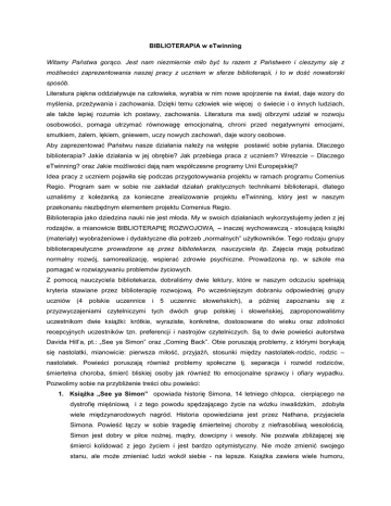 BIBLIOTERAPIA w eTwinning Witamy Państwa gorąco. Jest nam niezmiernie miło być tu razem z Państwem i cieszymy się z możliwości zaprezentowania naszej pracy z uczniem w sferze biblioterapii, i to w dość nowatorski sposób. Literatura piękna oddziaływuje na człowieka, wyrabia w nim nowe spojrzenie na świat, daje wzory do myślenia, przeżywania i zachowania. Dzięki temu człowiek wie więcej o świecie i o innych ludziach, ale także lepiej rozumie ich postawy, zachowania. Literatura ma swój olbrzymi udział w rozwoju osobowości, pomaga utrzymać równowagę emocjonalną, chroni przed negatywnymi emocjami, smutkiem, żalem, lękiem, gniewem, uczy nowych zachowań, daje wzory osobowe. Aby zaprezentować Państwu nasze działania należy na wstępie postawić sobie pytania. Dlaczego biblioterapia? Jakie działania w jej obrębie? Jak przebiega praca z uczniem? Wreszcie – Dlaczego eTwinning? oraz Jakie możliwości dają nam współczesne programy Unii Europejskiej? Idea pracy z uczniem pojawiła się podczas przygotowywania projektu w ramach programu Comenius Regio. Program sam w sobie nie zakładał działań praktycznych technikami biblioterapii, dlatego uznaliśmy z koleżanką za konieczne zrealizowanie projektu eTwinning, który jest w naszym przekonaniu niezbędnym elementem projektu Comenius Regio. Biblioterapia jako dziedzina nauki nie jest młoda. My w swoich działaniach wykorzystujemy jeden z jej rodzajów, a mianowicie BIBLIOTERAPIĘ ROZWOJOWĄ – inaczej wychowawczą - stosującą książki (materiały) wyobrażeniowe i dydaktyczne dla potrzeb „normalnych” użytkowników. Tego rodzaju grupy biblioterapeutyczne prowadzone są przez bibliotekarza, nauczyciela itp. Zajęcia mają pobudzać normalny rozwój, samorealizację, wspierać zdrowie psychiczne. Prowadzona np. w szkole ma pomagać w rozwiązywaniu problemów życiowych. Z pomocą nauczyciela bibliotekarza, dobraliśmy dwie lektury, które w naszym odczuciu spełniają kryteria stawiane przez biblioterapię rozwojową. Po wcześniejszym dobraniu odpowiedniej grupy uczniów (4 polskie uczennice i 5 uczennic słoweńskich), a później zapoznaniu się z przyzwyczajeniami czytelniczymi tych dwóch grup polskiej i słoweńskiej, zaproponowaliśmy uczestnikom dwie książki: krótkie, wyraziste, konkretne, dostosowane do wieku oraz zdolności recepcyjnych uczestników tzn. preferencji i nastrojów czytelniczych. Są to dwie powieści autorstwa Davida Hill’a, pt.: „See ya Simon” oraz „Coming Back”. Obie poruszają problemy, z którymi borykają się nastolatki, mianowicie: pierwsza miłość, przyjaźń, stosunki między nastolatek-rodzic, rodzic – nastolatek. Powieści poruszają również problemy społeczne tj. separacja i rozwód rodziców, śmiertelna choroba, śmierć bliskiej osoby jak również tło emocjonalne sprawcy i ofiary wypadku. Pozwolimy sobie na przybliżenie treści obu powieści: 1. Książka „See ya Simon” opowiada historię Simona, 14 letniego chłopca, cierpiącego na dystrofię mięśniową i z tego powodu spędzającego życie na wózku inwalidzkim, zdobyła wiele międzynarodowych nagród. Historia opowiedziana jest przez Nathana, przyjaciela Simona. Powieść łączy w sobie tragedię śmiertelnej choroby z niefrasobliwą wesołością. Simon jest dobry w piłce nożnej, mądry, dowcipny i wesoły. Nie pozwala zbliżającej się śmierci kolidować z jego życiem i jest bardzo optymistyczny. Nie może zmienić swojego stanu, ale może zmieniać ludzi wokół siebie - na lepsze. Książka zawiera wiele humoru, optymizmu i pokazuje życie realne, codzienne nastolatków, którzy spotykają się z nieuchronną śmiercią ich szkolnego kolegi, brata i przyjaciela. 2. Książka „Coming back” – to opowieść o tragicznym wypadku samochodowym i konsekwencjach z nim związanych dla wszystkich jego uczestników. Ryan, chłopak, który spowodował wypadek, nie jest pijany, czy nieodpowiedzialny. Jest dobrym nastolatkiem, który na moment odwraca wzrok od drogi a to w konsekwencji ponosi za sobą fatalne skutki. Powoduje wypadek. Nie ucieka z miejsca wypadku. Opowieść skupia się na samej winie chłopca i na tym jak próbuje naprawić to co zrobił. Historia opowiedziana w pierwszej osobie w słowach Ryana i Tary – poszkodowanej. Wstrząsający wypadek, który wpływa na wiele istnień ludzkich. To przejmująca i wciągająca w fabułę powieść o powrocie do zdrowia, przyjaźni, a także nienawiści i żalu. Zajęcia biblioterapeutyczne prowadzone były w obu szkołach partnerskich, podczas których odbywały się dyskusje na temat przygotowanych przez nas wcześniej pytań. Praca nauczyciela polegała głównie na pomocy w nazwaniu emocji, które towarzyszyły w uczniom przy odpowiedziach na pytania. Niektóre postawione przez nas pytania wymagały od ucznia identyfikacji z głównym bohaterem, stawiając siebie w danej sytuacji. Nie zauważono problemów z identyfikacją, niemniej jednak uczniowie mięli problemy w nazwaniu emocji, pomimo tego, że dyskusje przebiegały zarówno w języku ojczystym danej grupy oraz języku angielskim. Szczególnie interesowało nas jak nastolatki reagują na śmierć, w przypadku powieści „See ya Simon”, śmierć najbliższego przyjaciela, zwłaszcza, że czytając powieść, czytelnik oswaja się ze śmiertelną chorobą Simona już od 1 rozdziału. Na tym etapie uczniowie wykazali niebywałą postawę. Identyfikując się z Nathanem dostrzegli, że przyjaciel Simona, miał chwile słabości, popadał w depresję, w pewnych chwilach obarczał siebie odpowiedzialnością za śmierć Simona, rozpatrując wszelkie warianty, w których można by było przedłużyć życie jego przyjaciela. Tu, również uczniowie wspomnieli o wstydzie i poczuciu winy związanym z zarzucaniem sobie niewłaściwego postępowania ze zmarłym, spędzaniem z nim zbyt mało czasu za życia, zmarnowaniem szans. Pojawiały się tu uczucia bezradności,