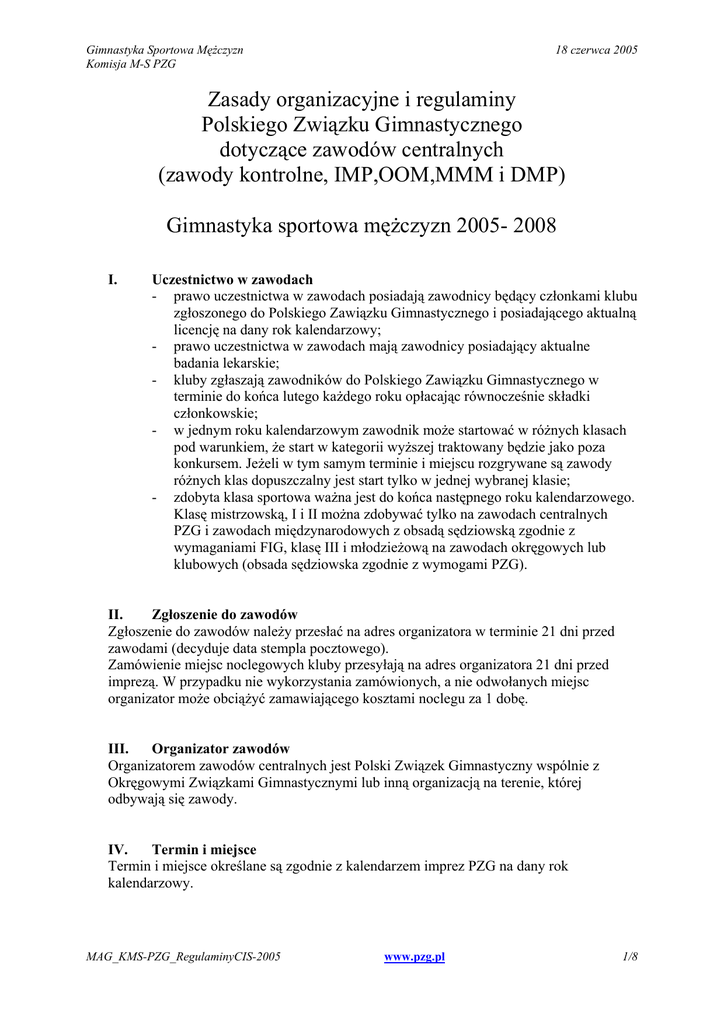 Gimnastyka Sportowa Mężczyzn Komisja M-S PZG 18 czerwca 2005 Zasady organizacyjne i regulaminy Polskiego Związku Gimnastycznego dotyczące zawodów centralnych (zawody kontrolne, IMP,OOM,MMM i DMP) Gimnastyka sportowa mężczyzn 2005- 2008 I. Uczestnictwo w zawodach - prawo uczestnictwa w zawodach posiadają zawodnicy będący członkami klubu zgłoszonego do Polskiego Zawiązku Gimnastycznego i posiadającego aktualną licencję na dany rok kalendarzowy; - prawo uczestnictwa w zawodach mają zawodnicy posiadający aktualne badania lekarskie; - kluby zgłaszają zawodników do Polskiego Zawiązku Gimnastycznego w terminie do końca lutego każdego roku opłacając równocześnie składki członkowskie; - w jednym roku kalendarzowym zawodnik może startować w różnych klasach pod warunkiem, że start w kategorii wyższej traktowany będzie jako poza konkursem. Jeżeli w tym samym terminie i miejscu rozgrywane są zawody różnych klas dopuszczalny jest start tylko w jednej wybranej klasie; - zdobyta klasa sportowa ważna jest do końca następnego roku kalendarzowego. Klasę mistrzowską, I i II można zdobywać tylko na zawodach centralnych PZG i zawodach międzynarodowych z obsadą sędziowską zgodnie z wymaganiami FIG, klasę III i młodzieżową na zawodach okręgowych lub klubowych (obsada sędziowska zgodnie z wymogami PZG). II. Zgłoszenie do zawodów Zgłoszenie do zawodów należy przesłać na adres organizatora w terminie 21 dni przed zawodami (decyduje data stempla pocztowego). Zamówienie miejsc noclegowych kluby przesyłają na adres organizatora 21 dni przed imprezą. W przypadku nie wykorzystania zamówionych, a nie odwołanych miejsc organizator może obciążyć zamawiającego kosztami noclegu za 1 dobę. III. Organizator zawodów Organizatorem zawodów centralnych jest Polski Związek Gimnastyczny wspólnie z Okręgowymi Związkami Gimnastycznymi lub inną organizacją na terenie, której odbywają się zawody. IV. Termin i miejsce Termin i miejsce określane są zgodnie z kalendarzem imprez PZG na dany rok kalendarzowy. MAG_KMS-PZG_RegulaminyCIS-2005 www.pzg.pl 1/8 Gimnastyka Sportowa Mężczyzn Komisja M-S PZG 18 czerwca 2005 V. Program zawodów Program zawodów jest zgodny z wytycznymi Komisji Metodyczno- Szkoleniowej na dany rok zatwierdzony przez Zarząd Sekcji Męskiej PZG. Program i wymagania na lata 2005- 2008: - Zawody kontrolne i eliminacyjne w klasach mł., III, II, I rozgrywane są wg wymagań PZG oraz klasa M. Wg wymagań FIG. - Indywidualne i Drużynowe Mistrzostwa Polski wg wymagań wielobojowych w poszczególnych klasach. Finał: wg wymagań finałowych w poszczególnych klasach. klasa mł.- zawodnik ma prawo startu w dwóch finałach klasa III- zawodnik ma prawo startu w dwóch finałach klasa II- zawodnik ma prawo startu w dwóch finałach klasa I- zawodnik ma prawo startu w trzech finałach klasa Młodzieżowiec- zawodnik ma prawo startu w sześciu finałach klasa M- zawodnik ma prawo startu w sześciu finałach Uwaga! We wszystkich klasach indywidualnie i drużynowo obowiązuje losowanie kolejności startu oprócz Ogólnopolskiej Olimpiady Młodzieży. W klasach młodzieżowej, III i II drużyny składają się z 5 zawodników, a do punktacji drużynowej liczą się 4 najlepsze wyniki na poszczególnych przyrządach. W klasie I drużyny składają się z 4 zawodników, z czego 3 najlepsze wyniki na poszczególnych przyrządach liczą się do punktacji drużynowej. W klasie mistrzowskiej drużyna składa się z 3 zawodników, z czego 2 najlepsze wyniki na poszczególnych przyrządach liczą się do punktacji drużynowej. W zawodach klasy młodzieżowej, III i II dopuszczalna jest 1 poprawka za wyjątkiem ćwiczeń wolnych i skoku. Wymagania wiekowe na lata kl. mł. kl. III kl. II kl. I kl. Młodzieżowiec kl. M VI. 2005 95 92 90 87 84 2006 2007 96 97 93 94 91 92 88 89 85 86 bez ograniczeń wiekowych 2008 98 95 93 90 87 Sposób wyłaniania zwycięzców - Zwycięzcą w wieloboju zostaje zawodnik, który uzyskał najwyższy wynik łączny z 6 konkurencji. - Zwycięzcą na danym przyrządzie (konkurencji) zostaje zawodnik, który za ćwiczenia finałowe otrzyma najwyższą ocenę. - Do finałów w poszczególnych konkurencjach kwalifikuje się 8-miu zawodników z najwyższymi ocenami z punktacji wielobojowej. Przy jednakowej ocenie decyduje wyższa pozycja w wieloboju. - W przypadku uzyskania jednakowych ocen zarówno w wieloboju jak również w finale zawodnicy zajmują równorzędne miejsca. MAG_KMS-PZG_RegulaminyCIS-2005 www.pzg.pl 2/8 Gimnastyka Sportowa Mężczyzn Komisja M-S PZG VII. 18 czerwca 2005 Nagrody - W Zawodach kontrolnych 8 zawodników otrzymuje dyplomy. - W IMP za 3 pierwsze miejsca zawodnicy otrzymują medale i dyplomy (za wielobój i finały). Za miejsca 4-8 zawodnicy otrzymują dyplomy. Nagrody zabezpiecza PZG. Medale PZG winny określać: rok, rodzaj zawodów, konkurencję oraz klasę (np. IMP 2005 r., kl. II, kółka). - Organizator powinien dołożyć wszelkich starań, aby oprócz oficjalnych wyróżnień zagwarantować również nagrody rzeczowe. VIII. Sprawozdawczość Organizator zobowiązany jest w czasie 30 minut po zakończeniu zawodów dostarczyć uczestnikom komunikat z kompletem wyników. Sprawozdanie wraz z komunikatem końcowym sędzia główny zawodów zobowiązany jest przesłać do PZG i komisji szkoleniowej w terminie 7 dni do zakończenia imprezy. IX. Zasady finansowania - Koszty organizacji zawodów pokrywa organizator. - Koszty uczestnictwa pokrywają zainteresowane kluby. - Startowe wpłacają uczestnicy organizatorowi. Kwota ta pozostaje w dyspozycji miejscowego organizatora, jednak minimum 50 % tej kwoty należy przeznaczyć na zakup nagród rzeczowych dla zawodników. X. Obowiązki organizatora zawodów - Organizator zawodów ma obowiązek podać do wiadomości Polskiego Związku Gimnastycznego i zainteresowanych uczestników komunikat organizacyjny na 14 dni przed zawodami. - Zobowiązuje się organizat