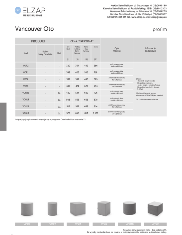 Kraków Salon Meblowy, ul. Surzyckiego 16, (12) 269 81 60 Katowice Salon Meblowy, al. Roździeńskiego 191B, (32) 601 23 33 Warszawa Salon Meblowy, ul. Mineralna 16, (22) 290 62 55 Wrocław Biuro Handlowe, ul. Św. Elżbiety 4, (71) 306 70 77 INFOLINIA: 801 011 220, www.elzap.eu, mail: [email protected] Vancouver Oto PRODUKT Kod CENA / TAPICERKA* Kolor bazy / stelaża Evo Next Medley Softline Sprint Valencia Fame Step Synergy Skóra (I) ( II ) ( III ) ( IV ) Blat Opis modelu VOR2 - - 320 364 449 566 pufa okrągła mała, średnica 410 mm VOR1 - - 348 405 506 718 pufa okrągła duża, średnica 540 mm VOS2 - - 332 382 483 629 pufa kwadratowa mała, 410 x 410 mm VOS1 - - 387 471 628 993 pufa kwadratowa duża, 540 x 540 mm VOR2B - G1 480 524 609 726 stolik okrągły mały, średnica 410 mm VOR1B - G1 508 565 666 878 stolik okrągły duży, średnica 540 mm VOS2B - G1 517 567 668 814 stolik kwadratowy mały, 410 x 410 mm VOS1B - G1 572 656 813 1 178 stolik kwadratowy duży, 540 x 540 mm Informacje dodatkowe Stopki: - standard - stopki twarde (do podłóg miękkich), - opcja - stopki z wkładką filcową (do podłóg twardych) - dopłata 9 zł/kpl. Możliwość łączenia w rzędy elementów VOS i VOSB jako standard. G1 - szkło hartowane mleczne. *więcej opcji tapicerowania znajduje się w programie Creative Edition na stronie 231 VOR1 VOR2 VOS1 VOS2 VOR1B VOS1B Powyższe ceny są cenami netto - bez podatku VAT. Za wyroby niestandardowe nie zawarte w niniejszym cenniku pobierane są dodatkowe opłaty. Kraków Salon Meblowy, ul. Surzyckiego 16, (12) 269 81 60 Katowice Salon Meblowy, al. Roździeńskiego 191B, (32) 601 23 33 Warszawa Salon Meblowy, ul. Mineralna 16, (22) 290 62 55 Wrocław Biuro Handlowe, ul. Św. Elżbiety 4, (71) 306 70 77 INFOLINIA: 801 011 220, www.elzap.eu, mail: [email protected] Dane techniczne VOR1 8,5 450 (430) VOR2 6,0 650 520 6,5 VOS1 13,0 480 510 4,5 650 VOS2 9,0 650 520 11,0 480 0,10 510 7,5 650 m3 480 480 m3 0,21 m3 0,10 m3 VOR2B 10,0 650 520 13,0 650 0,21 10 VOS1B 20,0 480 510 8,5 480 m3 400 400 400 400 VOR1B 15,0 410 10 540 10 ø 410 10 ø 540 410 540 0,21 410 450 (430) 540 450 (430) ø 410 450 (430) ø 540 410 540 Vancouver Oto VOS2B 13,5 650 520 18,0 650 0,10 m3 480 510 12,0 480 0,21 m3 0,10 m3 Kraków Salon Meblowy, ul. Surzyckiego 16, (12) 269 81 60 Katowice Salon Meblowy, al. Roździeńskiego 191B, (32) 601 23 33 Warszawa Salon Meblowy, ul. Mineralna 16, (22) 290 62 55 Wrocław Biuro Handlowe, ul. Św. Elżbiety 4, (71) 306 70 77 INFOLINIA: 801 011 220, www.elzap.eu, mail: [email protected] Vancouver Stoliki PRODUKT Kod S3 SH3 S2 SH2 stelaż S3 stelaż SH3 stelaż S2 stelaż SH2 S3 CENA Laminat wysokociśnieniowy HPL Kolor bazy / stelaża czarny metalik chrom / satyna czarny metalik chrom / satyna czarny metalik chrom / satyna czarny metalik chrom / satyna czarny metalik chrom / satyna czarny metalik chrom / satyna czarny metalik chrom / satyna czarny metalik chrom / satyna SH3 Okleina modyfikowana Szkło hartowane (LW) (HM) (G1) 519 526 614 585 591 701 658 666 767 728 735 889 519 526 614 585 591 701 658 666 767 728 735 889 337 344 432 403 409 519 387 395 496 457 464 618 674 681 769 740 746 856 911 919 1020 981 988 1142 Opis modelu Informacje dodatkowe stolik mały, stelaż z rury o profilu okrągłym, 800 x 460 x 800 mm stolik mały, stelaż z rury o profilu kwadratowym, 800 x 460 x 800 mm stolik średni, stelaż z rury o profilu okrągłym, 1200 x 460 x 800 mm Stopki w stolikach S: - standard - stopki twarde (do podłóg miękkich), - opcja - stopki z wkładką filcową (do podłóg twardych) - dopłata 15 zł/kpl. stolik średni, stelaż z rury o profilu kwadratowym, 1200 x 460 x 800 mm Stopki w stolikach SH: - standard - stopki twarde (do podłóg miękkich), - opcja - stopki z wkładką filcową (do podłóg twardych) - dopłata 12 zł/kpl. stelaż stolika małego wykonany z rury o profilu okrągłym stelaż stolika małego wykonany z rury o profilu kwadratowym Wybarwienia blatów w laminatach HPL (LW): LW01 (biały), LW02 (czarny), LW04 (szary) - termin realizacji 4-6 tygodni. Wybarwienia blatów w okleinach naturalnych modyfikowanych (HM): HM10 (dab bielony), HM11 (dab classic), HM12 (dab cardinal), HM20 (wenge classic), HM30 (teak) - termin realizacji 4-6 tygodni. stelaż stolika średniego wykonany z rury o profilu okrągłym stelaż stolika średniego wykonany z rury o profilu kwadratowym S2 SH2 Powyższe ceny są cenami netto - bez podatku VAT. Za wyroby niestandardowe nie zawarte w niniejszym cenniku pobierane są dodatkowe opłaty. Kraków Salon Meblowy, ul. Surzyckiego 16, (12) 269 81 60 Katowice Salon Meblowy, al. Roździeńskiego 191B, (32) 601 23 33 Warszawa Salon Meblowy, ul. Mineralna 16, (22) 290 62 55 Wrocław Biuro Handlowe, ul. Św. Elżbiety 4, (71) 306 70 77 INFOLINIA: 801 011 220, www.elzap.eu, mail: [email protected] 800 800 1200 800 1200 S2 520 15,0 860 0,40 G1 m3 24,0 19,0 800 1200 800 1200 SH2 860 520 16,0 HM / LW SH3 860 0,40 m3 26,0 1260 520 22,0 37,0 G1 HM / LW 0,60 m3 HM / LW 460 G1 450 800 HM / LW 18 G1 10 800 HM / LW 460 G1 450 800 G1 860 31,0 800 23,5 520 20,0 35,0 22,5 26,5 1260 HM / LW 18 G1 10 25,5 HM / LW 860 G1 HM / LW S3 18,0 HM / LW 18 G1 10 800 Dane techniczne HM / LW 460 G1 450 800 HM / LW 460 G1 450 800 HM / LW 18 G1 10 Vancouver Stoliki 33,0 860 0,60 m3