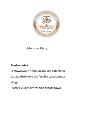 Menu na Diety Poniedziałek Szczawiowa z ziemniakami nie zabielana Gulasz drobiowy ryż fasolka szparagowa Wega Placki z cukini ryż fasolka szparagowa Wtorek Barszcz czerwony niezabielany Pieczony indyk w sosie własnym, kasza gryczana, marchewka z groszkiem Wega Bakłażan faszerowany kaszą i ziołami, marchewka z groszkiem Środa Zupa jarzynowa z koperkiem Sznycelki z kurczaka w panierce bezglutenowej, ziemniaki z koperkiem, buraczki zasmażane Wega Makaron w sosie Neapolitańskim, warzywa na parze Czwartek Krupnik na ryżu Gołąbki po hiszpańsku ,kasza gryczana Wega Gołąbki z ryżem i ziołami, kasza gryczana Piątek Ogórkowa niezabielana Kotlety warzywne, ziemniaki opiekane, surówka kiszonej kapusty Wega JW