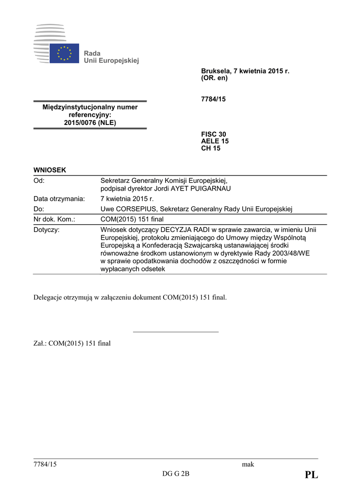 Rada Unii Europejskiej Bruksela, 7 kwietnia 2015 r. (OR. en) 7784/15 Międzyinstytucjonalny numer referencyjny: 2015/0076 (NLE) FISC 30 AELE 15 CH 15 WNIOSEK Od: Sekretarz Generalny Komisji Europejskiej, podpisał dyrektor Jordi AYET PUIGARNAU Data otrzymania: Do: 7 kwietnia 2015 r. Nr dok. Kom.: COM(2015) 151 final Dotyczy: Wniosek dotyczący DECYZJA RADI w sprawie zawarcia, w imieniu Unii Europejskiej, protokołu zmieniającego do Umowy między Wspólnotą Europejską a Konfederacją Szwajcarską ustanawiającej środki równoważne środkom ustanowionym w dyrektywie Rady 2003/48/WE w sprawie opodatkowania dochodów z oszczędności w formie wypłacanych odsetek Uwe CORSEPIUS, Sekretarz Generalny Rady Unii Europejskiej Delegacje otrzymują w załączeniu dokument COM(2015) 151 final. Zał.: COM(2015) 151 final 7784/15 mak DG G 2B PL KOMISJA EUROPEJSKA Bruksela, dnia 7.4.2015 r. COM(2015) 151 final 2015/0076 (NLE) Wniosek DECYZJA RADY w sprawie zawarcia, w imieniu Unii Europejskiej, protokołu zmieniającego do Umowy między Wspólnotą Europejską a Konfederacją Szwajcarską ustanawiającej środki równoważne środkom ustanowionym w dyrektywie Rady 2003/48/WE w sprawie opodatkowania dochodów z oszczędności w formie wypłacanych odsetek PL PL UZASADNIENIE 1. KONTEKST WNIOSKU Po przyjęciu dyrektywy Rady 2003/48/WE, tj. dyrektywy w sprawie oszczędności, oraz w celu zachowania równych warunków działania dla podmiotów gospodarczych UE podpisała umowy ze Szwajcarią, Andorą, Liechtensteinem, Monako i San Marino ustanawiające środki równoważne środkom ustanowionym tą dyrektywą. Państwa członkowskie podpisały również umowy z terytoriami zależnymi Zjednoczonego Królestwa i Niderlandów. Ostatnio dostrzeżono również na szczeblu międzynarodowym, jak duże znaczenie ma automatyczna wymiana informacji jako narzędzie walki z oszustwami podatkowymi i uchylaniem się od opodatkowania w skali transgranicznej dzięki zapewnieniu pełnej przejrzystości podatkowej i współpracy między systemami administracji podatkowej na świecie. Grupa G20 upoważniła Organizację Współpracy Gospodarczej i Rozwoju (OECD) do opracowania jednolitego globalnego standardu w zakresie automatycznej wymiany informacji finansowych. W lipcu 2014 r. Rada OECD ogłosiła globalny standard. W następstwie przyjęcia wniosku dotyczącego aktualizacji dyrektywy w sprawie oszczędności Komisja przyjęła w dniu 17 czerwca 2011 r. zalecenie dotyczące mandatu upoważniającego do rozpoczęcia negocjacji ze Szwajcarią, Liechtensteinem, Andorą, Monako i San Marino w celu dostosowania umów UE z tymi państwami do zmian na szczeblu międzynarodowym i zapewnienia dalszego stosowania przez nie środków równoważnych środkom obowiązującym w UE. W dniu 14 maja 2013 r. Rada osiągnęła porozumienie w sprawie mandatu negocjacyjnego, stwierdzając, że negocjacje mają odzwierciedlać ostatnie zmiany na szczeblu światowym, zgodnie z którymi należy wspierać automatyczną wymianę informacji jako standard międzynarodowy. W swoim komunikacie z dnia 6 grudnia 2012 r. zawierającym plan działania zakładający poprawę skuteczności walki z oszustwami podatkowymi i uchylaniem się od opodatkowania Komisja podkreśliła potrzebę zdecydowanego wspierania automatycznej wymiany informacji jako przyszłego europejskiego i międzynarodowego standardu zwiększającego przejrzystość i wymianę informacji w sprawach podatkowych. W dniu 9 grudnia 2014 r., na podstawie wniosku przedstawionego przez Komisję w czerwcu 2013 r., Rada przyjęła dyrektywę 2014/107/UE zmieniającą dyrektywę 2011/16/UE i rozszerzającą obowiązkową automatyczną wymianę informację między organami podatkowymi UE, tak aby obejmowała ona pełen zakres pozycji finansowych, zgodnie ze standardem międzynarodowym. Zmiana ta zapewnia jednolite, spójne i kompleksowe unijne podejście do kwestii automatycznej wymiany informacji finansowych na rynku wewnętrznym. Jako że dyrektywa 2014/107/UE obejmuje swoim zakresem więcej zagadnień niż dyrektywa 2003/48/WE i przewiduje, że w przypadku pokrywania się zakresu obu dyrektyw pierwszeństwo ma dyrektywa 2014/107/UE, w dniu 18 marca 2015 r. Komisja przyjęła wniosek o uchylenie dyrektywy 2003/48/WE. PL 2 PL Aby zminimalizować koszty i obciążenia administracyjne zarówno dla administracji podatkowych, jak i podmiotów gospodarczych, zasadnicze znaczenie ma zapewnienie, aby zmiana obowiązującej Umowy w sprawie oszczędności ze Szwajcarią była zgodna ze zmianami na szczeblu UE i międzynarodowym. Zwiększy to przejrzystość podatkową w Europie i będzie stanowić podstawę prawną wdrożenia globalnego standardu OECD dotyczącego automatycznej wymiany informacji między Szwajcarią a UE. Ze względu na wymogi konstytucyjne w Szwajcarii dotyczące ratyfikacji, aby Szwajcaria mogła rozpocząć procedurę należytej staranności w styczniu 2017 r. i dokonać pierwszych wymian w ramach globalnego standardu do września 2018 r., protokół zmieniający należy podpisać do maja 2015 r. Dzięki temu wszystkie państwa członkowskie mogłyby w najwcześniejszym możliwym terminie rozpocząć współpracę ze Szwajcarią, do której zobowiązała się ona na szczeblu międzynarodowym. 2. WYNIKI KONSULTACJI Z ZAINTERESOWANYMI STRONAMI ORAZ OCENY SKUTKÓW Protokół zmieniający wdraża globalny standard w relacjach pomiędzy państwami członkowskimi UE i Szwajcarią. W trakcie opracowywania globalnego standardu OECD kilkakrotnie przeprowadzono konsultacje z różnymi zainteresowanymi stronami. Również w trakcie negocjacji między Komisją i Szwajcarią konsultowano się z państwami członkowskimi UE i je odpowiednio informowano. Na posiedzeniach Rady Europejskiej w marcu 2014 r. i grudniu 2014 r. Komisja przedstawiła Radzie stan prowadzonych ze Szwajcarią negocjacji dotyczących oszczędności. Komisja skonsultowała się również z nową grupą ekspertów ds. automatyc