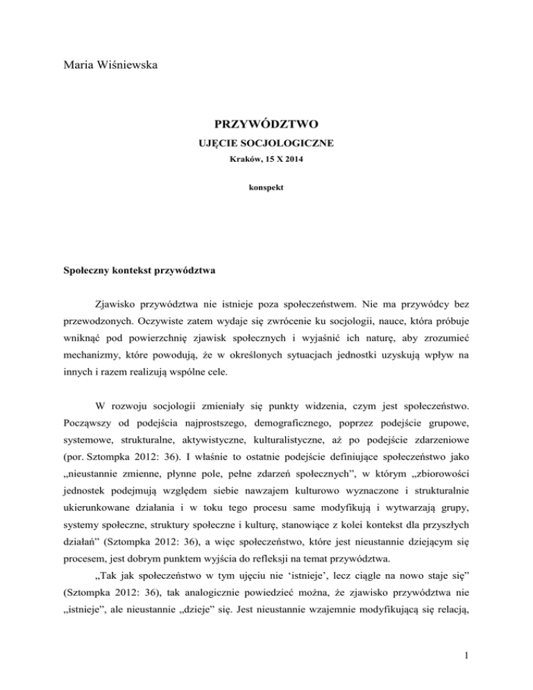 Maria Wiśniewska PRZYWÓDZTWO UJĘCIE SOCJOLOGICZNE Kraków, 15 X 2014 konspekt Społeczny kontekst przywództwa Zjawisko przywództwa nie istnieje poza społeczeństwem. Nie ma przywódcy bez przewodzonych. Oczywiste zatem wydaje się zwrócenie ku socjologii, nauce, która próbuje wniknąć pod powierzchnię zjawisk społecznych i wyjaśnić ich naturę, aby zrozumieć mechanizmy, które powodują, że w określonych sytuacjach jednostki uzyskują wpływ na innych i razem realizują wspólne cele. W rozwoju socjologii zmieniały się punkty widzenia, czym jest społeczeństwo. Począwszy od podejścia najprostszego, demograficznego, poprzez podejście grupowe, systemowe, strukturalne, aktywistyczne, kulturalistyczne, aż po podejście zdarzeniowe (por. Sztompka 2012: 36). I właśnie to ostatnie podejście definiujące społeczeństwo jako „nieustannie zmienne, płynne pole, pełne zdarzeń społecznych”, w którym „zbiorowości jednostek podejmują względem siebie nawzajem kulturowo wyznaczone i strukturalnie ukierunkowane działania i w toku tego procesu same modyfikują i wytwarzają grupy, systemy społeczne, struktury społeczne i kulturę, stanowiące z kolei kontekst dla przyszłych działań” (Sztompka 2012: 36), a więc społeczeństwo, które jest nieustannie dziejącym się procesem, jest dobrym punktem wyjścia do refleksji na temat przywództwa. „Tak jak społeczeństwo w tym ujęciu nie ‘istnieje’, lecz ciągle na nowo staje się” (Sztompka 2012: 36), tak analogicznie powiedzieć można, że zjawisko przywództwa nie „istnieje”, ale nieustannie „dzieje” się. Jest nieustannie wzajemnie modyfikującą się relacją, 1 jaka w określonych warunkach zawiązuje się pomiędzy przywódcą i jego zwolennikami i dzięki temu, poprzez integralnie wpisany w ten proces mechanizm adaptacji do występujących fluktuacji warunków zarówno zewnętrznych, jak i wewnątrz grupy, umożliwia osiąganie zamierzonych celów. Im bardziej rozumiemy, co dzieje się pod powierzchnią zjawiska obserwowanego jako wpływ jednostki na grupę innych dla osiągania wspólnych celów, tym bardziej dostrzegalny jest unikalny charakter takiego procesu. Paradoks przywództwa polega na tym, że ten sam mechanizm wywołuje w każdym przypadku odmienne, niepowtarzalne, a czasem również nie przewidywalne efekty. Historia myśli nad przywództwem Przywództwo (podobnie jak władza) należy do tej grupy terminów, które używane są bardzo często intuicyjnie. Przynależy do dyskursu społecznego, wnikając do myślenia potocznego, w którym rozwija się jego złożony obraz, silnie przepojony ocenami i zaangażowaniem emocjonalnym. Możemy go nazwać „mitem przywództwa”. Pojęcie to przynależy też do dyskursu socjologicznego, występując w rozumowaniu naukowym. Tu przekształca się w złożony konstrukt teoretyczny, będący źródłem hipotez wyjaśniających. Zazwyczaj nazywa się go „teorią przywództwa” (por. Sztompka 2010: 279-280). Wychodząc z definicji pojęcia przywództwa jako procesu, w ramach którego jednostka wywiera wpływ na innych dla osiągnięcia wspólnych celów, zastanówmy się, jak przywództwo jest wykonywane, a nie tylko jak jest pokazywane, a więc jakie są jego źródła, co jest czynnikiem sprawczym w czasie trwania przywództwa oraz kiedy następuje i na czym polega koniec procesu. Przywództwo z perspektywy performatywnej jest nieustannie dziejącym się procesem w wyniku wzajemnych interakcji przywódcy i przewodzonych oraz równocześnie zachodzących interakcji pomiędzy nimi a całym kontekstem społecznym. Przywództwo a władza – posługując się przyjętą definicją przywództwa dostrzec można, że władza jest częścią przywództwa, gdyż jest elementem procesu wpływania; przywódcy używają jej, żeby zmienić działania, postawy, wartości ludzi i osiągnąć zamierzone cele: 2 źródła władzy: - position power – władza formalna, związana z możliwością nagradzania i karania (assigned leadership – przywództwo mianowane); - personal power – władza referencyjna i ekspercka (emerged leadership – przywództwo wyłonione); typy władzy wg Webera (zob. Encyklopedia socjologii 2002): - władza racjonalna – wynika z prawa uznanego przez obie strony stosunku władzy; więź społeczna ma charakter racjonalny i wynika z kompromisu lub zgodności interesów; - władza tradycjonalna – wynika – jak pisał Weber – z „subiektywnego poczucia przynależności” do wspólnoty, w której władza legitymizowana jest przez tradycję, zwyczaj, precedens, moralność; - władza charyzmatyczna – wynika z przekonania o niezwykłych osobistych właściwościach przywódcy, które są źródłem więzi i posłuchu dla niego ze strony zwolenników; przymus jako specyficzny rodzaj władzy – prowadzi do osiągania celów siłą, wbrew woli podwładnych; nie jest więc w kontekście przyjętej definicji procesem przywódczym i nie będzie przedmiotem naszej dzisiejszej refleksji; nauka o przywództwie – jak cała socjologia – jest nową nauką na stary temat; zjawisko przywództwa pojawia się u zarania ludzkości, kiedy w plemionach ujawniał się wódz, który organizował życie grupy i wskazywał kierunki ekspansji; jako przykład – najstarsze dzieło literackie ludzkości, Epos o Gilgameszu, liczący ponad 5 tysięcy lat ukazuje ewolucje Gilgamesza od tyrana do przywódcy sprawiedliwego; ukazuje też archetyp charyzmy i jest w tym sensie eposem o przywództwie. Relacja dominacji, w tym władza od początku była w sferze zainteresowania socjologii. W historii myśli socjologicznej powstały też idee i koncepcje, które wprawdzie bezpośrednio do przywództwa nie nawiązywały, ale dostarczyły nowej perspektywy i narzędzi do jego badania. Już inicjator socjologii jako nauki, a przynajmniej twórca jej nazwy, August Compte (1798-1857) w swojej pozytywistycznej socjologii złożonej ze statyki i dynamiki