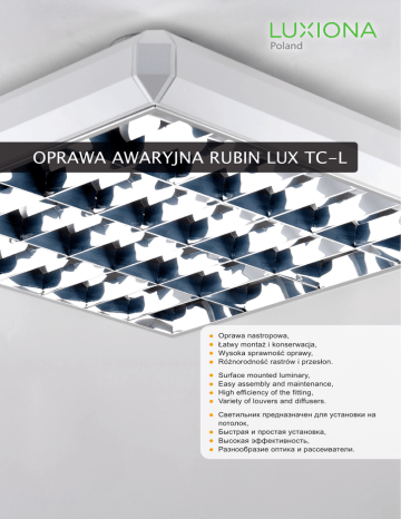 Oprawy awaryjne i ewakuacyjne • Emergency and evacuation luminaires • Аварийное освещение OPRAWA AWARYJNA RUBIN LUX TC-L 7 nastropowa, • Oprawa Łatwy montaż i konserwacja, • Wysoka sprawność oprawy, • Różnorodność rastrów i przesłon. • mounted luminary, • Surface Easy assembly • High efficiency ofandthemaintenance, • Variety of louvers andfitting, diffusers. • Светильник предназначен для установки на • потолок, и простая установка, • Быстрая Высокая эффективность, • Разнообразие oптика и pассеиватели. • 7 .1 Oprawy awaryjne i ewakuacyjne • Emergency and evacuation luminaires • Аварийное освещение OPRAWA AWARYJNA RUBIN LUX TC-L Konstrukcja/Features/Конструкция Oprawa awaryjna nastropowa montowana do sufitów za pomocą kołków rozporowych, na świetlówki kompaktowe TC-L, przeznaczona do oświetlania biur, sal dydaktycznych, pomieszczeń gospodarczych, socjalnych i innych w pracy podstawowej jak i po zaniku napięcia. Kaseton wykonano z blachy stalowej lakierowanej proszkowo. Oprawa dostępna w wersji z rastrem lub przesłoną. Do elementów wyposażenia należą układy stabilizacyjno-zapłonowe wraz z układem własnego zasilania lub pod CB. DANE TECHNICZNE: Napięcie zasilania : 230V 50Hz Klasa ochronności: I Stopień ochrony: IP20 Typ i moc świetlówki: TC-L 18W, 26W, 36W, 40W, 55W Typ baterii: NiCd HT Napięcie baterii: 3,6V, 4,8V, 6V, 8,4V Pojemność baterii: 1,5Ah, 2,5Ah, 4Ah Czas ładowania baterii: 24h Czas pracy awaryjnej: 2/3h Temperatura oprawy: +5°C - +25°C Certyfikat: CE, CNBOP WYKONANIA: ST - STANDARD - testy zadawane są ręcznie AT - AUTOTEST - automatyczne wykonywanie testów CT - CENTRALTEST - praca w systemie centralnego monitorowania, współpraca z centralą monitorującą lub komputerem PC, pełna adresacja opraw, wizualizacja opraw na planie obiektu, raporty o stanie systemu CB - CENTRALNA BATERIA RUBIN LUX TC-L PPAR RUBIN LUX TC-L PLX 7 Rodzaje rastrów: 7 .2 Raster PPAR Raster SLA Polerowany raster o wysokim połysku. Raster szczególnie przydatny w pomieszczeniach, gdzie korzysta się z dużej liczby monitorów komputerowych, takich jak biura projektowania komputerowego CAD, redakcje gazet, biura projektowania danych. Paraboliczne odbłyśniki i parabolicznie ukształtowane płytki poprzeczne zapewniają wysoką sprawność rastra. Rozsył światła uzyskany z tego rastra pozwala na osiągnięcie dużej równomierności. Polerowany raster o wysokim połysku zapewniający dobrą sprawność oprawy. Dzięki temu raster jest szczególnie przydatny w pomieszczeniach dużych i reprezentacyjnych takich jak pomieszczenia użyteczności publicznej, biura, pomieszczenia handlowe i przemysłowe o wysokich wymaganiach dotyczących ograniczenia olśnienia. Odbłyśniki w kształcie litery V i proste poprzeczki z aluminium wytłaczanego zapewniają wysoką sprawność rastra. Rozsył światła uzyskany z tego rastra pozwala na osiągnięcie dużych wartości natężenia oświetlania. RUBIN LUX TC-L PPAR RUBIN TC-L SLA Oprawy awaryjne i ewakuacyjne • Emergency and evacuation luminaires • Аварийное освещение OPRAWA AWARYJNA RUBIN LUX TC-L OPRAWA AWARYJNA RUBIN LUX TC-L Wymiary / Dimensions / Размеры B Ni-Cd H D C A ABHCD (mm)(mm)(mm) (mm) (mm) 2x18W 2x26/36/40/55W 3x26/36/40/55W 4x26/36/40/55W 640 640 640 640 337 337 640 640 87 87 87 87 500 500 500 500 RUBIN LUX TC-L RUBIN LUX TC-L RUBIN LUX TC-L RUBIN LUX TC-L 200 200 500 500 2x18W 2x26/36/40/55W 3x26/36/40/55W 4x26/36/40/55W TC-L TC-L TC-L TC-L 2G11 2G11 2G11 2G11 2/3H 2/3H 2/3H 2/3H 3,50 3,50 5,70 5,70 Tryb pracy: jasny J Tryb pracy: ciemny C Tryb pracy: CB 7 Opcje oprawy/Luminaire options/ Характеристика светильника Przesłony / Diffuser/Рассеиватели: Rastry / Louver/ Оптика (зеркальные решётки): PLX przesłona opalizowana PMMA PMMA opal diffuser / рассеиватель из PMMA опаловый PPAR podwójna parabola double parabolic louver / парабола PLX-T przezroczyste PMMA clear PMMA / рассеиватель из ПММА прозрачный PPARM podwójna parabola mat mat double parabolic louver / парабола матовая PC przesłona opalizowana PC PC opal diffuser / рассеиватель из поликарбоната опаловый PC-T poliwęglan przezroczysty clear policarbonate / рассеиватель из поликарбоната прозрачный PPARM8 podwójna parabola (MIRO8 - materiał matowy o podwyższonej sprawności) double parabolic louver (MIRO8) / парабола (MIRO8) Micro–PRM przesłona mikropryzmatyczna micro-prismatic diffuser / рассеиватель из микропризматического PMMA PRM przesłona pryzmatyczna prismatic diffuser / рассеиватель из призматического поликарбоната PRM-PC przesłona pryzmatyczna PC PC prismatic diffuser / рассеиватель из призматического поликарбоната PC Układ zapłonowy / Control gear / Пускорегулирующая аппаратура: E statecznik elektroniczny electronic control gear / ЭПРА ED statecznik elektroniczny DIM 1-10V DIM 1-10V electronic control gear / ЭПРА DIM 1-10V PPAR-P podwójna parabola + wyklejki PPAR - P - Double Parabolic plus flyleaf / Полная парабола с верхним отражателем PPARM-P podwójna parabola MAT + wyklejki Double Parabolic MAT plus flyleaf / Полная парабола матовая с верхним отражателем LUX SILVER PPAR-P podwójna parabola + wyklejki LUX SILVER LUX SILVER Double Parabolic plus flyleaf / Полная парабола + верхний отражатель типа SILVER LUX SLA raster prosty SLA Louver / з