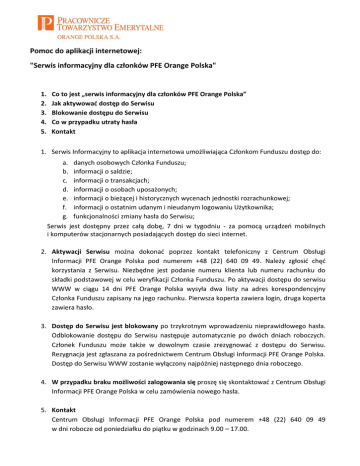 Pomoc do aplikacji internetowej: "Serwis informacyjny dla członków PFE Orange Polska" 1. 2. 3. 4. 5. Co to jest „serwis informacyjny dla członków PFE Orange Polska” Jak aktywować dostęp do Serwisu Blokowanie dostępu do Serwisu Co w przypadku utraty hasła Kontakt 1. Serwis Informacyjny to aplikacja internetowa umożliwiająca Członkom Funduszu dostęp do: a. danych osobowych Członka Funduszu; b. informacji o saldzie; c. informacji o transakcjach; d. informacji o osobach uposażonych; e. informacji o bieżącej i historycznych wycenach jednostki rozrachunkowej; f. informacji o ostatnim udanym i nieudanym logowaniu Użytkownika; g. funkcjonalności zmiany hasła do Serwisu; Serwis jest dostępny przez całą dobę, 7 dni w tygodniu - za pomocą urządzeń mobilnych i komputerów stacjonarnych posiadających dostęp do sieci internet. 2. Aktywacji Serwisu można dokonać poprzez kontakt telefoniczny z Centrum Obsługi Informacji PFE Orange Polska pod numerem +48 (22) 640 09 49. Należy zgłosić chęć korzystania z Serwisu. Niezbędne jest podanie numeru klienta lub numeru rachunku do składki podstawowej w celu weryfikacji Członka Funduszu. Po aktywacji dostępu do serwisu WWW w ciągu 14 dni PFE Orange Polska wysyła dwa listy na adres korespondencyjny Członka Funduszu zapisany na jego rachunku. Pierwsza koperta zawiera login, druga koperta zawiera hasło. 3. Dostęp do Serwisu jest blokowany po trzykrotnym wprowadzeniu nieprawidłowego hasła. Odblokowanie dostępu do Serwisu następuje automatycznie po dwóch dniach roboczych. Członek Funduszu może także w dowolnym czasie zrezygnować z dostępu do Serwisu. Rezygnacja jest zgłaszana za pośrednictwem Centrum Obsługi Informacji PFE Orange Polska. Dostęp do Serwisu WWW zostanie wyłączony najpóźniej następnego dnia roboczego. 4. W przypadku braku możliwości zalogowania się proszę się skontaktować z Centrum Obsługi Informacji PFE Orange Polska w celu zamówienia nowego hasła. 5. Kontakt Centrum Obsługi Informacji PFE Orange Polska pod numerem +48 (22) 640 09 49 w dni robocze od poniedziałku do piątku w godzinach 9.00 – 17.00.