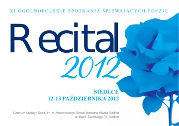 X I O G Ó L N O P O L S K I E S P O T K A N I A Ś P I E WA J Ą C Y C H P O E Z J Ę Recital 2012 SIEDLCE LCE 12-13 PAŹDZIERNIKA 2012 Centrum Kultury i Sztuki im. A. Meżeryckiego Scena Teatralna Miasta a Siedlce ul. Bpa I. Świrskiego 31,, Siedlce Nie rozmawiajmy o polityce braku pieniędzy dolegliwościach wejdźmy w poezję z zamkniętymi oczami zostawmy historię niech przez kilka godzin toczy się sama jest koniec dwudziestego wieku złudne filozofie upadają ludzie odchodzą bez wyjątku a tutaj drganie serca marzenia z orzeźwiającym dotykiem strof i muzyka płynąca jak obłoki naszych snów Eugeniusz Kasjanowicz „Recital” to festiwal szczególny, gdzie co prawda laury są ważne, lecz ważniejsze jest to niezwykłe spotkanie i wspólne, twórców i odbiorców, uchylenie furtki do tajemniczego ogrodu wzruszeń, zamyśleń, emocji i zrozumienia.... „Recital” to festiwal, na którym, dzięki otwartości form muzycznych i interpretacyjnych, ciągle poszerzamy i wzbogacamy obszar „poezji śpiewanej” dodając jej nowych, przystających do współczesności znaczeń. Piosenka poetycka zaś staje się antidotum na hałas, chaos i totalną komercjalizację, a mimo nie rozpieszczania jej wykonawców przez media cieszy się uznaniem i zainteresowaniem tych, którzy pragną wartości głębokich i pięknych … Jest nas wielu... Ś. P. Andrzej Meżerycki Pragniemy kontynuować idee „Recitalu” zawarte w przesłaniu Andrzeja Meżeryckiego. Najważniejszą z nich jest potrzeba obcowania, choć przez chwilę, z tęsknotą za prawdą, wrażliwością, mądrością. Próbujemy dać Państwu chwilę wytchnienia od sztampy, tandety i prostactwa, którymi na co dzień karmieni jesteśmy przez media. Pokażmy, że jesteśmy tą częścią społeczeństwa, które ceni artyzm i dobry klimat sprzyjający refleksji i wzruszeniu. Mariusz Orzełowski Waldemar Koperkiewicz www.ckis.siedlce.pl Pomysł: ANDRZEJ MEŻERYCKI Dyrektor artystyczny festiwalu: WALDEMAR KOPERKIEWICZ XI Ogólnopolskie Spotkania Śpiewających Poezję RECITAL 2012 Projekt znaku, plakatu i statuetki IRENEUSZ PARZYSZEK, PIOTR TOŁWIŃSKI Organizacja i realizacja imprezy: CENTRUM KULTURY I SZTUKI IM. A. MEŻERYCKIEGO SCENA TEATRALNA MIASTA SIEDLCE 12 PAŹDZIERNIKA (piątek) 13 PAŹDZIERNIKA (sobota) godz. 15.30 Przesłuchania konkursowe godz. 19.30 Współorganizacja: DOM PRACY TWÓRCZEJ „REYMONTÓWKA”, DRUKARNIA IWONEX, ING BANK ŚLĄSKI, BANK SPÓŁDZIELCZY, TYGODNIK SIEDLECKI Współpraca organizacyjna: ROBERT PROTASEWICZ, JAROSŁAW SKROBECKI, ANNA KASJANIUK, BOŻENA TUREMKO-TOMKIEL, MARIA MAZURKIEWICZ, ANNA HARKE, TOMASZ JANECZKO Realizacja techniczna: TOMASZ SALACH, MARCIN KOSTYRA, ROBERT NAWACKI, MARCIN SÓJKA, KRZYSZTOF BARABASZ, JAN ŚNITKO, RAFAŁ WAWRYNIUK, RADOSŁAW KOWALCZYK, ZBYSZEK KAMIŃSKI Prowadzenia koncertów: ANDRZEJ PONIEDZIELSKI godz. 19.30 Koncert z okazji jubileuszu 40-lecia pracy twórczej Waldemara Koperkiewicza wystąpią m.in.: ARTUR ŻMIJEWSKI K FELICJAN ANDRZEJCZAK MAREK PIEKARCZYK WOJCIECH ZIELIŃSKI MILENA MADZIAR AKTORZY TEATRU ES KONCERT LAUREATÓW Gwiazdy Festiwalu wystąpią: ELŻBIETA ADAMIAK ANDRZEJ PONIEDZIELSKI LORA SZAFRAN do tej pory O G Ó L N O P O L S K I E S P OT K A N I A Uczestnikami I,II,III,IV,V,VI,VII, VIII i IX OGÓLNOPOLSKICH SPOTKAŃ ŚPIEWAJĄCYCH POEZJĘ RECITAL BYLI: Edyta Łukaszewska, Jarosław Wasik, Iwona Kobylińska, Ewa Tarasiewicz, Krzysztof Żyliński, Przemysław Kazimierski, Magdalena Turowska, Paweł Dampc, Beata Polańska, Adriana Gostkowska, Marta Kowalczuk, Krzysztof Ruciński, Marzena Machura, Agata Budzyńska, Wojciech Szuniewicz, Waldemar Śmiałkowski, Joanna Rutecka, Grzegorz Narowski, Andrzej Ciborski, Katarzyna Szramko, Cecylia Sadowska, Jolanta Gendzel, Szymon Zychowicz, Małgorzata Duk, Tomasz Lewandowski, Violetta Zalewska, Maciej Zenfler, Marek Andrzejewski, Jagoda Naja, Ilona Ostałowska- Olejnik, Katarzyna Borkowska, Wacław Węgrzyn, Nie ma nas, Miłka Malzahn, 4 Pory Roq, Beata Fiedorow, Waldemar Jabłoński, Piotr Woźniak, Wolny wybór, Orkiestra Dni Naszych, Grupa MacJaMa, DNA, Dzień Narodzin, Ewa Szumska, Dagmara Korona- Persowska, Joanna Radecka, Dorota Pruszkowska, Barbara Raduszkiewicz, Jolanta Litwin, Barbara Stępniak, Robert Kasprzycki, Wojtek Straszyński, Dominika Kurdziel, Ewa Głowacka, Robert Mazurkiewicz, Agata Ślazyk, Małgorzata Włodarska, Janusz Onufrowicz, Magdalena Orłowska, Jolka Sip, Jacek Musiatowicz, Tomasz Hapunowicz, Edyta Szewczyk, Marcin Styczeń, Tomek Lewandowski, Katarzyna Kozak, Zdzisława Muzolf, Wojciech Orszulak, Dorota Ślęzak, Monika Parczyńska, Gabriela Lencka, Kamil Wasicki, Justyna Panfilewicz, Dominika Barabas, zespół „Morże być”,Piotr Dąbrówka, Piotr Szauer, Retrospektakl, Marcin Skrzypczak, Marta Andrzejczyk, Bieguni, Lena Lepiarczyk. W PRACACH jury UDZIAŁ WZIĘLI: Elżbieta Wojnowska, Mirosław Czyżykiewicz, Przemysław Gintrowski, Andrzej Głowacki, Piotr Dehr, Zbigniew Piasecki, Leszek Długosz, Tadeusz Woźniak, Tadeusz Śliwiak, Włodzimierz Pawlik, Janusz Strobel, Janusz Tylman, Elżbieta Adamiak, Roman Śliwonik, Tadeusz Górny, Tomasz Kopeć, Waldemar Koperkiewicz, Lech Nowicki, Eugeniusz Kasjanowicz, Jerzy Satanowski, Nikos Chadzinikolau, Teresa Drozda, Janusz Deblessem, Jan Kondrak, Grzegorz Skwarek, Piotr Mikołajczak, Wojciech Gęsicki Ś P I E WA J ĄC YC H P O E Z J Ę R E C I TA L gwiazd WŚRÓD KTÓRE UŚWIETNIŁY POPRZEDNIE EDYCJE RECITALU M.IN. BYLI: Elżbieta Wojnowska, Krystyna Tkacz, Elżbieta Sieradzińska, Przemysław Gintrowski, Mirosław Czyżykiewicz, Roman Kołakowski, Teatr Polski z Bydgoszczy, Jolanta Majchrzak, Tadeusz Woźniak, Leszek Długosz, Antonina Krzysztoń, Elżbieta Adamiak, Andrzej Poniedzielski, Czesław Niemen, Wojciech Młynarski, Jacek Wójcicki, Jan Jakub Należyty, Renata Przemyk, Stanisława Celińska, Artur Barciś, Edyta Geppert, Hanna Banaszak, Jacek Różański, Martyna Jakubowicz, Orkiestra Dni Naszych, Anna Szałapak