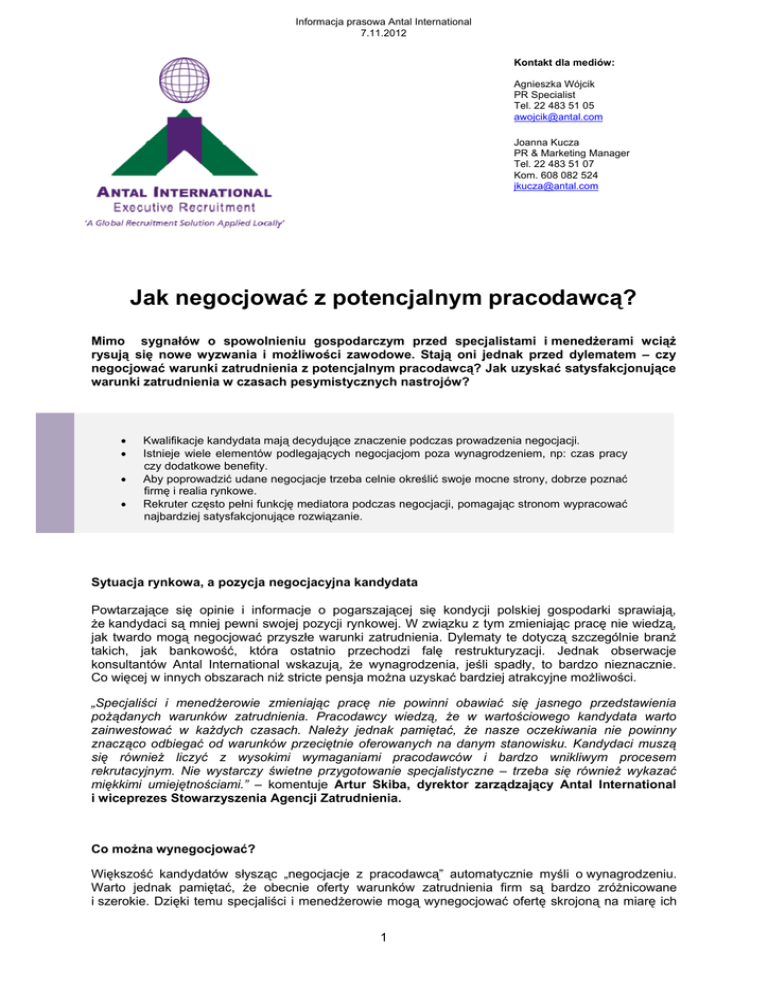 Informacja prasowa Antal International 7.11.2012 Kontakt dla mediów: Agnieszka Wójcik PR Specialist Tel. 22 483 51 05 [email protected] Joanna Kucza PR & Marketing Manager Tel. 22 483 51 07 Kom. 608 082 524 [email protected] Jak negocjować z potencjalnym pracodawcą? Mimo sygnałów o spowolnieniu gospodarczym przed specjalistami i menedżerami wciąż rysują się nowe wyzwania i możliwości zawodowe. Stają oni jednak przed dylematem – czy negocjować warunki zatrudnienia z potencjalnym pracodawcą? Jak uzyskać satysfakcjonujące warunki zatrudnienia w czasach pesymistycznych nastrojów? • • • • Kwalifikacje kandydata mają decydujące znaczenie podczas prowadzenia negocjacji. Istnieje wiele elementów podlegających negocjacjom poza wynagrodzeniem, np: czas pracy czy dodatkowe benefity. Aby poprowadzić udane negocjacje trzeba celnie określić swoje mocne strony, dobrze poznać firmę i realia rynkowe. Rekruter często pełni funkcję mediatora podczas negocjacji, pomagając stronom wypracować najbardziej satysfakcjonujące rozwiązanie. Sytuacja rynkowa, a pozycja negocjacyjna kandydata Powtarzające się opinie i informacje o pogarszającej się kondycji polskiej gospodarki sprawiają, że kandydaci są mniej pewni swojej pozycji rynkowej. W związku z tym zmieniając pracę nie wiedzą, jak twardo mogą negocjować przyszłe warunki zatrudnienia. Dylematy te dotyczą szczególnie branż takich, jak bankowość, która ostatnio przechodzi falę restrukturyzacji. Jednak obserwacje konsultantów Antal International wskazują, że wynagrodzenia, jeśli spadły, to bardzo nieznacznie. Co więcej w innych obszarach niż stricte pensja można uzyskać bardziej atrakcyjne możliwości. „Specjaliści i menedżerowie zmieniając pracę nie powinni obawiać się jasnego przedstawienia pożądanych warunków zatrudnienia. Pracodawcy wiedzą, że w wartościowego kandydata warto zainwestować w każdych czasach. Należy jednak pamiętać, że nasze oczekiwania nie powinny znacząco odbiegać od warunków przeciętnie oferowanych na danym stanowisku. Kandydaci muszą się również liczyć z wysokimi wymaganiami pracodawców i bardzo wnikliwym procesem rekrutacyjnym. Nie wystarczy świetne przygotowanie specjalistyczne – trzeba się również wykazać miękkimi umiejętnościami.” – komentuje Artur Skiba, dyrektor zarządzający Antal International i wiceprezes Stowarzyszenia Agencji Zatrudnienia. Co można wynegocjować? Większość kandydatów słysząc „negocjacje z pracodawcą” automatycznie myśli o wynagrodzeniu. Warto jednak pamiętać, że obecnie oferty warunków zatrudnienia firm są bardzo zróżnicowane i szerokie. Dzięki temu specjaliści i menedżerowie mogą wynegocjować ofertę skrojoną na miarę ich 1 Informacja prasowa Antal International 7.11.2012 potrzeb. Przykładowo firmy są coraz bardziej otwarte na możliwości pracy w systemie home office czy zadaniowy czas pracy. „Ciekawe możliwości niesie za sobą współpraca kontraktowa. W ramach takiej umowy można wynegocjować bardzo atrakcyjne warunki, często nawet na innych zasadach niż te oferowane pracownikom etatowym. Różnice w stawkach sięgają nawet 30-40% wynagrodzenia w skali miesiąca. Ważnym źródłem wiedzy o możliwościach, jakie stwarza taka forma jest profesjonalna firma usługowa zajmująca się dostarczaniem zasobów w ramach IT.” – zauważa Łukasz Kośnik, menedżer Antal IT Services. Elementy podlegające negocjacjom z pracodawcą: 9 9 9 9 9 9 9 9 Wynagrodzenie pieniężne Systemy bonusowe i premiowe Czas pracy Możliwość pracy w systemie home office Pakiet medyczny od wersji podstawowej do rozbudowanej dla całej rodziny Samochód służbowy i zakres jego wykorzystywania w celach prywatnych Dopłaty do szkoleń, studiów Forma umowy (umowa o pracę na czas określony/nieokreślony, współpraca kontraktowa) „W przypadku stanowisk najwyższego szczebla negocjacjom podlegają również budżety do wykorzystania na określonym stanowisku, zakazy konkurencji czy nawet tak szczegółowe wymagania jak marka samochodu służbowego czy konkretna firma oferująca pakiet medyczny.” – dodaje Sebastian Sala, lider zespołu Antal Banking & Insurance. Trzy kroki do osiągnięcia sukcesu w negocjacjach z pracodawcą Aby odnieść sukces w negocjacjach warunków zatrudnienia z potencjalnym pracodawcą trzeba się do nich dobrze przygotować. „Przede wszystkim określmy swoje mocne strony pod kątem korzyści, jakie one mogą przynieść organizacji. Przykład? Jeśli zwiększyliśmy sprzedaż w poprzedniej organizacji o 20% pokażmy, jakie nasze umiejętności to umożliwiły i jak je będzie można wykorzystać w firmie, do której aplikujemy, aby osiągnąć podobny rezultat.” – tłumaczy Sebastian Sala, lider zespołu Antal Banking & Insurance. W drugiej kolejności dowiedzmy się jak najwięcej o firmie i stanowisku, na które aplikujemy. Jaka jest kultura organizacyjna? Jaki będzie dokładny zakres obowiązków? Jakie firma oferuje benefity? Zgromadzona wiedza pozwoli łatwiej doprowadzić do sytuacji idealnej w negocjacjach czyli win-win. Obie strony zyskują to, na czym najbardziej im zależy. Przed rozmową z pracodawcą sprawdźmy również jak kształtują się wynagrodzenia w danej branży i na danych stanowiskach. Pomóc mogą różnorodne raporty płacowe m.in Badanie Wynagrodzeń Antal International. Również profesjonalny rekruter będzie mógł udzielić wielu informacji na ten temat. Należy pamiętać, że podobne stanowiska mogą być zupełnie inaczej wynagradzane w różnych branżach. „W IT cały czas możemy mówić o rynku kandydata. Specjaliści i menedżerowie stawiają wysokie wymagania i pracodawcy są zmuszeni, aby je spełnić w celu pozyskania dobrego pracownika. To już na starcie daje dobrą pozycję negocjacyjną. Jednak i tu trzeba dokładnie sprawdzić, jakie stawki oferuje rynek. Często opłaca się firmie zapłacić 20%-