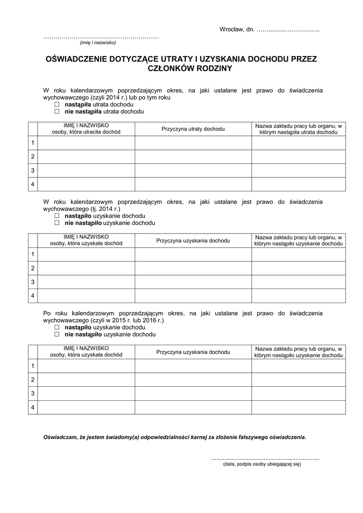 Wrocław, dn. ……..........…………….. ………………………………………………… (imię i nazwisko) OŚWIADCZENIE DOTYCZĄCE UTRATY I UZYSKANIA DOCHODU PRZEZ CZŁONKÓW RODZINY W roku kalendarzowym poprzedzającym okres, na jaki ustalane jest prawo do świadczenia wychowawczego (czyli 2014 r.) lub po tym roku nastąpiła utrata dochodu nie nastąpiła utrata dochodu IMIĘ I NAZWISKO osoby, która utraciła dochód Przyczyna utraty dochodu Nazwa zakładu pracy lub organu, w którym nastąpiła utrata dochodu 1 2 3 4 W roku kalendarzowym poprzedzającym okres, na jaki ustalane jest prawo do świadczenia wychowawczego (tj. 2014 r.) nastąpiło uzyskanie dochodu nie nastąpiło uzyskanie dochodu IMIĘ I NAZWISKO osoby, która uzyskała dochód Przyczyna uzyskania dochodu Nazwa zakładu pracy lub organu, w którym nastąpiło uzyskanie dochodu 1 2 3 4 Po roku kalendarzowym poprzedzającym okres, na jaki ustalane jest prawo do świadczenia wychowawczego (czyli w 2015 r. lub 2016 r.) nastąpiło uzyskanie dochodu nie nastąpiło uzyskanie dochodu IMIĘ I NAZWISKO osoby, która uzyskała dochód Przyczyna uzyskania dochodu Nazwa zakładu pracy lub organu, w którym nastąpiło uzyskanie dochodu 1 2 3 4 Oświadczam, że jestem świadomy(a) odpowiedzialności karnej za złożenie fałszywego oświadczenia. ................................................................ (data, podpis osoby ubiegającej się) OŚWIADCZENIE DOT. POBIERANIA ŚWIADCZEŃ W DZIALE ŚWIADCZEŃ MOPS WE WROCŁAWIU W okresie zasiłkowym/świadczeniowym 2015/2016: pobieram zasiłek rodzinny lub świadczenie z funduszu alimentacyjnego nie pobieram zasiłku rodzinnego ani świadczenia z funduszu alimentacyjnego OŚWIADCZENIE OSOBY SAMOTNIE WYCHOWUJĄCEJ DZIECKO Oświadczam, iż na dzieci, które pozostają na moim utrzymaniu zostało zasądzone świadczenie alimentacyjne nie zostało zasądzone świadczenie alimentacyjne Oświadczam, iż na dzieci, które pozostają na moim utrzymaniu w 2014 r. przekazano dobrowolne świadczenia alimentacyjne nie przekazano dobrowolnych świadczeń alimentacyjnych Kwoty otrzymanych alimentów na rzecz dzieci należy wykazać w załączniku nr 2. Organ, do którego opłacano składki na ubezpieczenie zdrowotne za 2014 r. …………………………………………… Imię i nazwisko …………………………………………… Imię i nazwisko ………………………………….……… Imię i nazwisko ………………………………………… Imię i nazwisko (adres właściwej jednostki) (adres właściwej jednostki) (adres właściwej jednostki) (adres właściwej jednostki) (adres właściwej jednostki) (adres właściwej jednostki) (adres właściwej jednostki) (adres właściwej jednostki) (adres właściwej jednostki) (adres właściwej jednostki) (adres właściwej jednostki) (adres właściwej jednostki) (nazwa i adres właściwej jednostki) (nazwa i adres właściwej jednostki) (nazwa i adres właściwej jednostki) (nazwa i adres właściwej jednostki) Zakład Ubezpieczeń Społecznych Kasa Rolniczego Ubezpieczenia Społecznego Wojskowe Biuro Emerytalne Inne Ja niżej podpisany(a) oświadczam: …………………………………………………………………………………………………………… …………………………………………………………………………………………………………… …………………………………………………………………………………………………………… …………………………………………………………………………………………………………… …………………………………………………………………………………………………………… Pouczenie Zgodnie z art. 233 § 1 kodeksu karnego – Kto, składając zeznanie mające służyć za dowód w postępowaniu sądowym lub w innym postępowaniu prowadzonym na podstawie ustawy, zeznaje nieprawdę lub zataja prawdę, podlega karze pozbawienia wolności do lat 3. Jestem świadomy/a odpowiedzialności karnej za złożenie fałszywego oświadczenia. ……………………………………………….……. Podpis osoby składającej oświadczenie